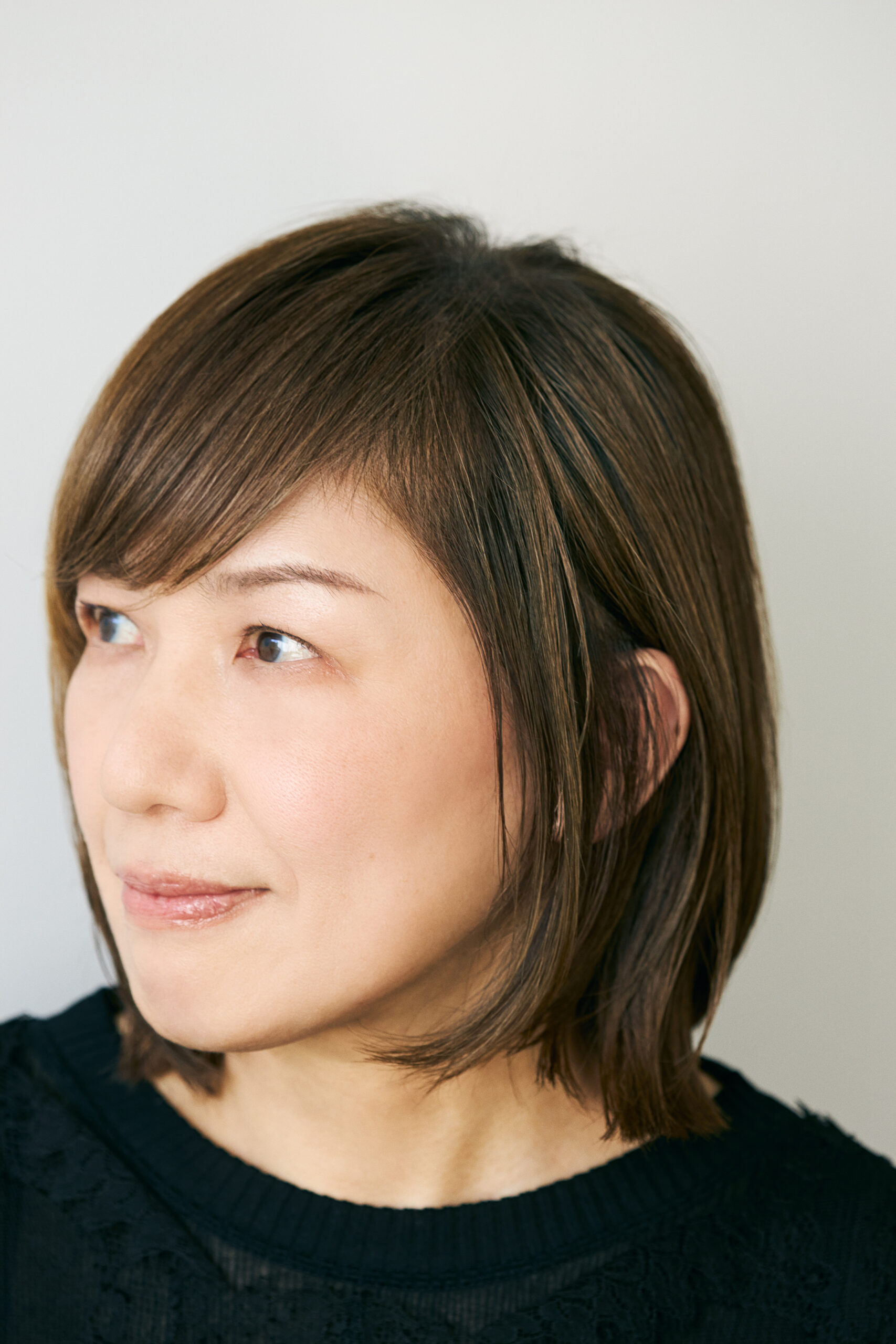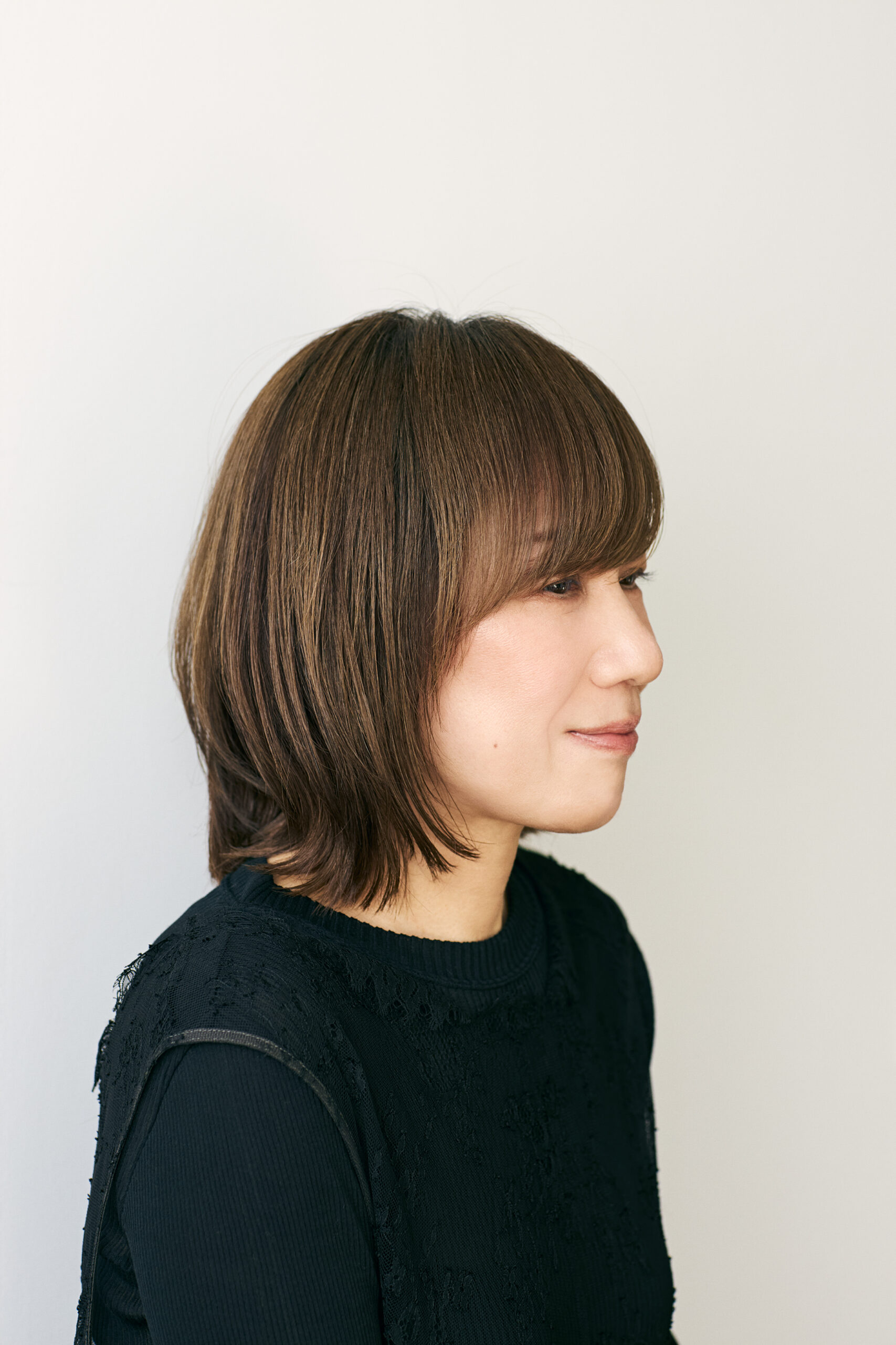 「シンプルなストレートヘアをキープしながらも、若々しさやソフトな印象を引き出すために、前髪をつくってみました。頭の上のほうからヘアが落ちてくる重めのバングスで、髪をまとめたときにもサイドに向かってきれいな毛流れができ、親しみやすい表情を醸し出します」