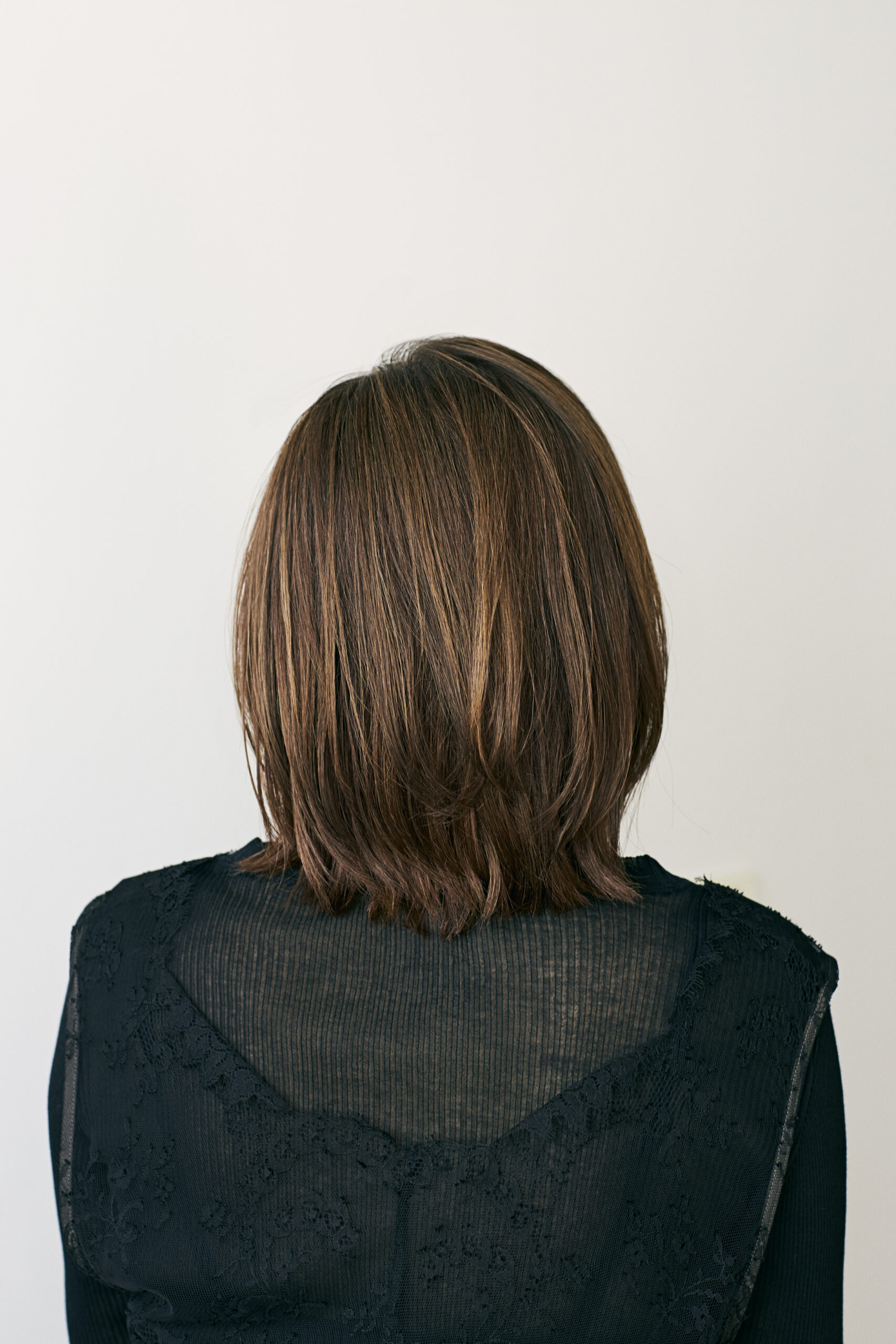 「全体の毛量は調整する必要がないのですが、髪の表面にのみレイヤーを入れました。これはヘアを束ねたときの毛先に不自然なぶつ切り感が出るのを避けて、ふんわりとうまく収まるような設計にするため」
