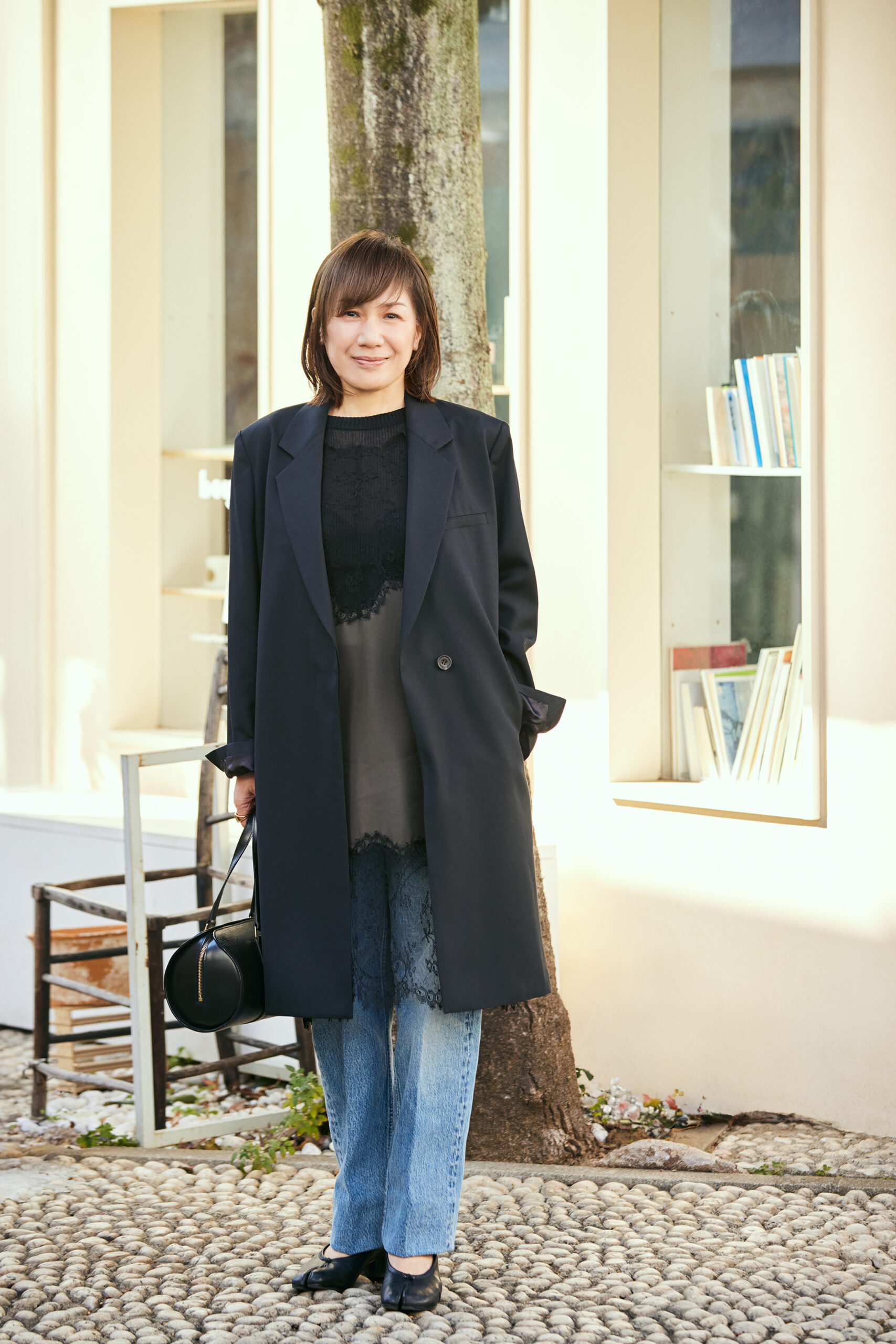 レースのワンピースを主役にしてデニムを合わせ、肩肘張らないシックな普段着コーディネートに。膝のあたりまでストンとまっすぐ落ちるシルエットのジャケットは、羽織るだけで今っぽいこなれ感を連れてきてくれるお気に入りアイテム。ヘアが軽やかにキマりやすくなり、以前よりも色味のある服を着る機会が増えたとか。