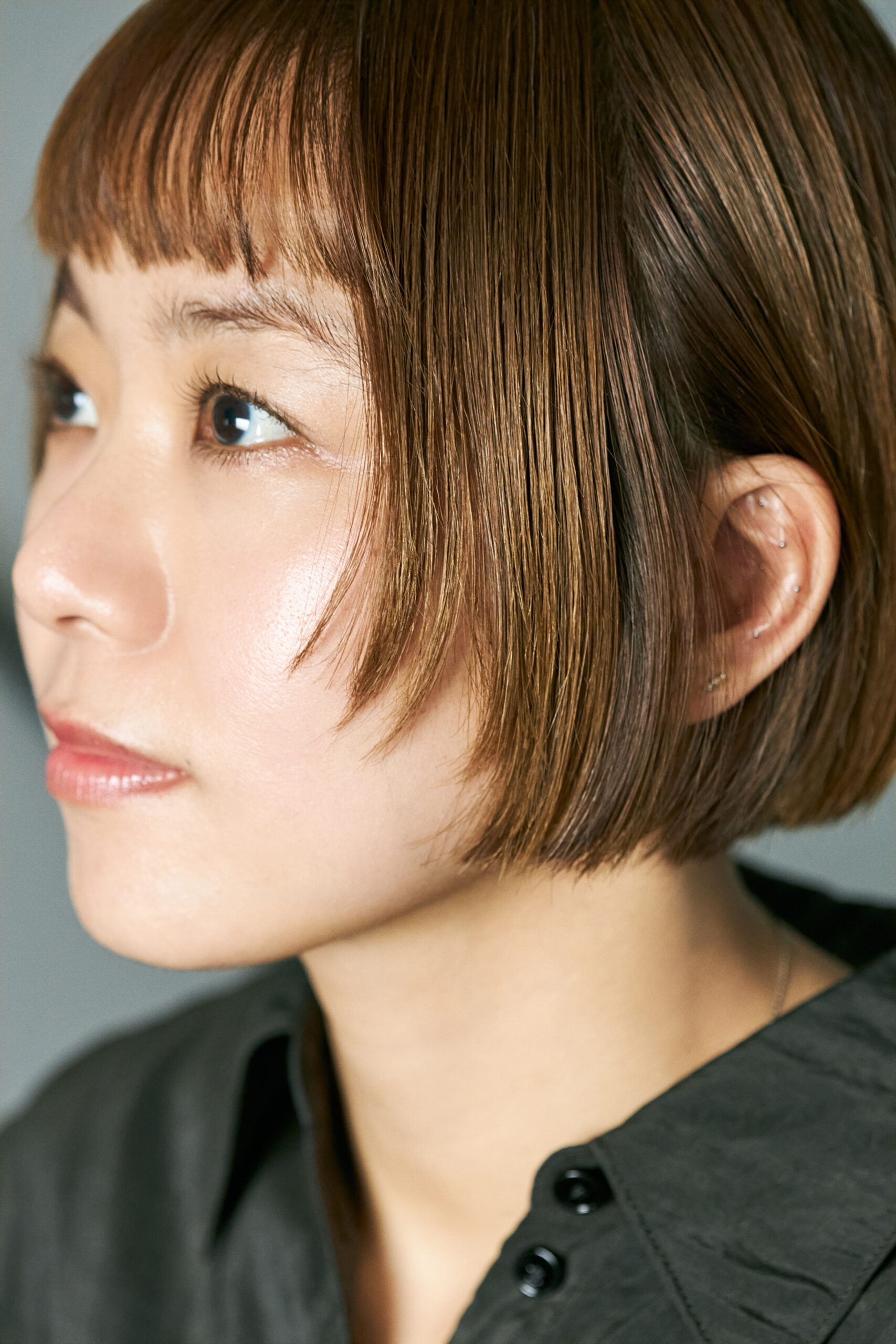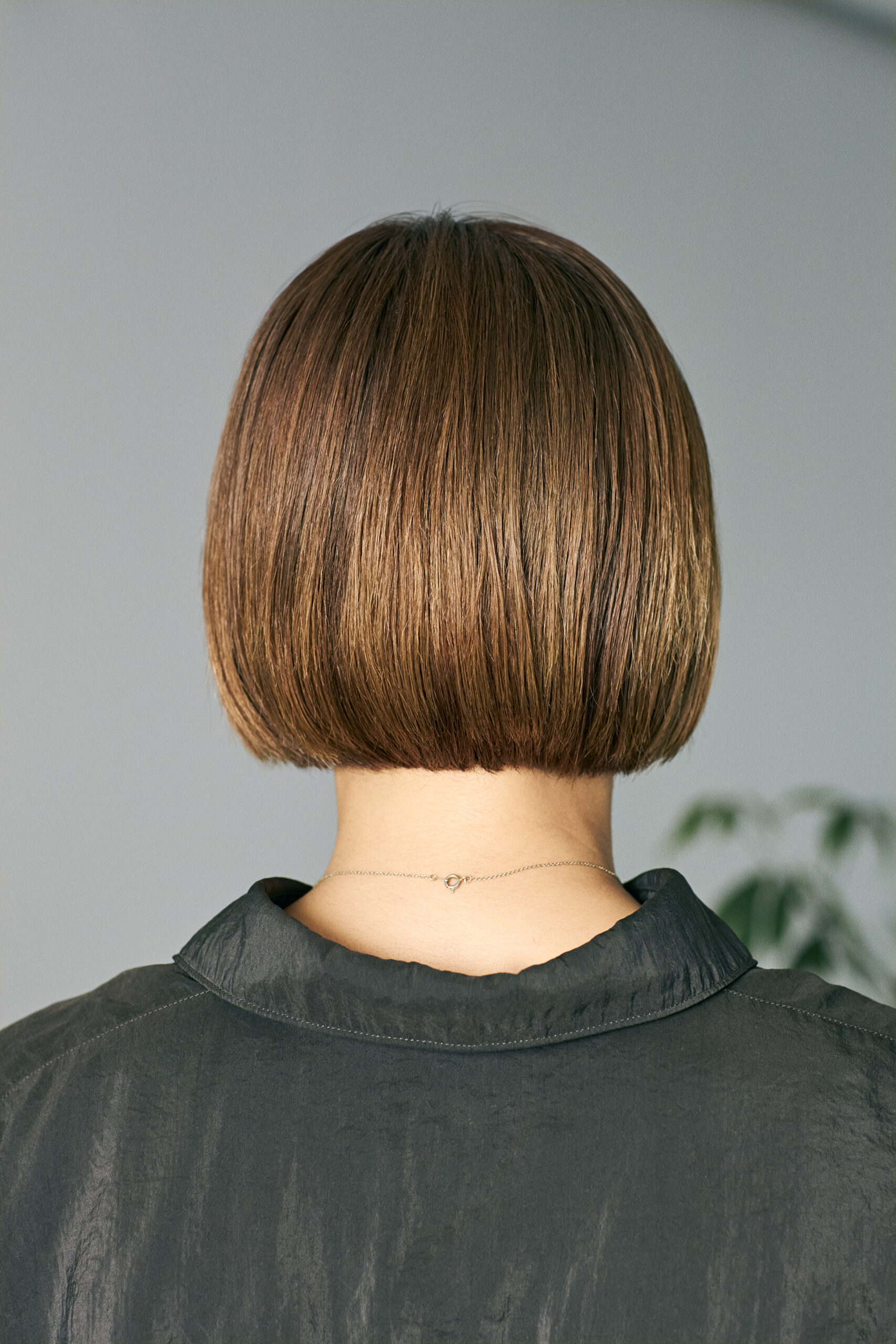 「今回はブリーチをして、ヘアカラーを自然な陰影の感じられるシアーベージュに。褪色するとオレンジやトープっぽく感じられる色味なのですが、本間さんの肌や瞳が持つ寒色寄りのトーンに合わせてアッシュカラーを足し、ほんのりとオリーブっぽいグリーンみも感じる色調へと仕上げています。根元が暗めで毛先は明るめの自然なグラデーションは、ボブのフォルムが持つ立体感を強調するのみならず、髪が伸びてきたときもカラー部分と地毛の境目の違いが気になりにくくなる効果が」
