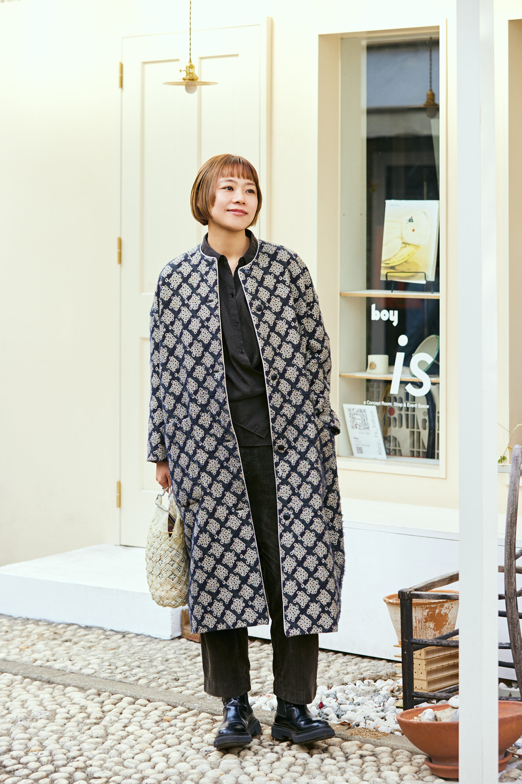カルチャーライクな趣のある服やヴィンテージアイテムをこよなく愛する本間さん。今回は肩が落ちたシルエットがお気に入りのシャツを主役にインナーを黒でまとめ、アウターとバッグで華やかさをプラス。タイトでミニマルなシルエットのボブヘアで、服の放つ個性がさらに輝く。