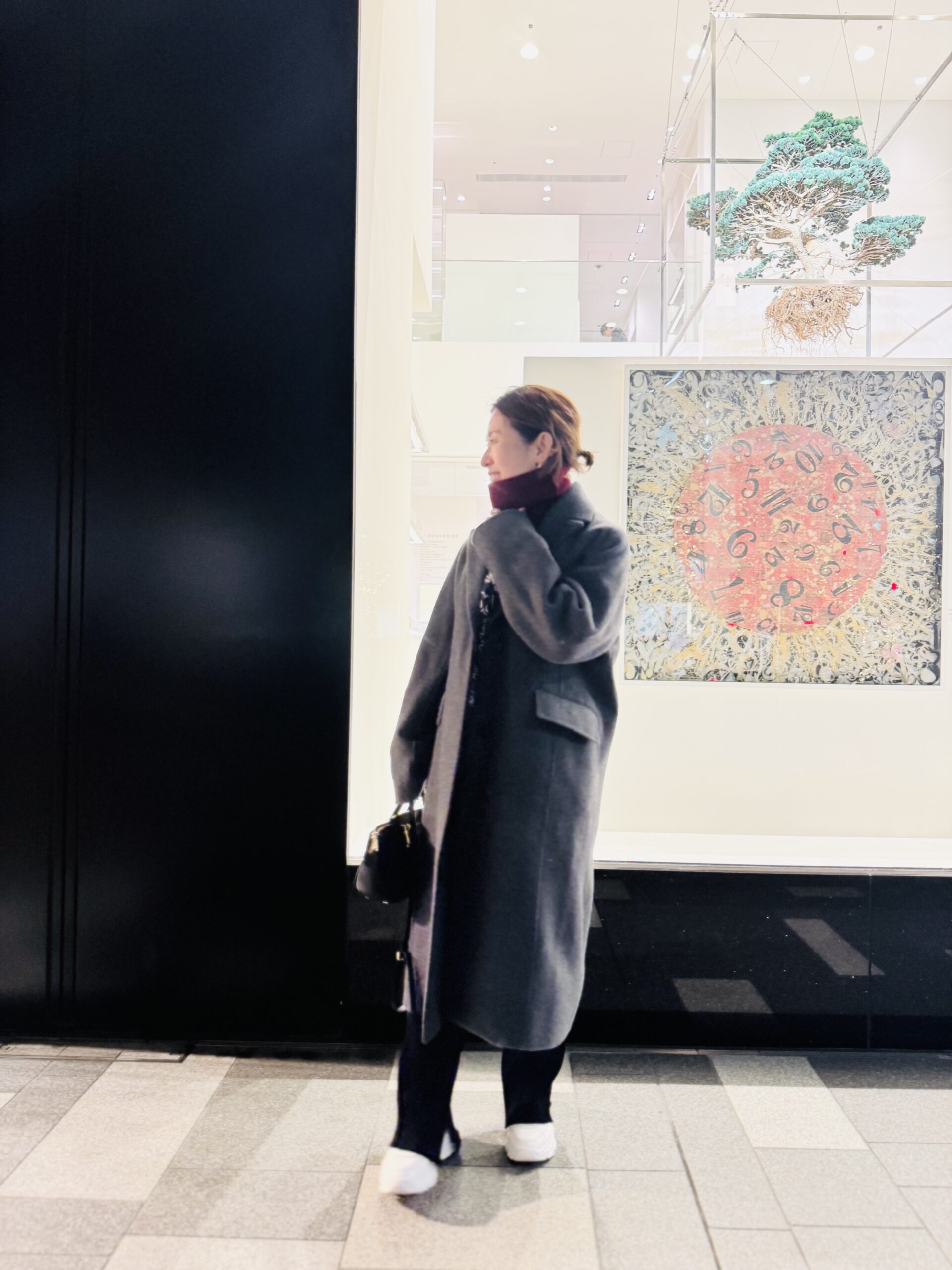 長めのチェスターコート、そして墨赤(このブログにもたくさん登場しています)のニットはカオス。図らずもカオスセットになりました。ニットは、ホリディシーズンだからでもあるし、以前のブログでも書いた通り、完全に今年は「赤の気分」なのでチョイス。黒のコートだと少し強いので、もう少し柔らかでニュートラルなグレーのコートを合わせました。あ、このコート、しっかり長さがあって合わせやすく、しかも軽いんです。毎年買っているカオスのコートですが、今年はこの1枚にしました♡ カジュアルではあるけれど、ホリディシーズン溢れる街にしっくりなじんでいる気がしますがいかがでしょう? そうそう、ニットパンツはお気に入りのプロタゴニスタ。暖かいし脚長効果は高いし、2色もっています(笑)。