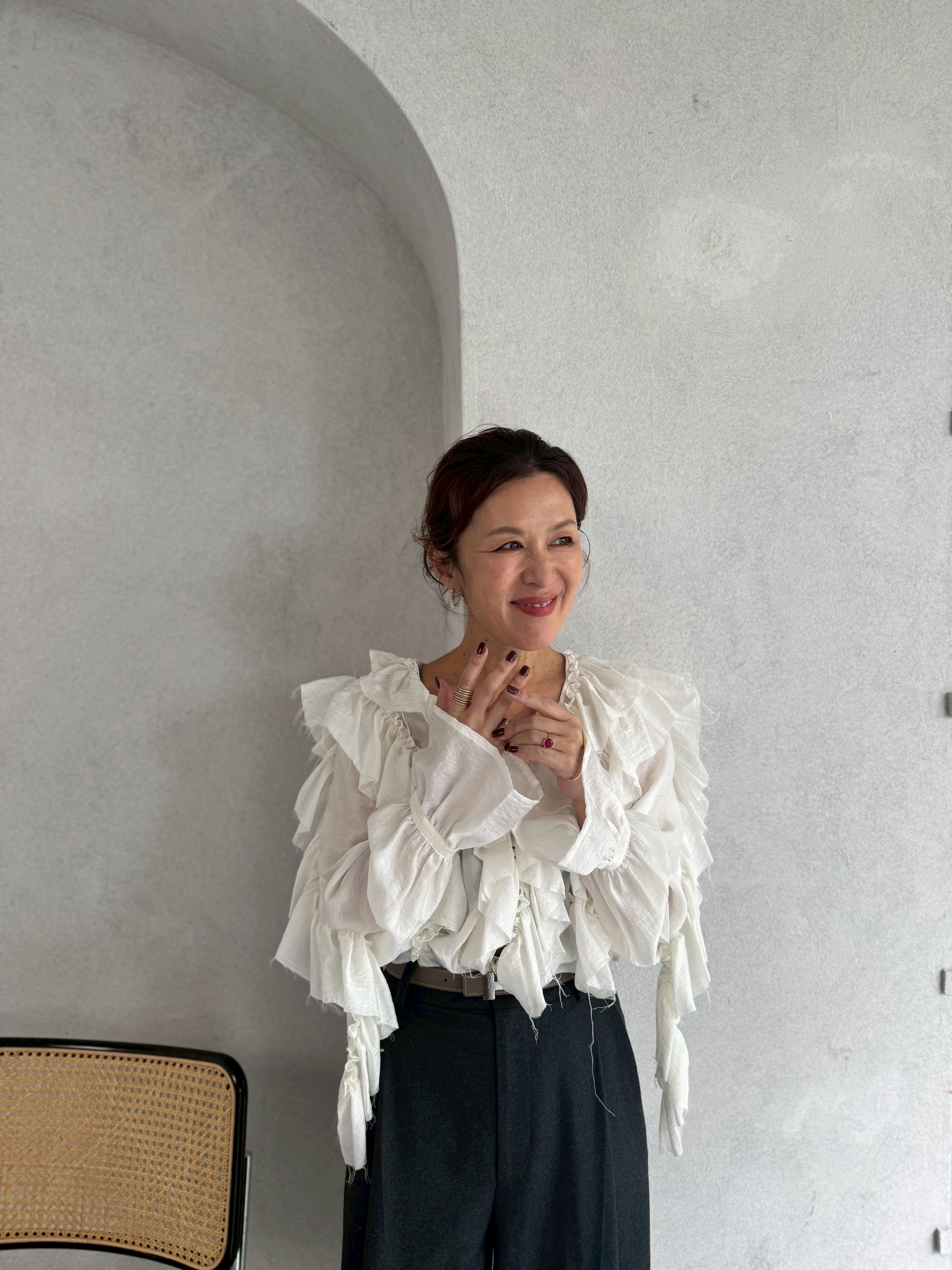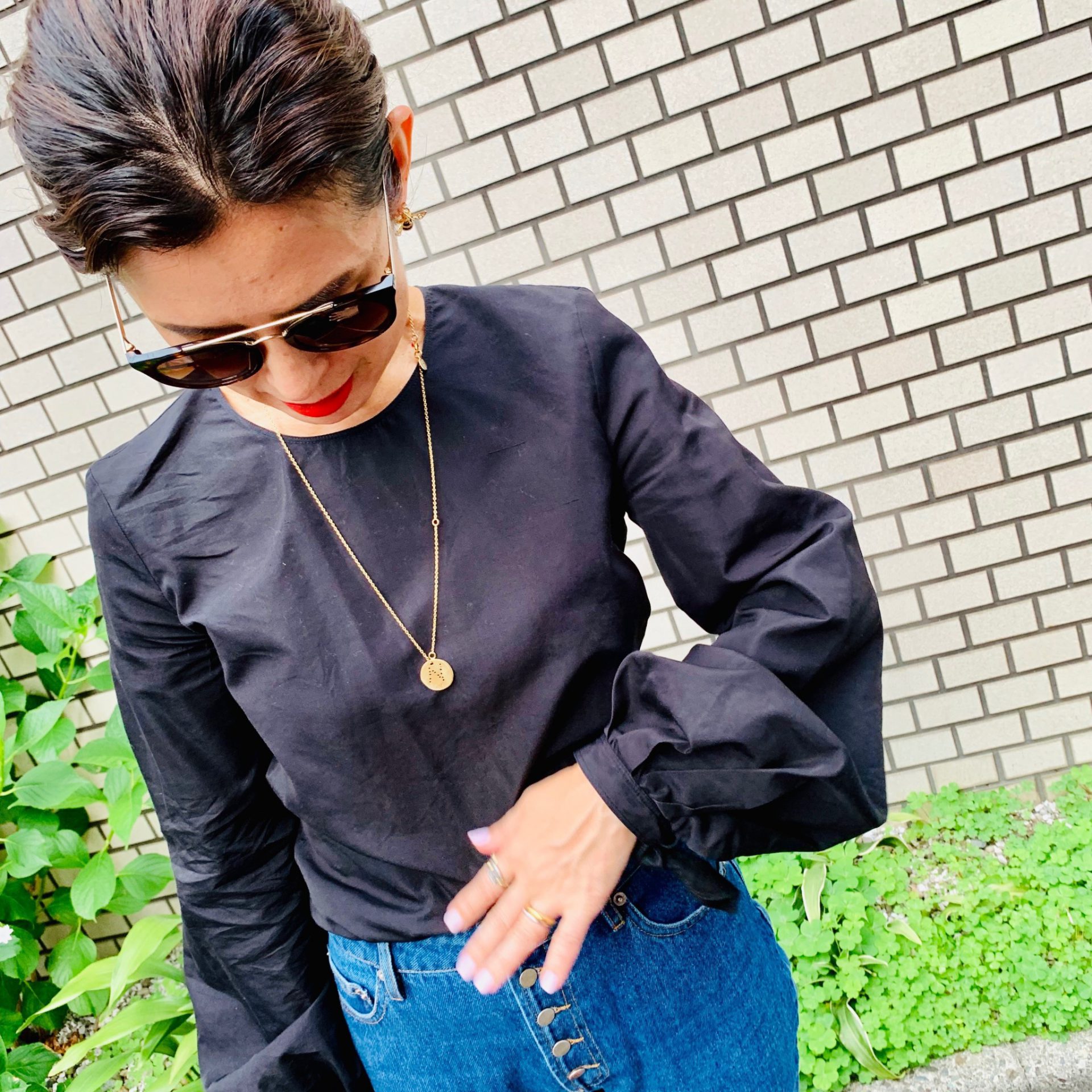 最後、やっと長袖だ(笑)。5年くらい前に買った、サンローランのブラウスに、イエナで買ったルージュのデニムを。デニムのフロントボタンと合わせて、先日買った、シーズンスタイルラボのゴールドのネックレスを。サングラスはプラダです。