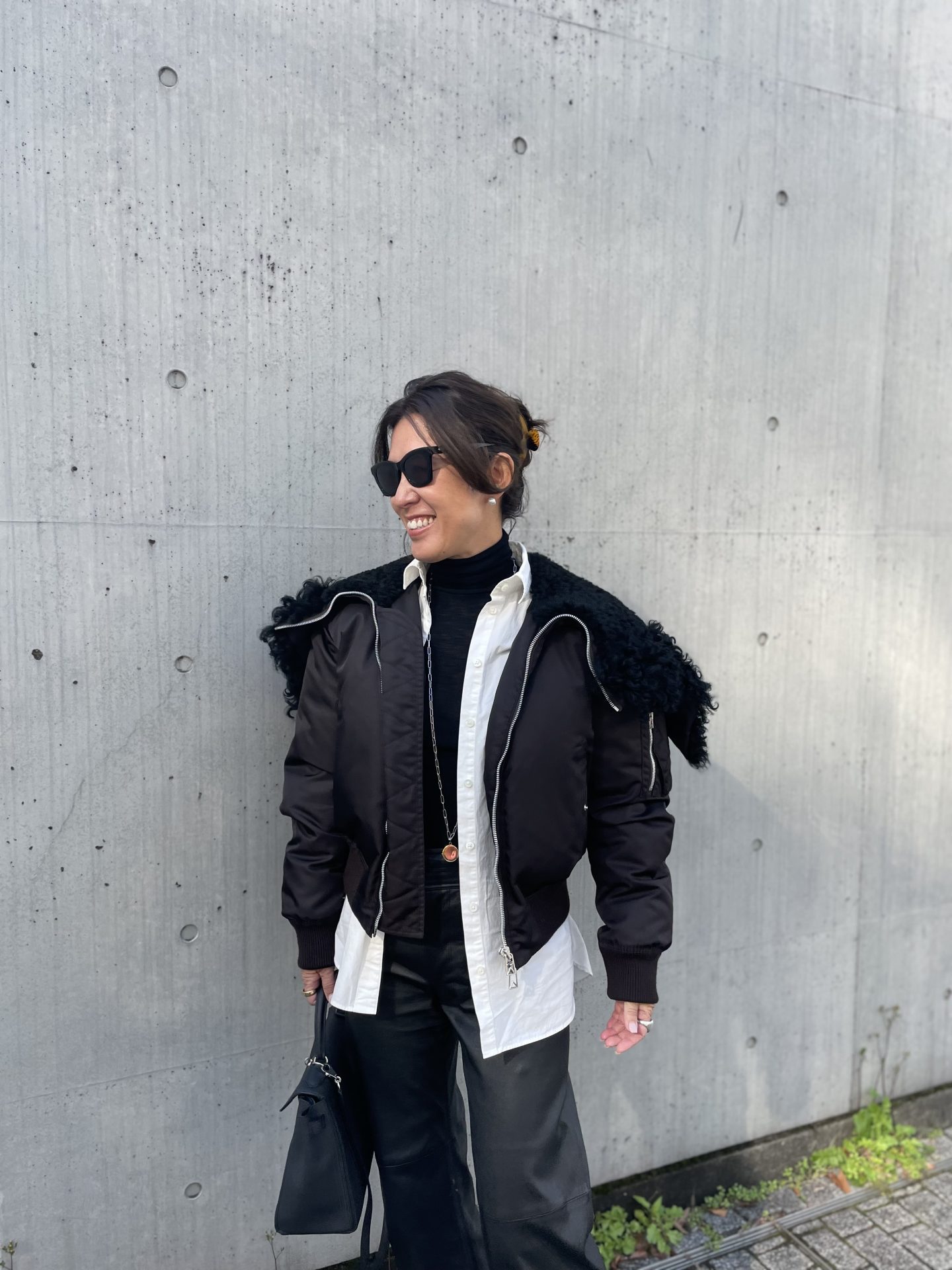 先日は、こんな感じで、パンツ、カットソー、靴、バッグ、ダウンジャケットに至るまで黒! レザー、ナイロン、スウェード、ウール……と素材を違えて表情を出していますが、「黒一色」だと重いよね~、圧が強いよね~と、白のコットンをプラスしました。インナーに、ただいま発売中のAMARCのオリジナルタートルカットソーを入れて、マディソンブルーのマダムシャツをジャケット風に。このカリッとした白があることで、黒一色のコーディネートが軽やかになるから不思議♡♡もちろん耳元や襟元のパールでも、ちらっとのぞくTシャツでも。手持ちの白で、黒に光と明るさを生かすことが大事です。