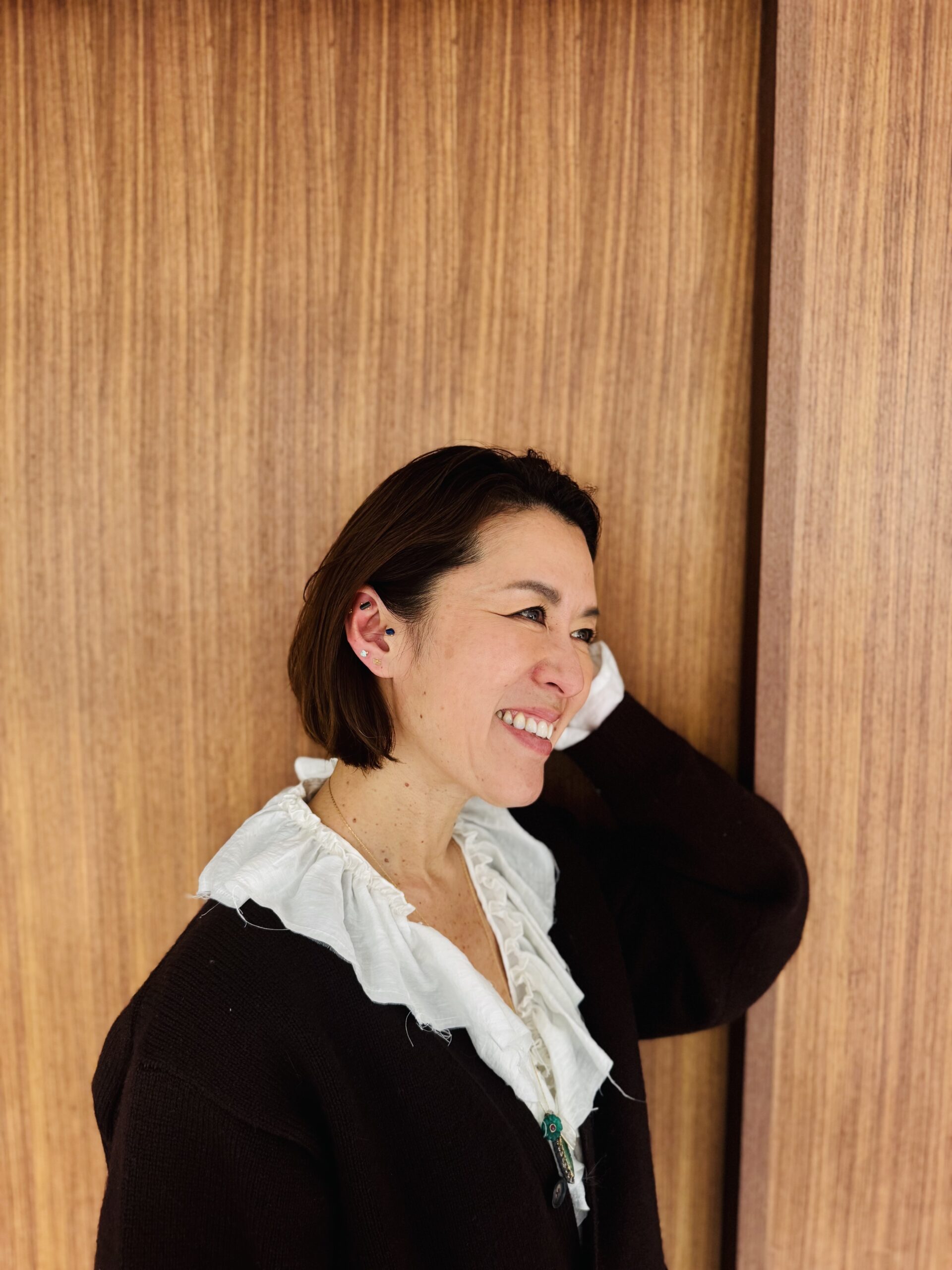 今、雑誌『エクラ』のリースに廻っているのですが、レースやフリルなど、「甘ブラウス」が超豊作です、今年。顔周りを華やかに見せてくれるし、しかも、何より自分の気持ちが上がる! 使わない手はありません。冬の寒さも終わりが見え、暦の上では、完全に春。早速、私も、シーニュのレースブラウスを真冬も着ていたブラウンのニットに合わせてみました。