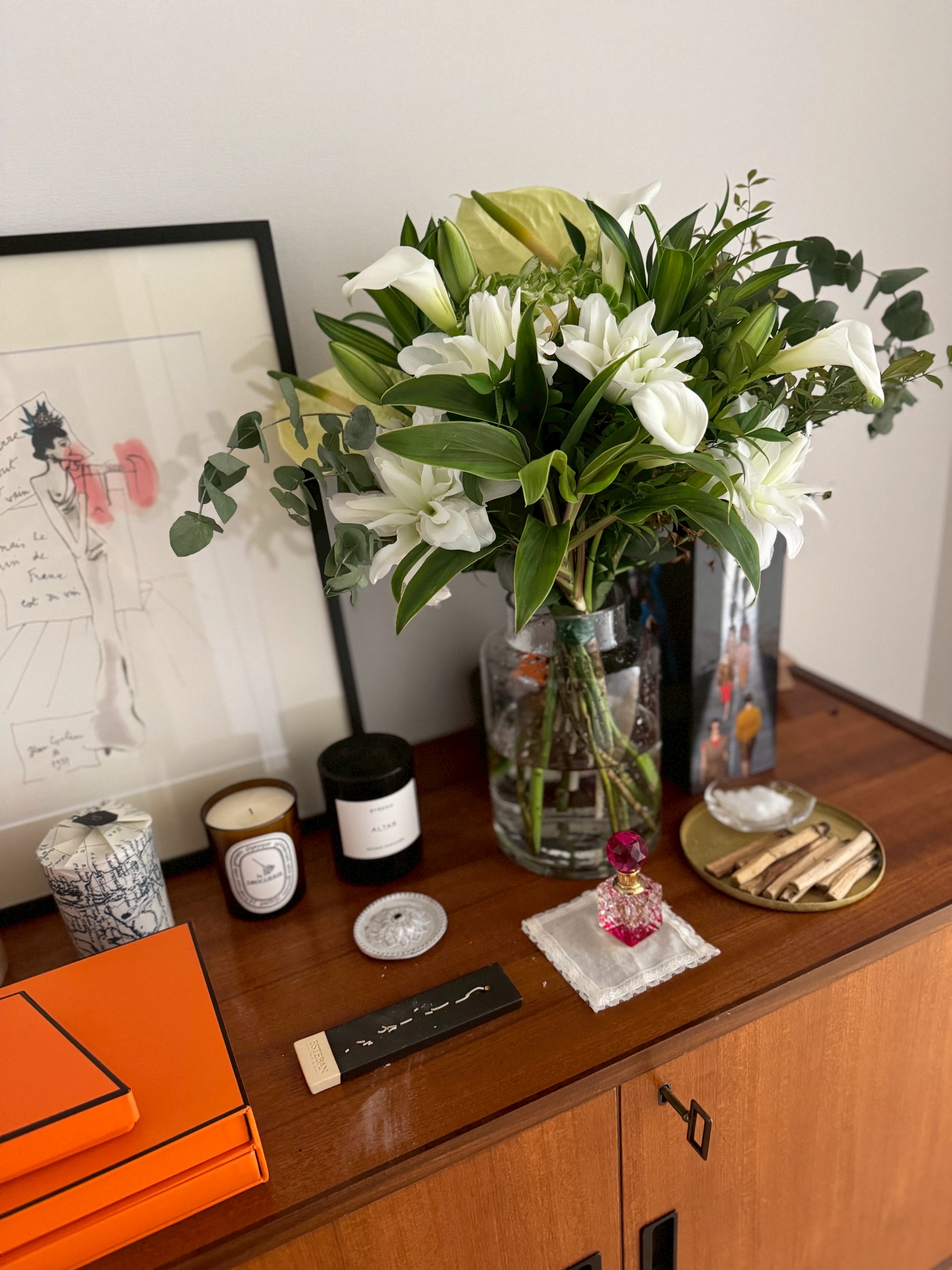 ありがたいことに、お誕生日のお祝いディナーが続いておりまして。毎日おいしいものを食べ、素晴らしいお酒を頂いています。そんな楽しい夜を全力で楽しんだ次の日、ヘトヘトの朝でも(笑)、玄関と寝室だけは整えるようにしています。逆に、これができていない時は、「マジ、やばい時」。玄関は気の入り口。いつでもこぎれいにしておくようにしています。棚はさっとから拭きして、そして、玄関、廊下はダイソンの充電式掃除機でバキューム。花の水を替えて、白檀のお香を立てる。その間、パニータ部長は私の寝室で休んでもらっていて、玄関、リビング、できうる限りの窓を開けます。今住んでいる場所はマンションなので、網戸がない。猫が外に出てしまわないように、基本は窓を閉め切っているので、朝の30分くらいで、前日の空気を入れ替えるのです。こんなひと手間、大体賞味6分で準備ができる。マスカラと口紅を塗る時間を節約して(笑)、この数分に充てたりしています。