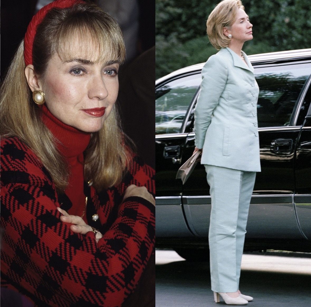 これは、夫のビル=クリントンが大統領選に出馬する時のヒラリー=クリントンの「外見戦略」とそっくり。メガネをコンタクトに替えたのはもちろん、大きなチェックのジャケットに赤のヘッドバンド、といういわゆる保守的でクラシックな田舎の富裕層ファッションを、髪を短くし寒色のセットアップに替え、信頼性と知性、冷静さをアピールしました。日本人のメイクアップアーティスト、吉川康雄さんがブレーンの1人だった、というのは有名な話。