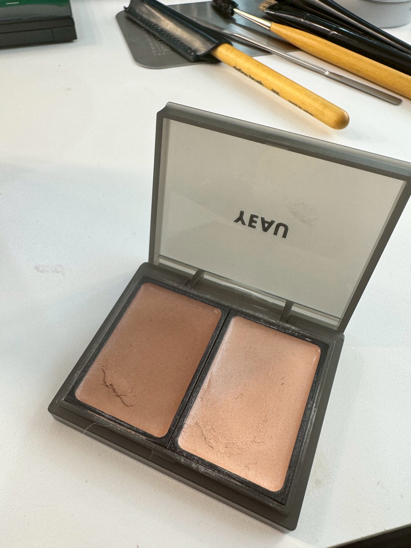 先日、ヘアメイクアップアーティストの川村友子ちゃんにメイクをしていただきました。私の日焼け肌を、いつも自然に素敵に仕上げてくれる凄腕で、ナチュラルで少し凛々しい、彼女のメイクがとても好きです。この前使ってくれたのが、この、「YEAU(ヨウ)」のハイライト&チーク。きっと、耳慣れないブランド名ですよね。私も初めて知りました。