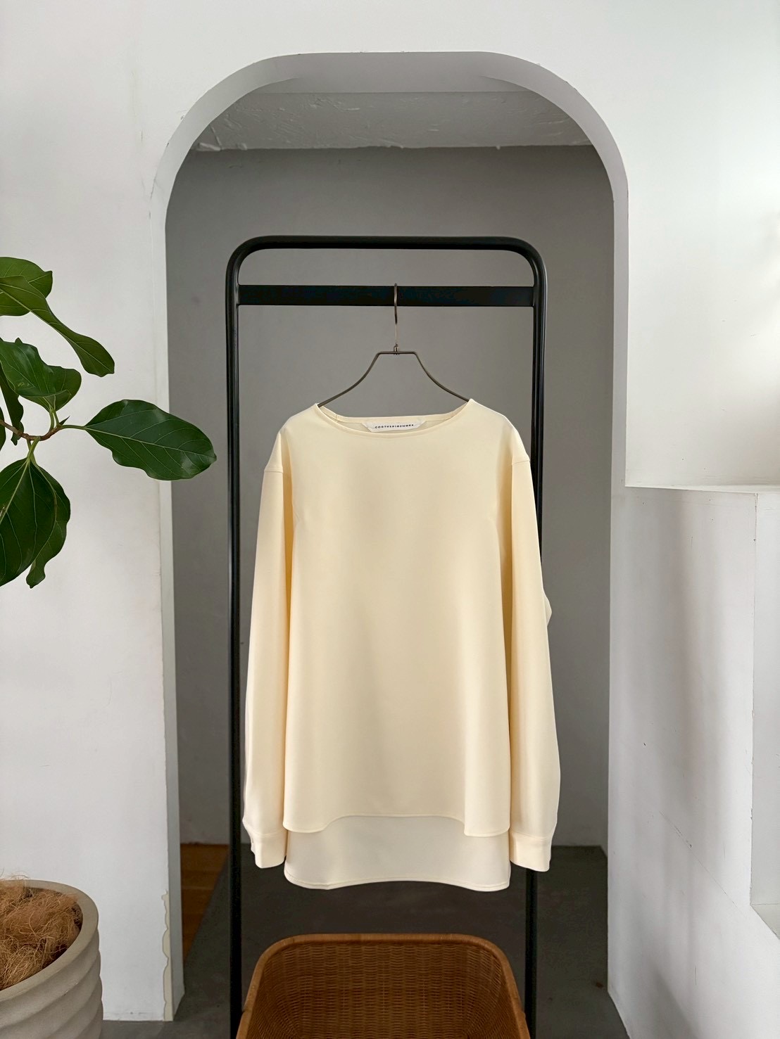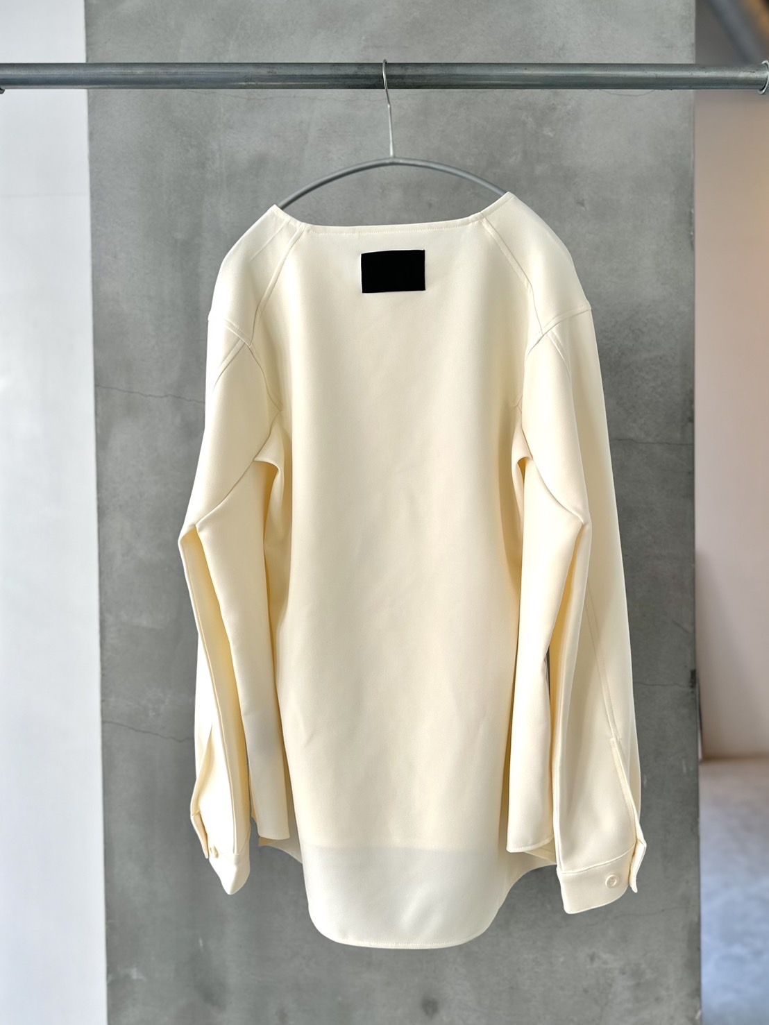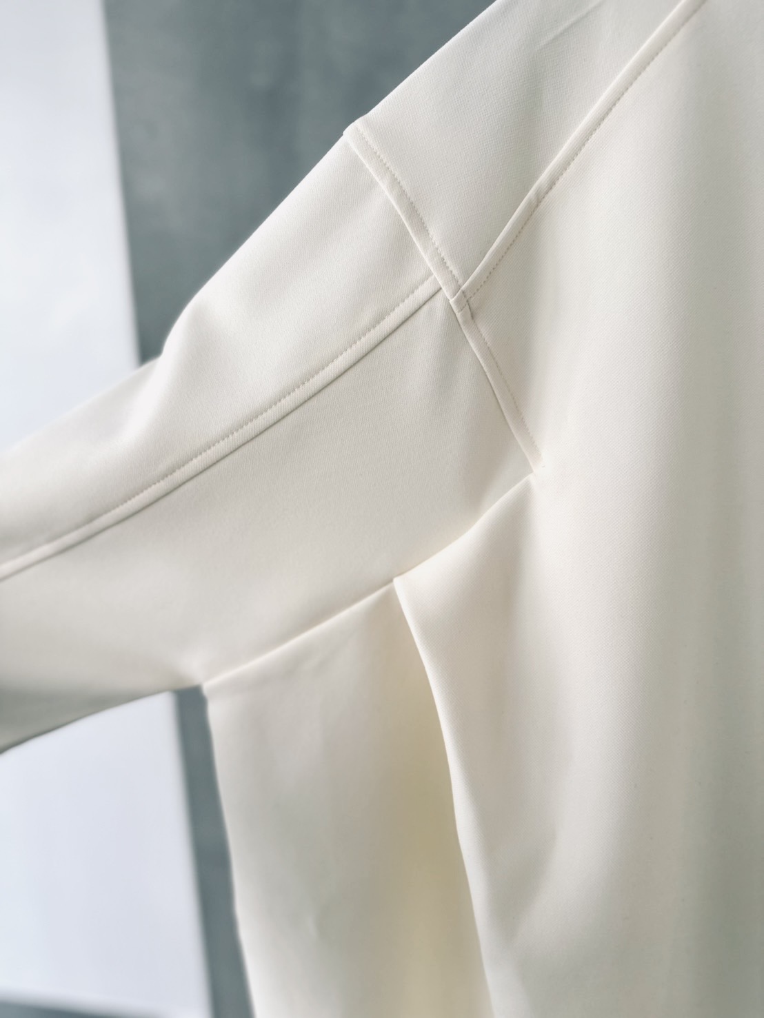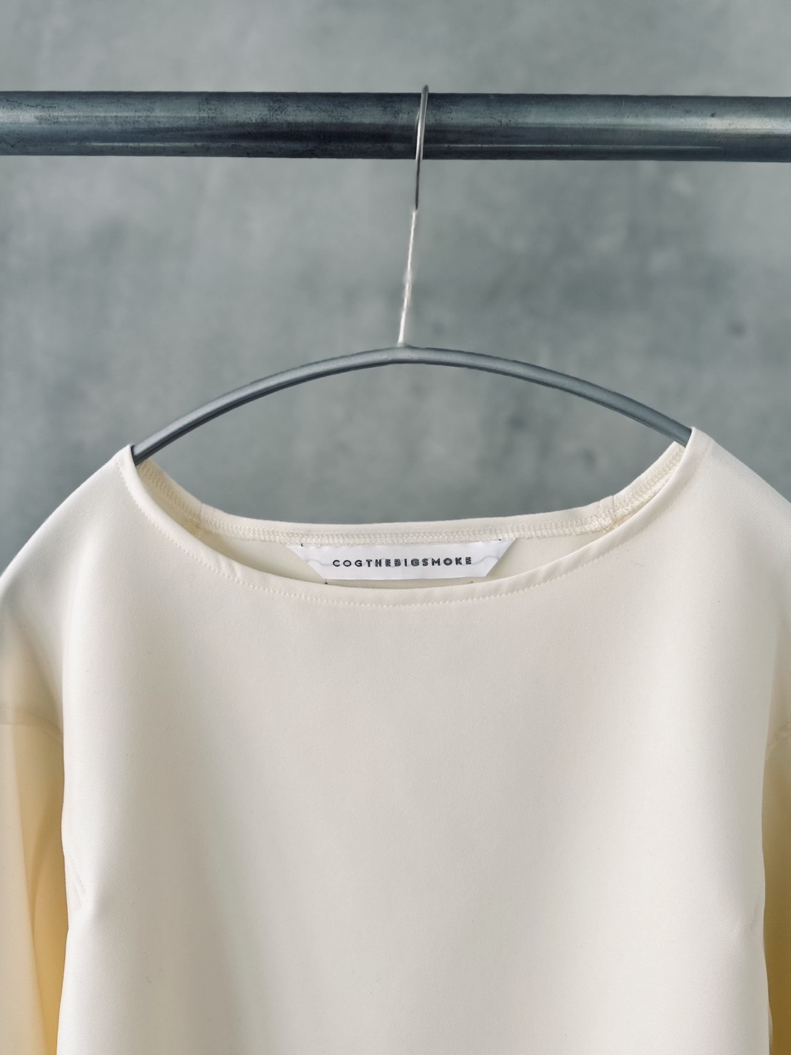 これは買い付けの1枚。「COGTHEBIGSMOKE」というブランド。実はこのトップスも、佳代子さんにスタイリングさせて頂きました。とろみがあって優しいのに、モード。というのは、後ろ姿に秘密が。直線的な切り替えと、ブラックタグ。大人の丸みを帯びたボディラインの、サイド、バック共にシャープに見せてくれるのですが、前から見るとシャープ。すごい1枚です(笑)。