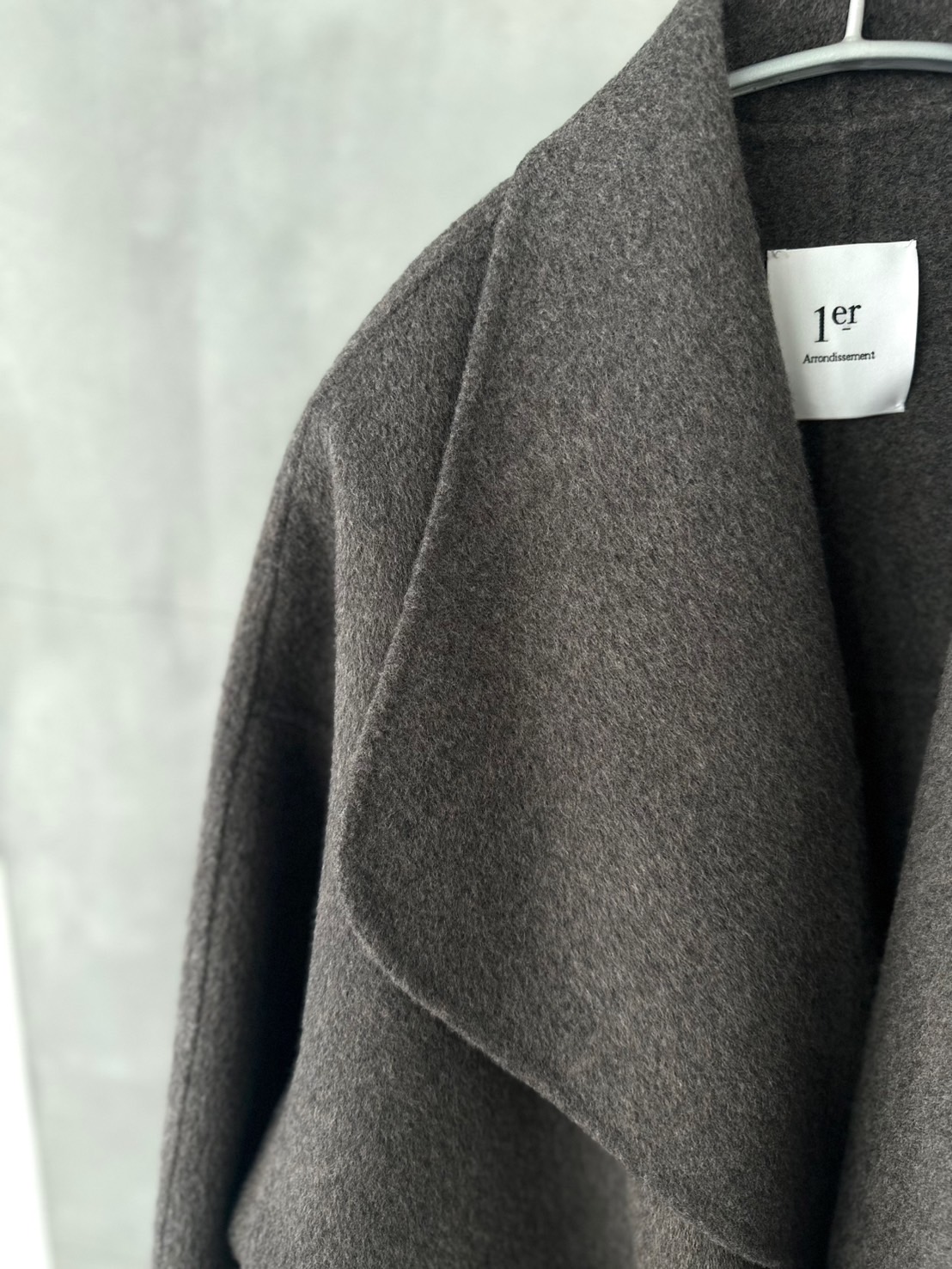 大きな襟が、表情を生き生きと柔らかく見せてくれる1枚。さらに、この絶妙な色が、今年着たいブラウンとも合わせやすい! ダブルフェイスで軽くてしなやかなのも◎。バランス的に、このくらいの、ふわっとしたミドル丈が、今のボトムスに合わせやすいのも重要です。ご一緒させて頂いた、動画ディレクターも買っていました(たぶん、20代)。