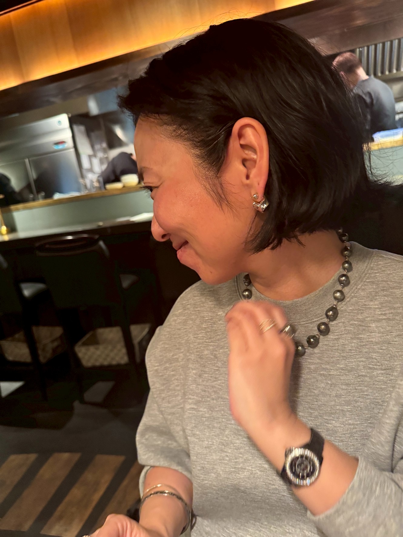 私は少し大きめにしたのですが、実は、小さなほうを、ミモレの川良咲子編集長へプレゼント。というのも、私の誕生日ギフトに素敵な素敵なお皿を頂いたのに、私はお返しできていなくて。ディナーの時に渡したら、とっても喜んでくれました。黒髪ボブ、にシルバーがキラリ。とっても似合っていました。そうそう、マリア・ブラック、新宿伊勢丹の1階にもコーナーがオープンしたそうで、マリアさんも、とても嬉しそうでしたよ♡