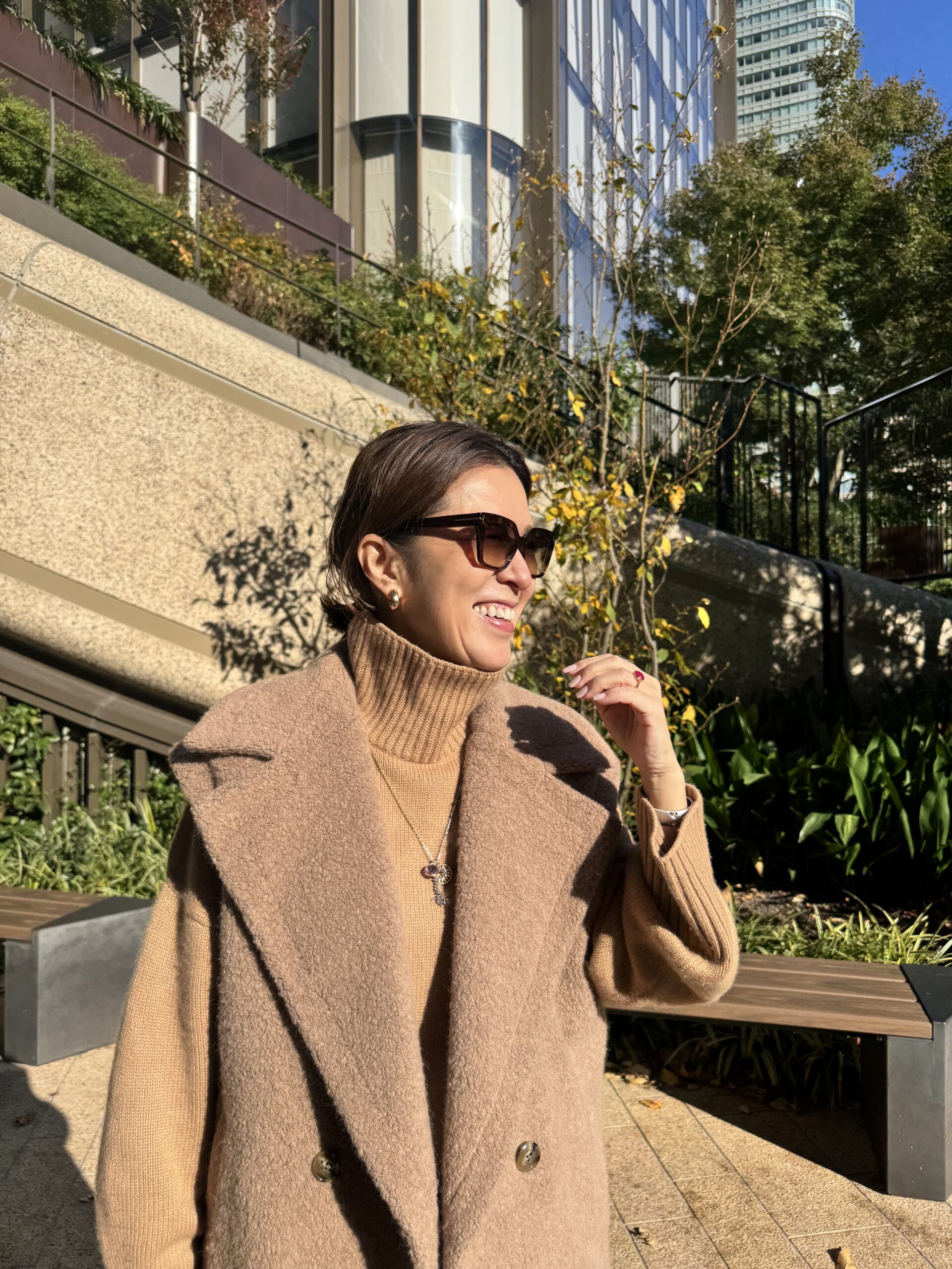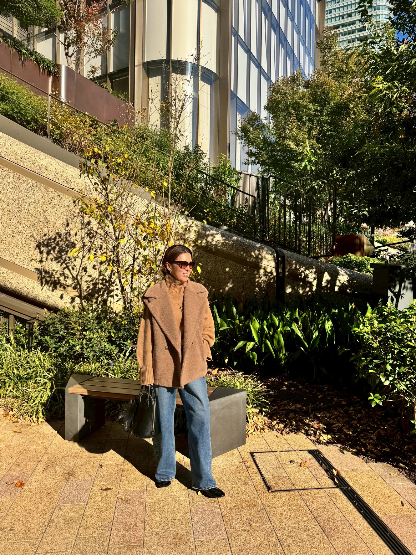 この子、本当に優秀なんです。薄くて軽いのに、とっても暖かい。モコモコ感が薄いから、カジュアルが過ぎず、様々な場面で使える。襟が大きくて顔周りをすっきり、そしてほのかに甘く見せてくれる。というわけで、まずはポップアップの準備で動き回らなくてはいけない日、黒のウールタートルカットソーにプロタゴニスタのニットパンツに合わせて。あ、ライトだから、その上にアレキサンダー・マックイーンのPコートも重ねられました。