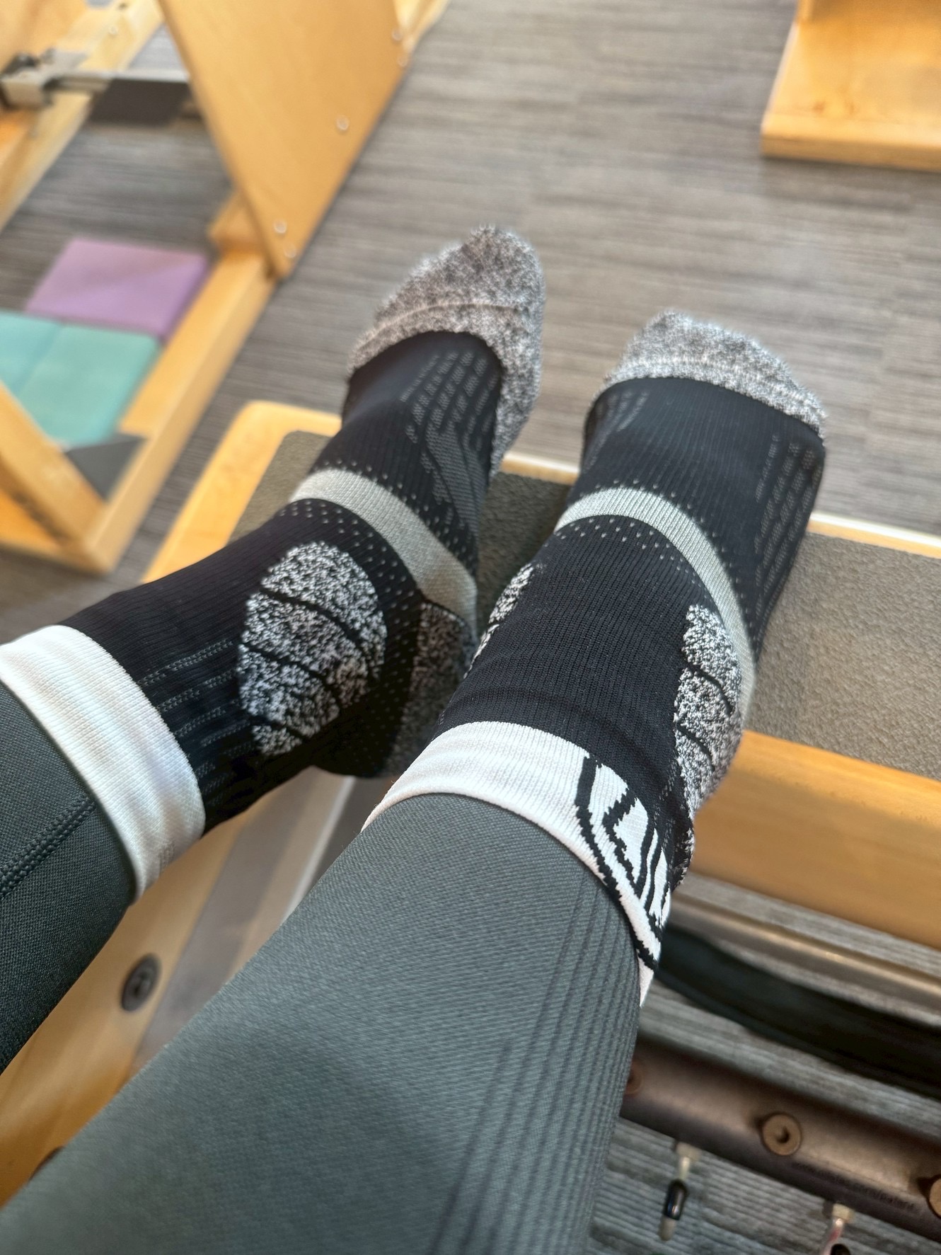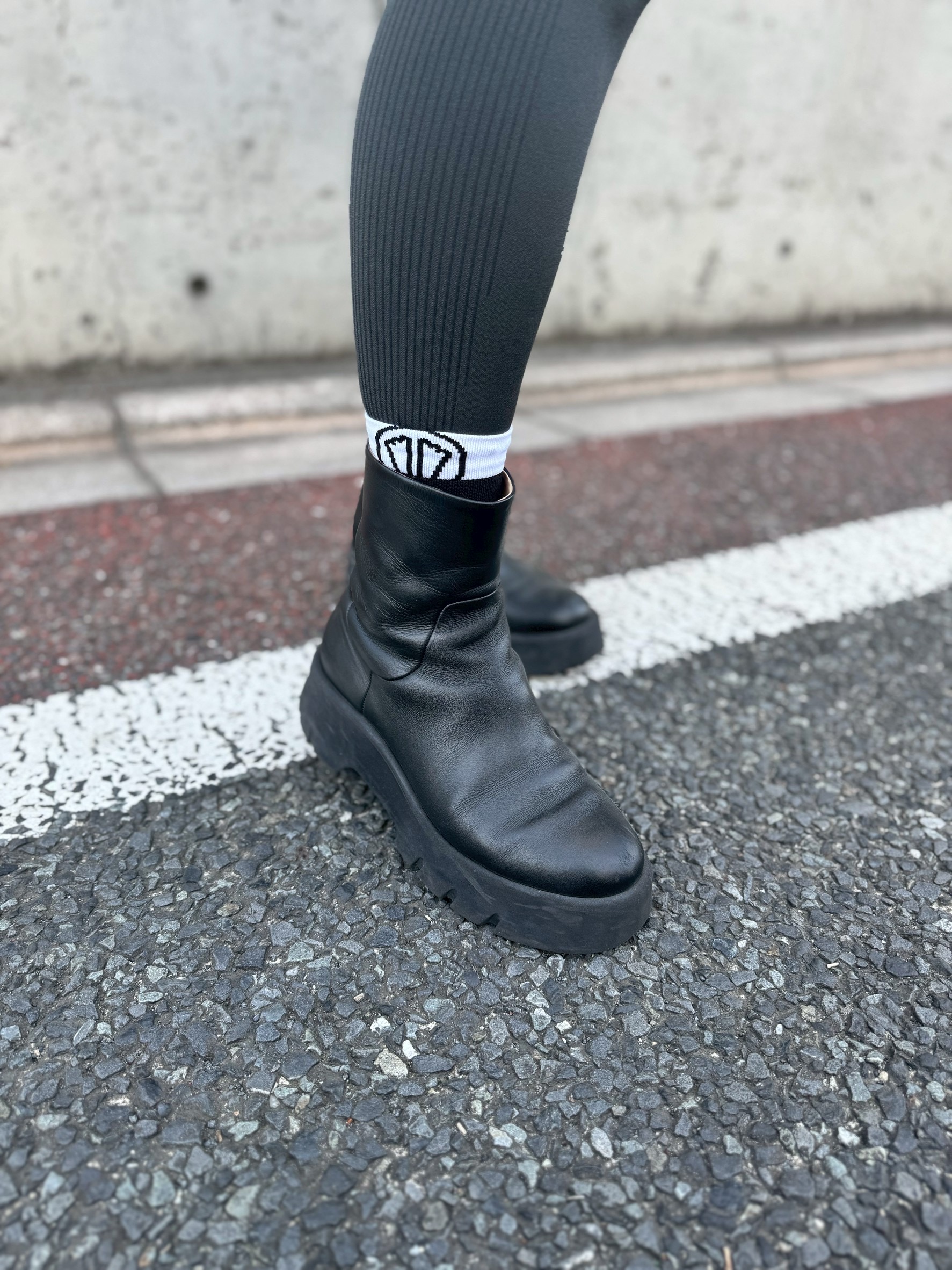 「靴の中で足が安定せず」腰痛を引き起こしていた私には、まさに普段から「腰痛防止のため」履きたいソックスなんです。走らないけど(笑)。足首に跡がつきづらいから、昼間履いていて、夜、パンプスに替えて出かけるときなんかにもパーフェクト♡ しかも、可愛いじゃないですか。高さのあるブーツからも、ほんの少し白が覗くので、こんな感じのレギンスコーディネートにぴったりです。足が安定するからか、いつもより歩きやすくなったし、ピラティスの時に使うことで、足指に正しく力が伝わる気がします。これ、絶対にオススメ。