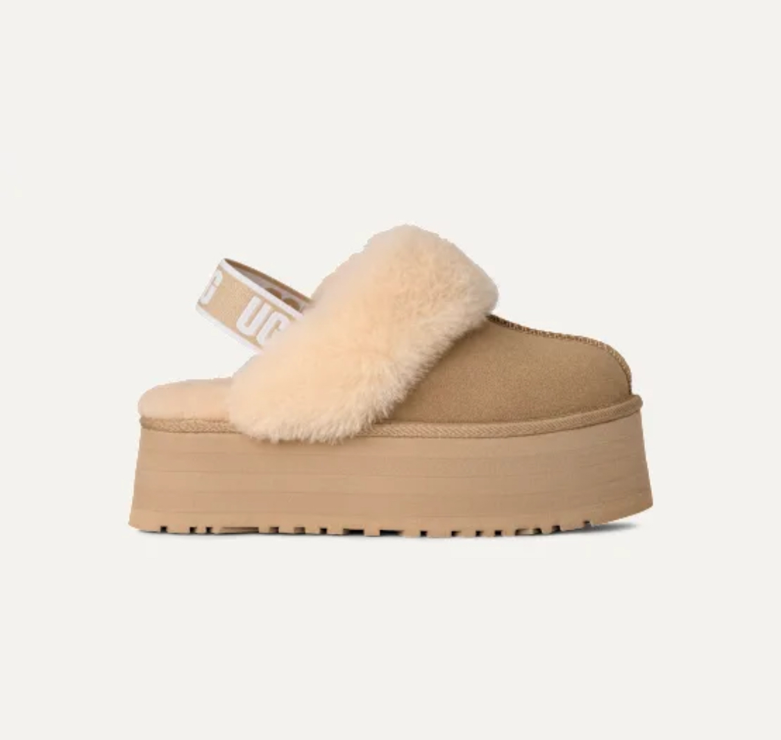 「UGG®のアイコニックなスリッパ『Scuffette(スカフェット)』を、約4.4cmのレイヤードプラットフォームソールでアップデートした『Funkette(ファンケット)』。オリジナルのスリッポンシルエットとソフトなシープスキンライニングはそのままに、ロゴ入りのバックストラップをプラス。レトロなムードが魅力の一足です。