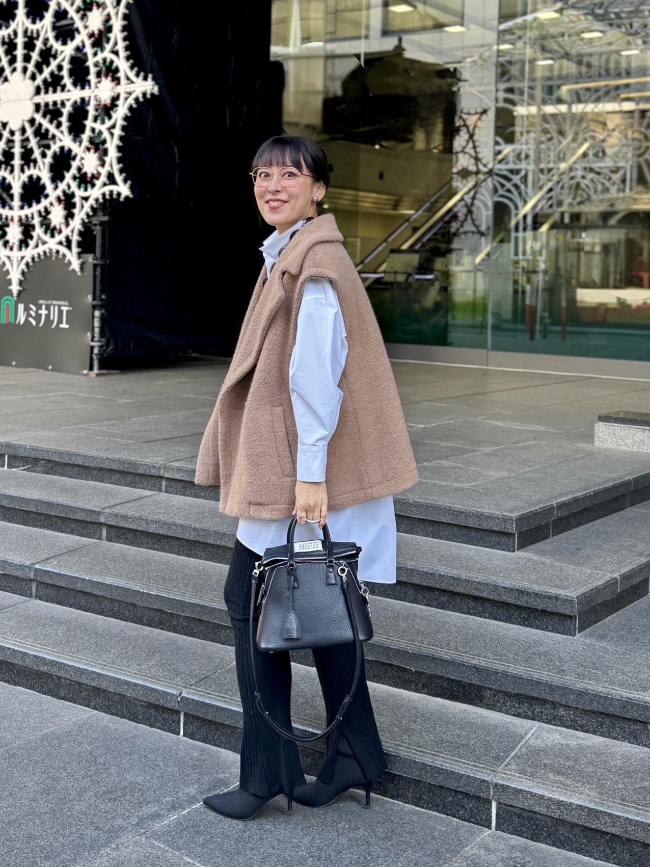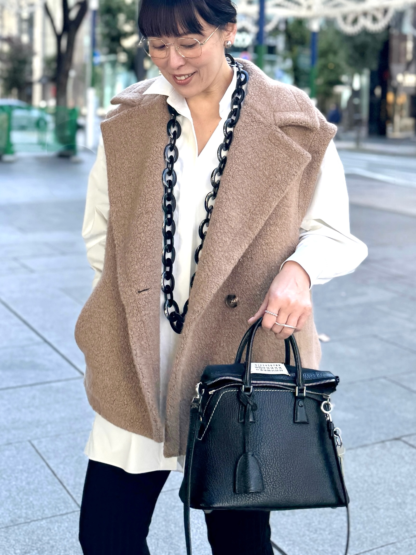 「冬は『NO.b』の“ウールジャケット”に合わせて着ていた、”フェイクボアジレ”。暖かくなったらオーバーサイズの白シャツと合わせたいな、と思いコーディネートしました。身ごろの程よいゆとり、かつ大きな襟のジレはほかのアイテムとのバランスも取りやすく、着まわし抜群でとても気に入っています」