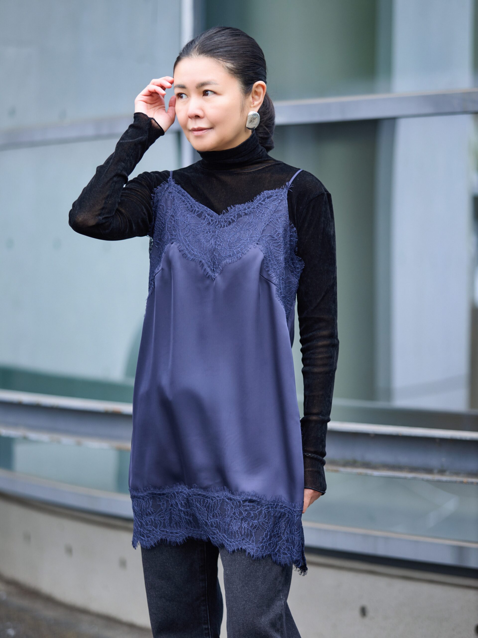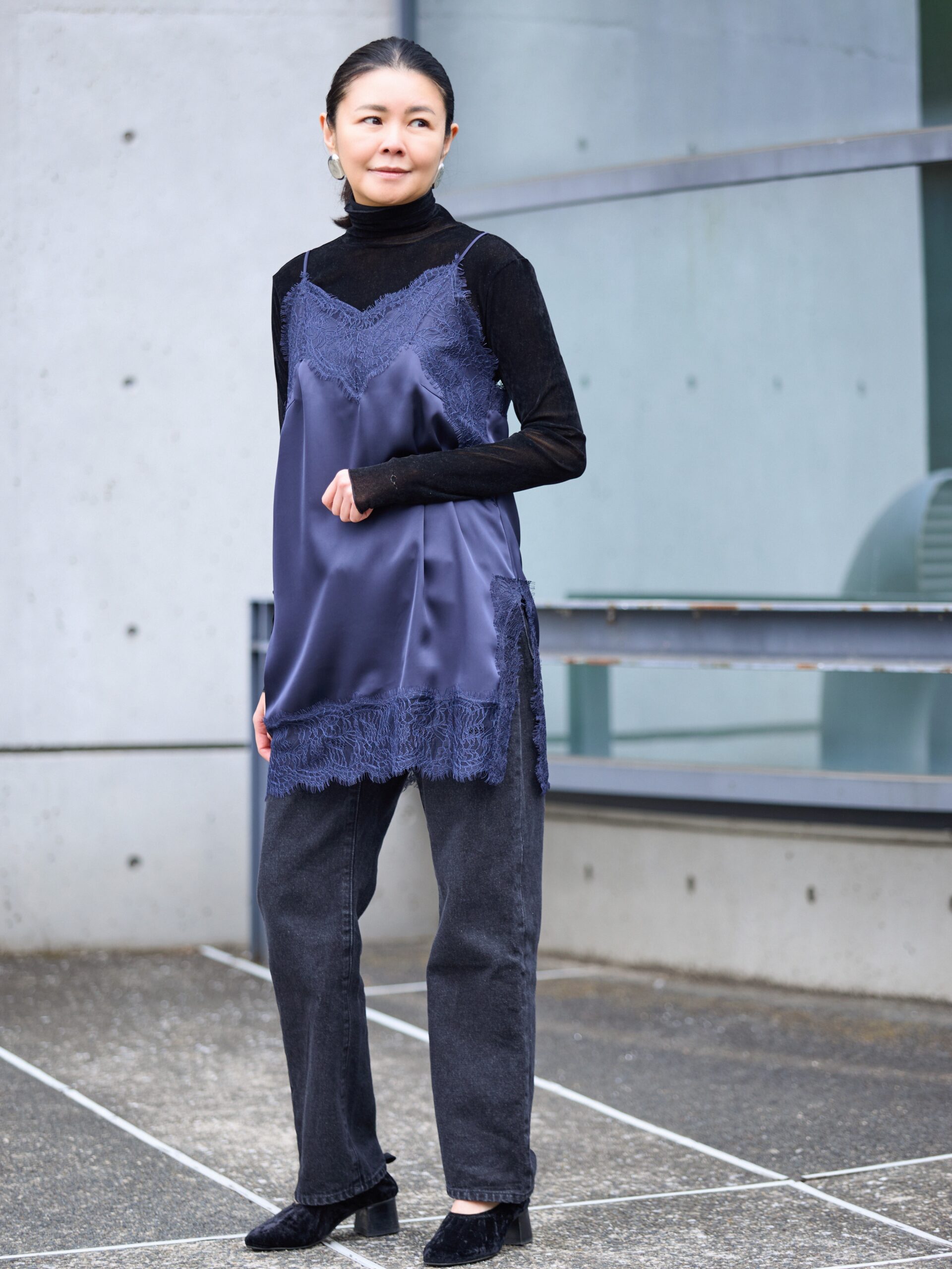 「デザイン自体はシンプルなタートルですが、艶のあるベロア調素材と程よい透け感が大人っぽく、レイヤードはもちろん、1枚でも映えるプルオーバー。ありそうでないアイテムで即買いしました! 着たときのフィット具合、肌触りも良く、とても気に入っています。ほのかな艶は、サテンやレースとも好相性でグッと大人なムードに。1枚でデニムと合わせるだけでも女性らしさが引き立ちます」