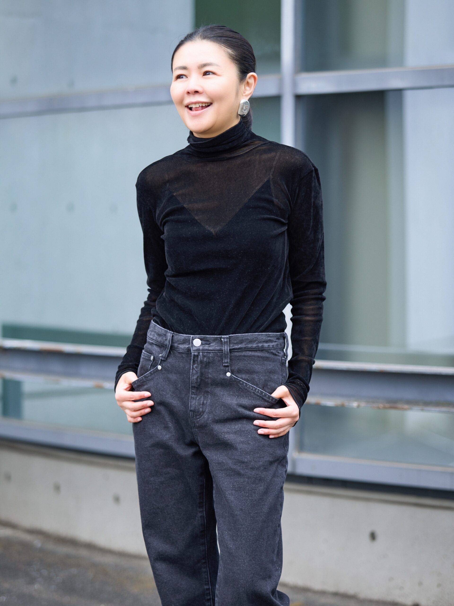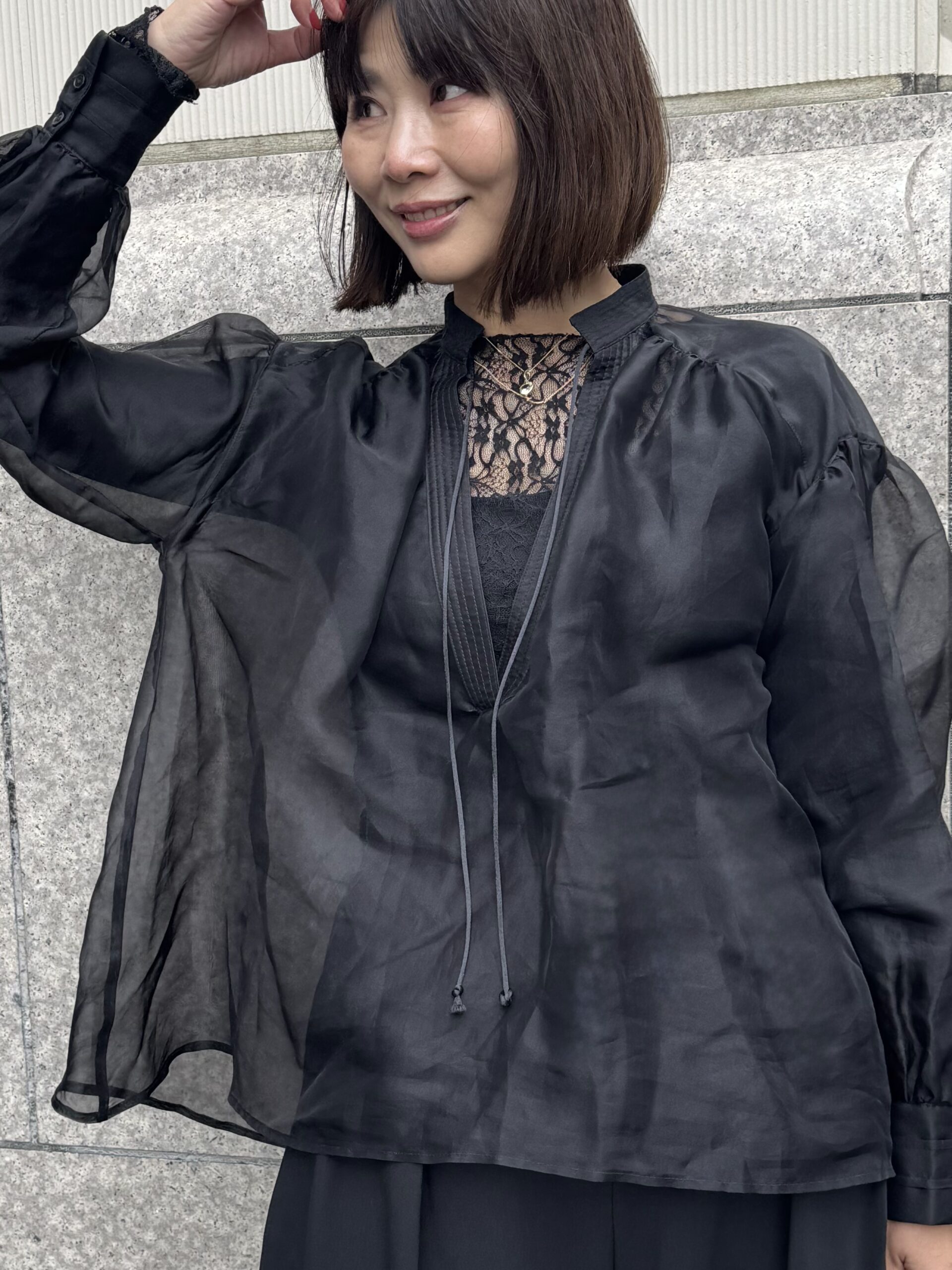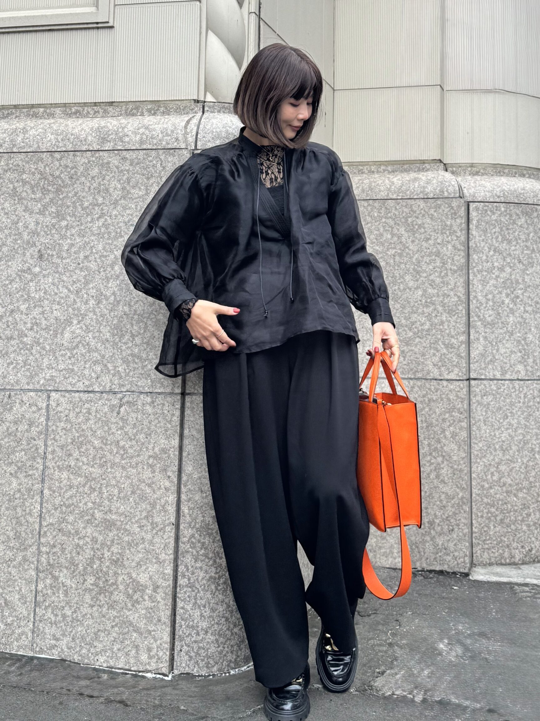 「異素材を楽しむブラックコーディネート。大切な仕事の場面にも、夜のお食事会にも、気持ちを高めてくれる“シルクボリュームブラウス”が重宝します。今回は中にレースのインナーを着用しましたが、暖かくなったらキャミソールを合わせて大人の肌見せを楽しみたいです」