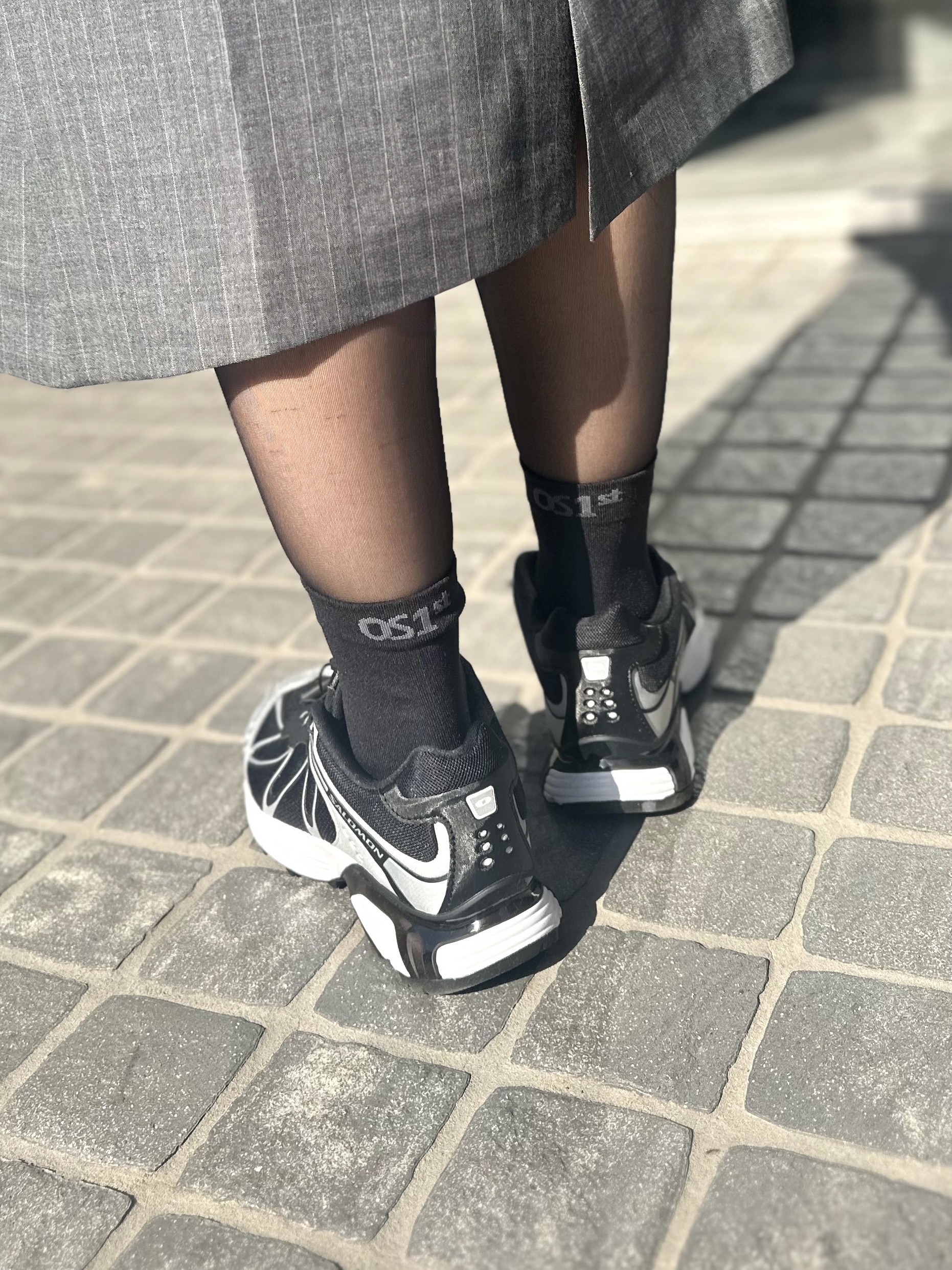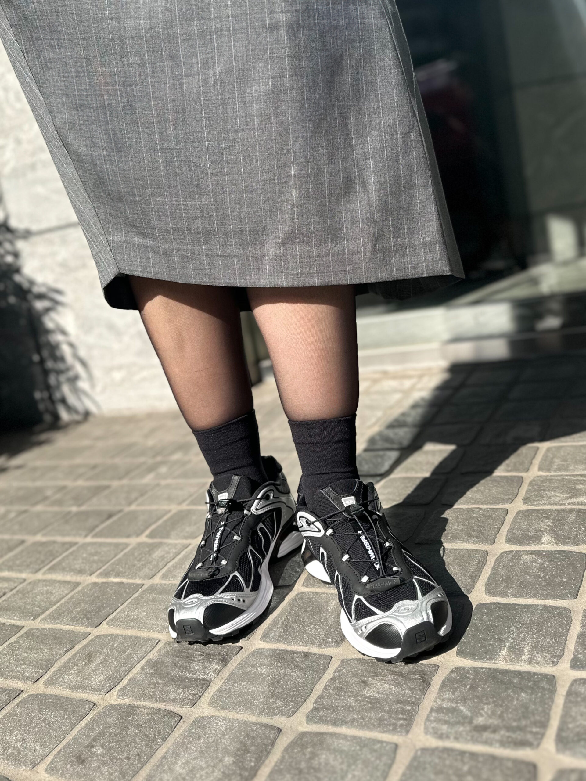 「端正な素材に女性らしいディテールが配されたワンピースは、あえてレザーのマニッシュさとスポーティなエッセンスをプラスしてカジュアルダウン。透け感のあるシアータイツにフィット感の高いパフォーマンスソックスを重ねてコーディネートに奥行きをもたせつつ、おしゃれと快適さを両立させました。ソックスのロゴでハズし、遊び心と個性を加えています」