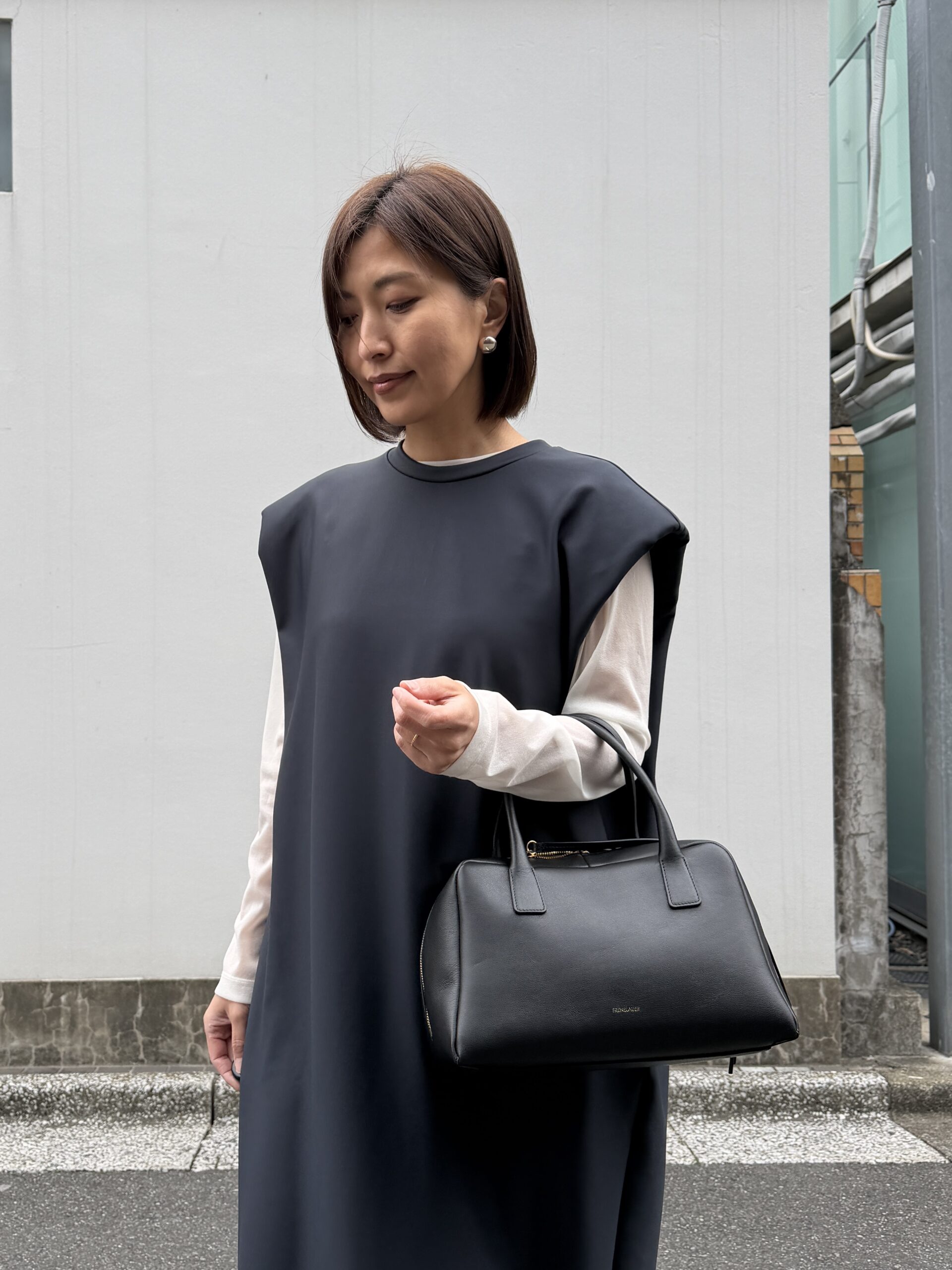 「パワーショルダーのデザインに一目惚れしたワンピース。このデザインを目立たせるため合わせたアイテムはシンプルに、色もモノトーンでまとめました。すべてダークトーンにすると強い印象になるので、ホワイトのシアー素材のトップスをレイヤードし柔らかさをプラス。アクセサリーもピアスのみにすることで、ワンピースの存在感が最大限に引き立ち、印象に残るコーディネートに」