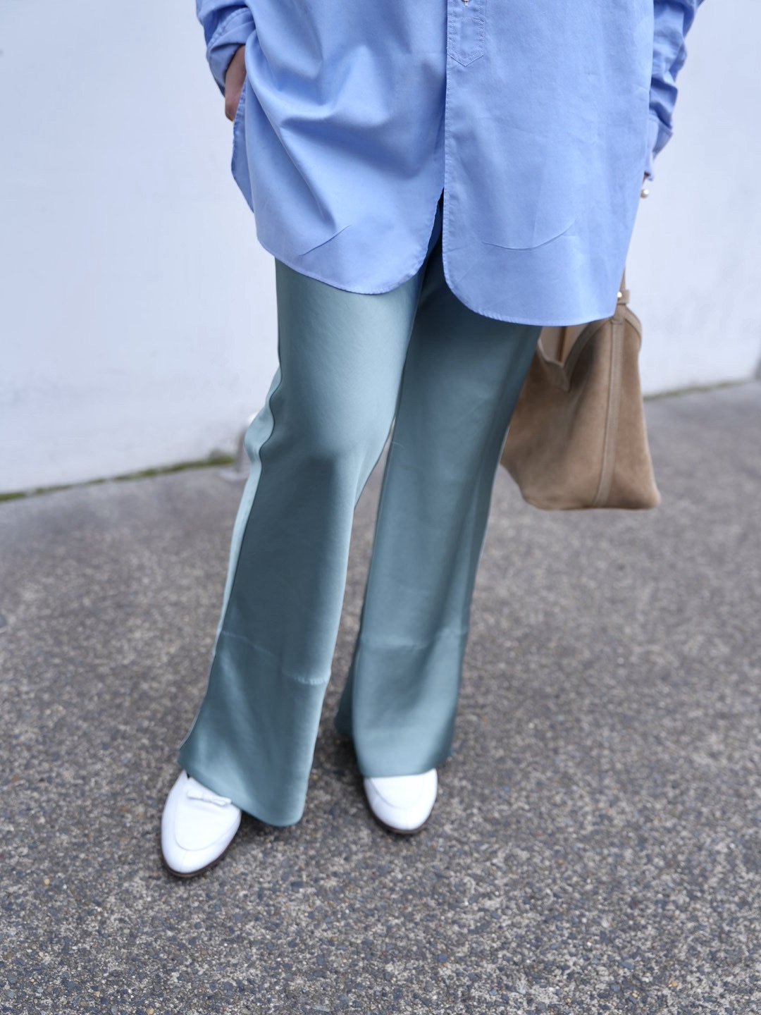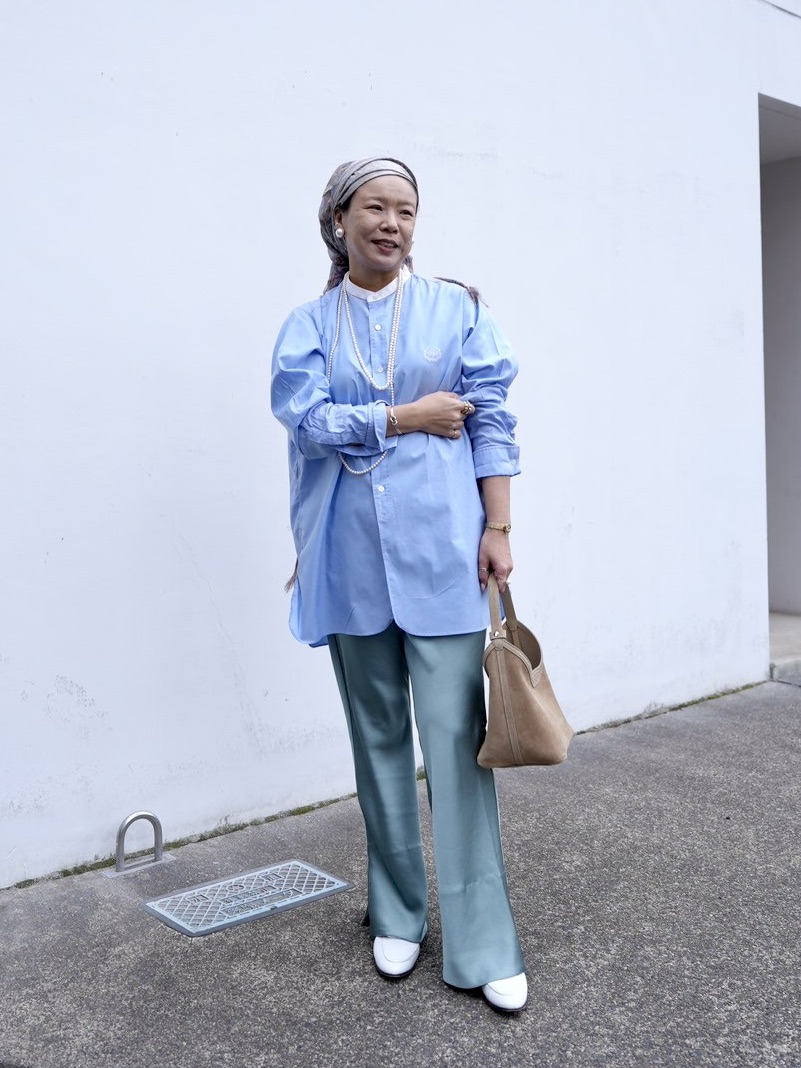 「冬は毛足のあるニットと合わせて、暖かみのある質感とサテンの艶、そのコントラストを楽しんでいました。春は少し気分を変えて、きれい色同士の組み合わせに挑戦。ブルーを選んだのは、同じ寒色系なら色×色でも主張しすぎず、グリーンのニュアンスがより引き立つから。サテンの光沢が、色の重なりを優しくまとめてくれるのもポイントです。洋服で色を使っているぶん、小物はホワイトからベージュのやわらかいトーンで統一。シーズンを超えて楽しめる一本だからこそ、素材や色合わせで着こなしの幅を広げていきたいと思っています」