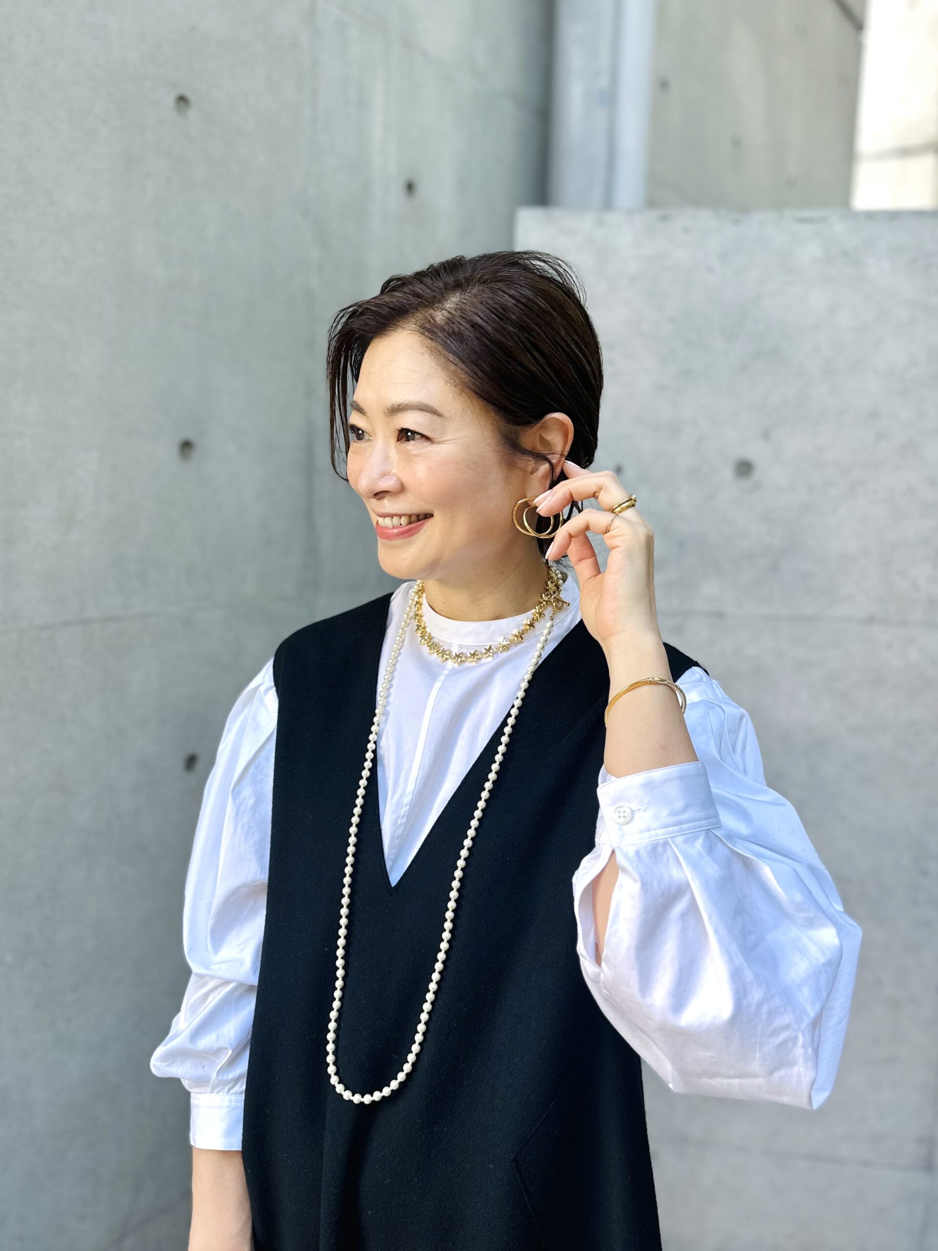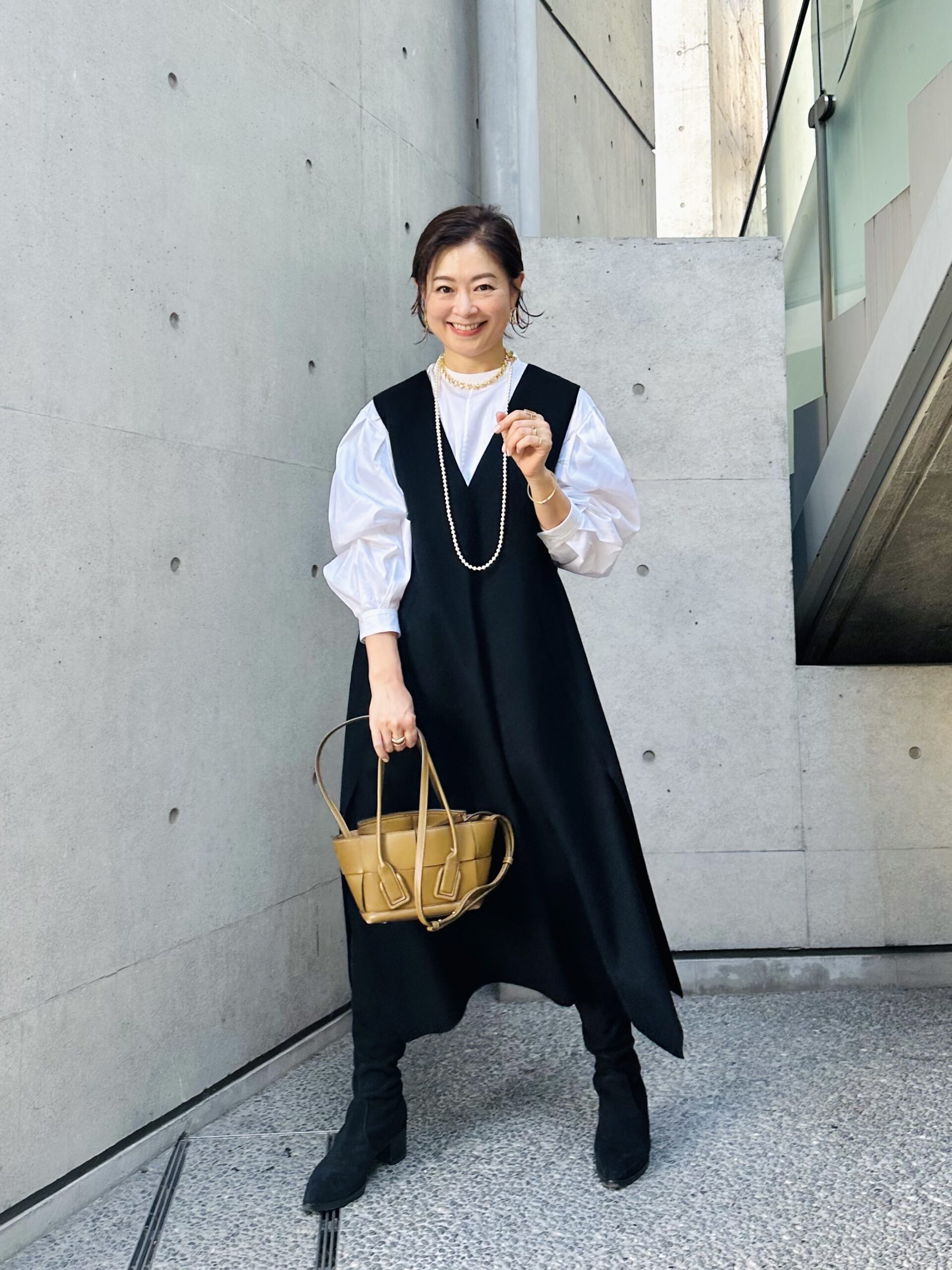 「構築的な裾のシルエットが素敵なワンピース。真冬は黒のタートルニットを合わせていましたが、そろそろ春を意識したくて白のブラウスをインにしてみました。中に入れるもので雰囲気が変わるので、長い期間楽しめるのがいいですね。軽くソフトな風合いのウールビーバー素材はシワにならず、ストレスフリーな着心地!」