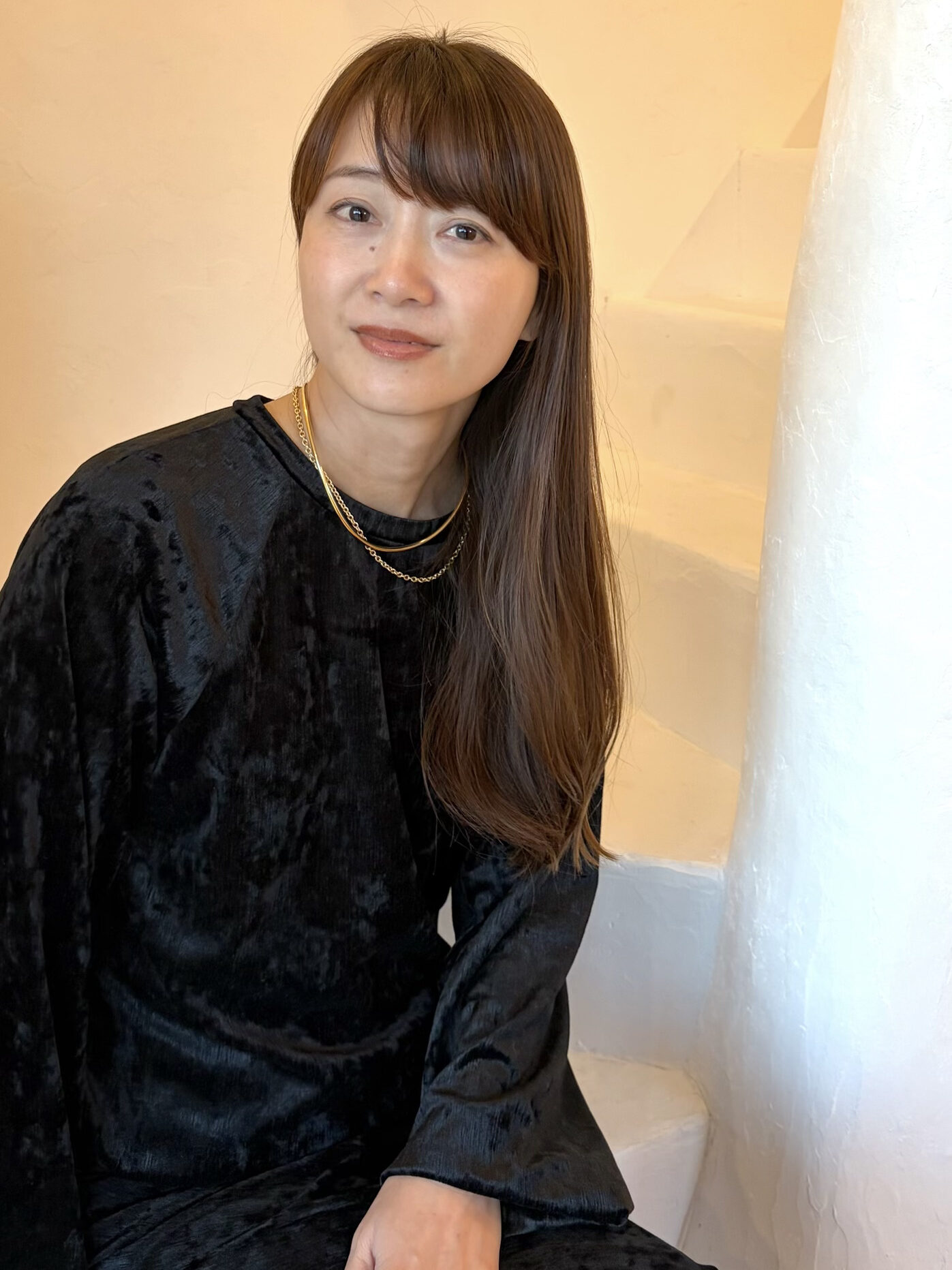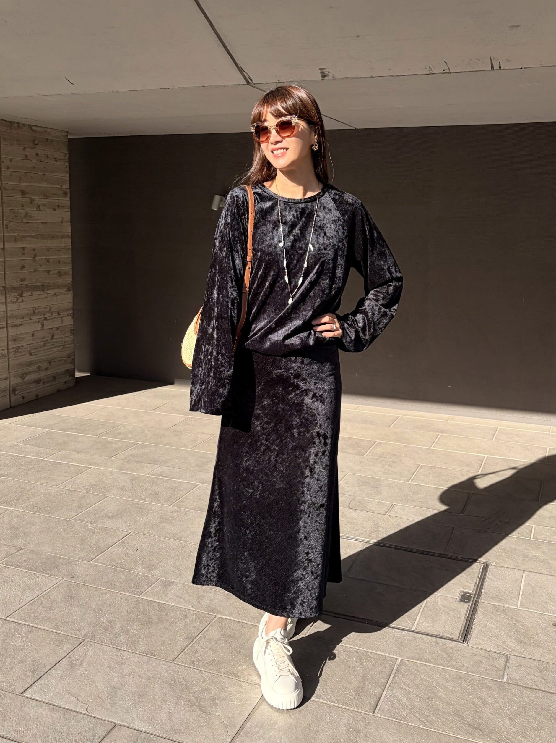 「上品なベロアの艶感が大人の女性らしさ演出しつつ、ラグランスリーブが程よいリラックス感を添えてくれる、このバランスが絶妙! スニーカーを合わせて休日に、ヒールを合わせてキレイめにと、幅広いシーンで活躍してくれます。何より着心地が優しくて、体を無理に締め付けず、シワにもならないので、家でのリモートワークや旅行にも、ついつい手が伸びてしまう。それでいてスタイルアップ力も高く、体型の気になるところをさりげなくカバーしてくれるのには驚きました。大人世代も安心して着られ、一着で何通りにも着まわしを楽しめる、万能セットアップです」