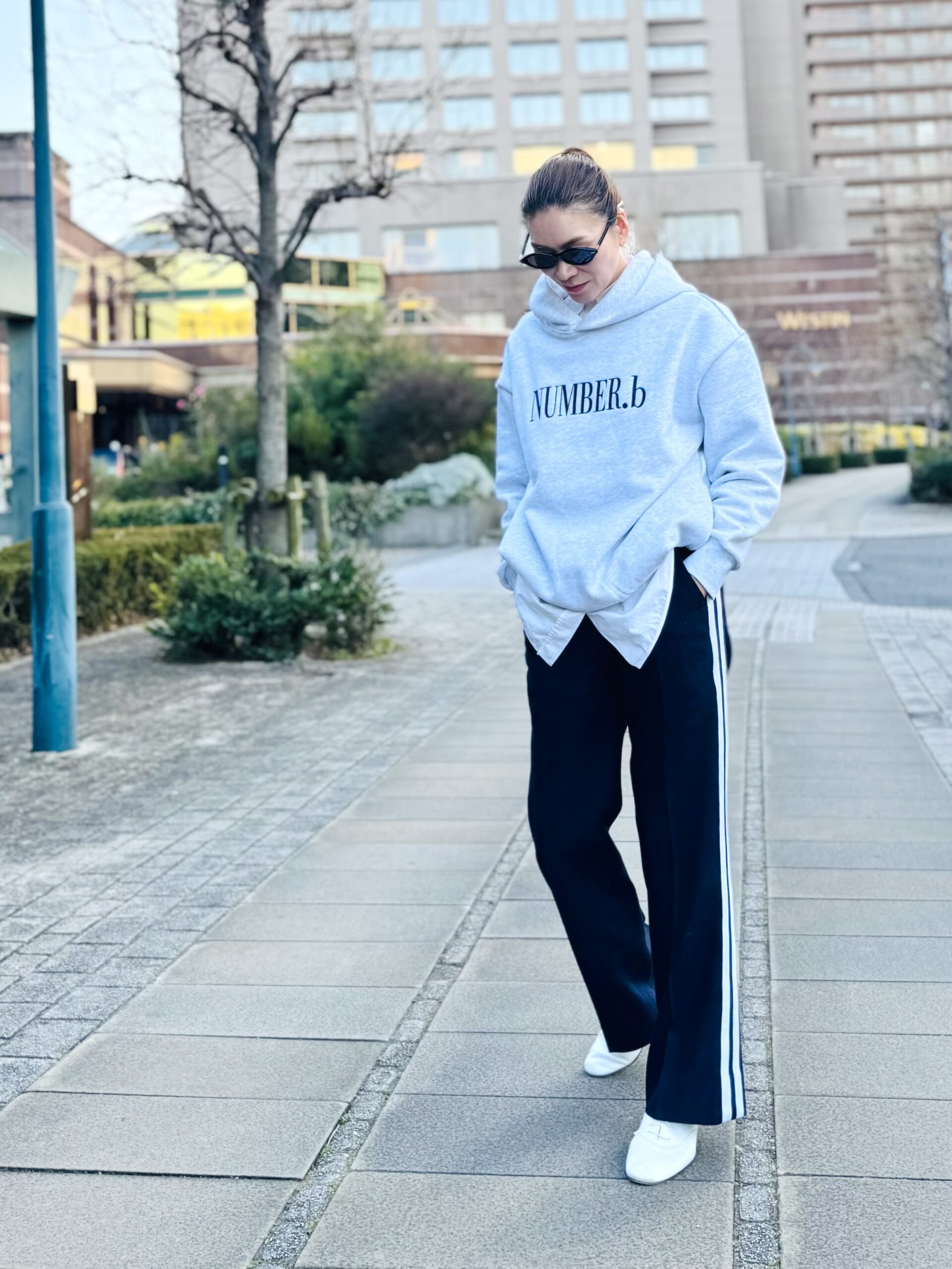 「上品見えするスウェットのトップスとパンツは、セットで着ても単品ずつでも着まわしが効くアイテム。スウェットなのに“カジュアルに見えすぎない”ので気負わず着られ、長距離移動も快適に。ロゴパーカには“品の良さ”を意識してシャツをレイヤードし、レザーシューズを合わせて。カジュアルときれいめ、どちらかに振りすぎることが無いよう、ネイビーのラインパンツでバランスを整えます。スウェットパンツを生かすときは、パンツのきれいなラインを引き立たせるため、短丈トップスで上半身をコンパクトに」