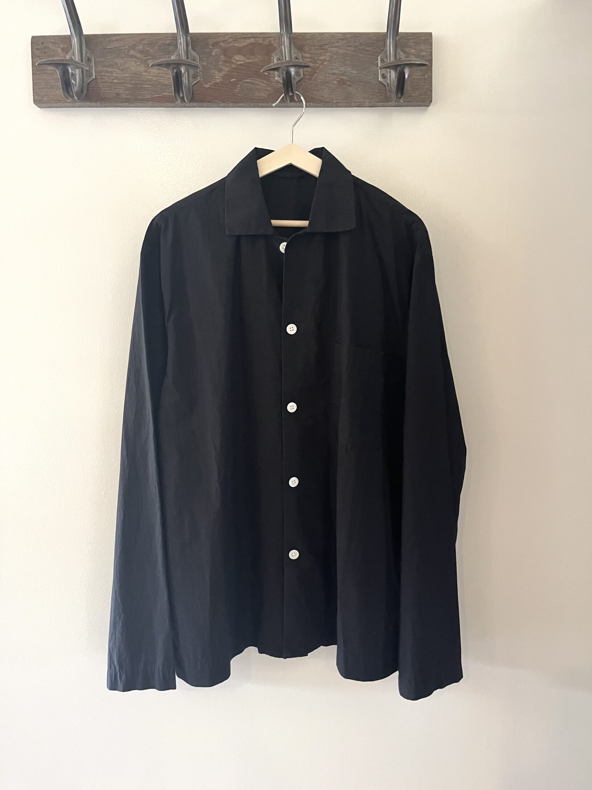 オーバーサイズを選んだので、動きにニュアンスが出て、風通しも良好。黒シャツというと、ドレッシーなイメージが強いかもしれませんが、大きめの白のボタンがアクセントになり、抜け感を添えてくれます。デニムやチノパンツと合わせてカジュアルに、あるいはスラックスと合わせてシックにと、テイストを自在に行き来できるのも、このシャツの懐の深さ」
