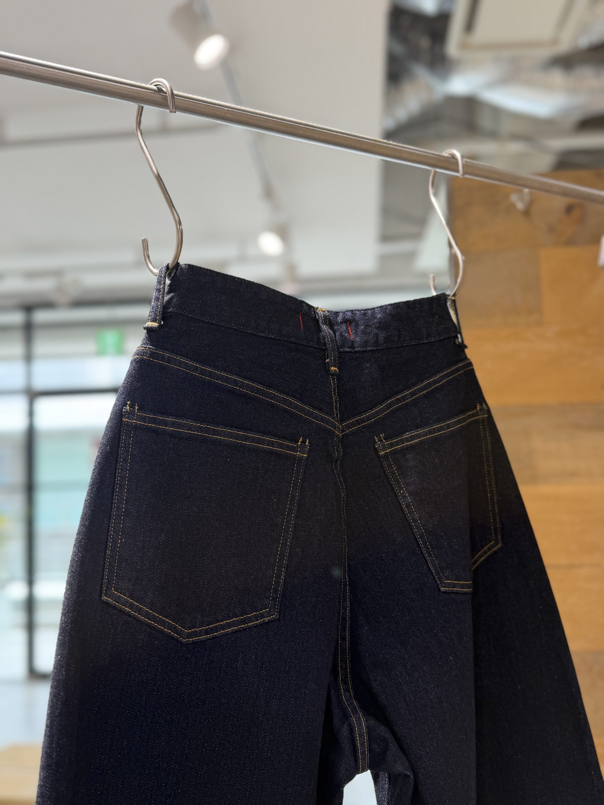 さらに、やや大きめのバックポケットがヒップをきゅっと小さく見せてくれるのも嬉しいポイント。フロントのボタンはコッパー。さりげなくヴィンテージ加工が施されていて、玄人っぽいニュアンスを添えてくれます。