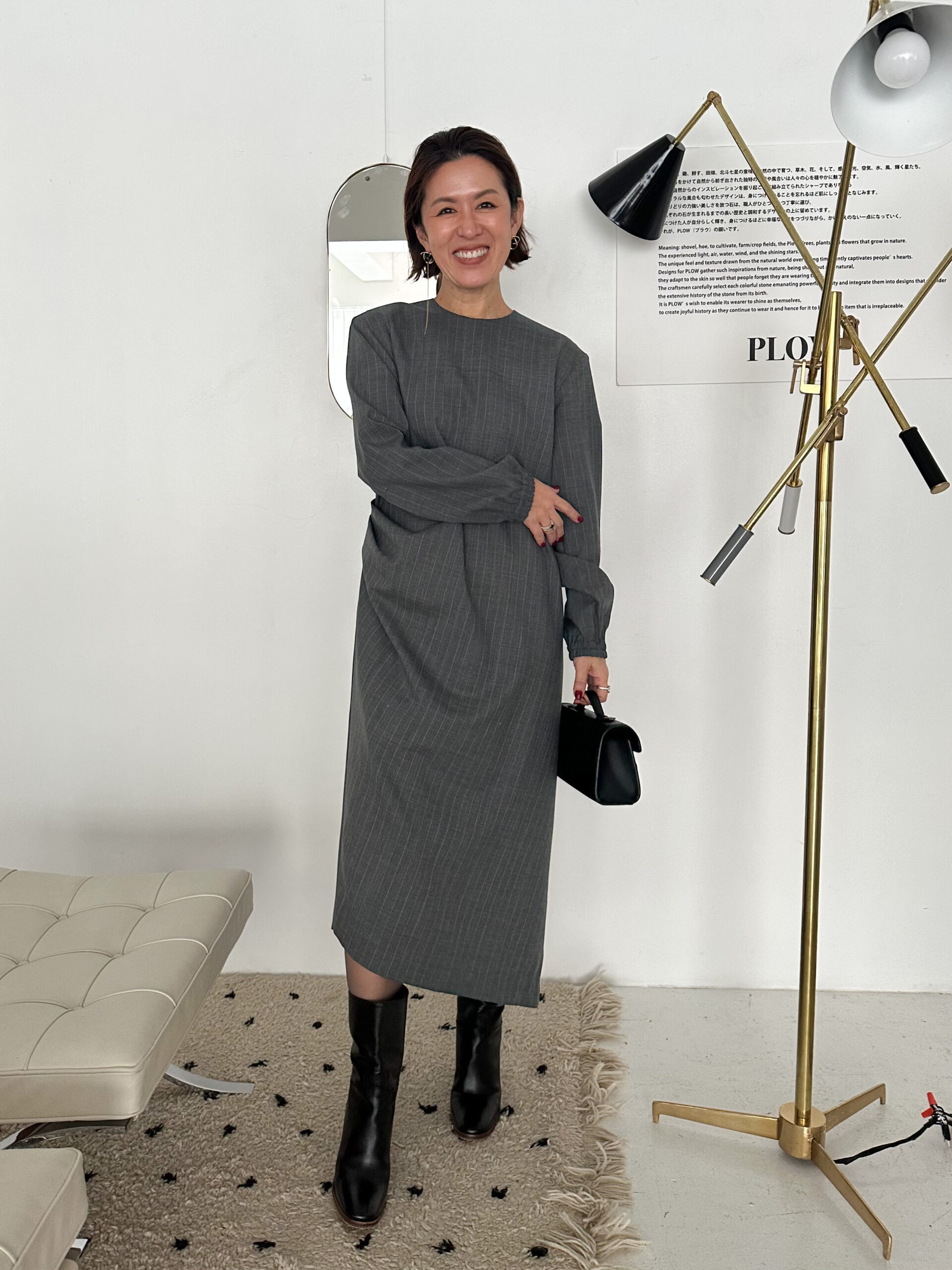 白+グリーンのはっきりとしたコントラストに、さらにピンクを追加。単調な色合わせを良い意味で裏切った配色が叶うのは、グリーンとピンク、両色ともグレーがたっぷり入っているから。モノトーンやワントーンコーディネートが多かった最近ですが、こんな色遊びも楽しい! 夏によくはいたサテンのパンツだと、艶が出過ぎてしまうので、ここは起毛感のあるコーデュロイで生地の厚みを意識。色味は爽やかでも、しっかり秋の装いへシフトします。
