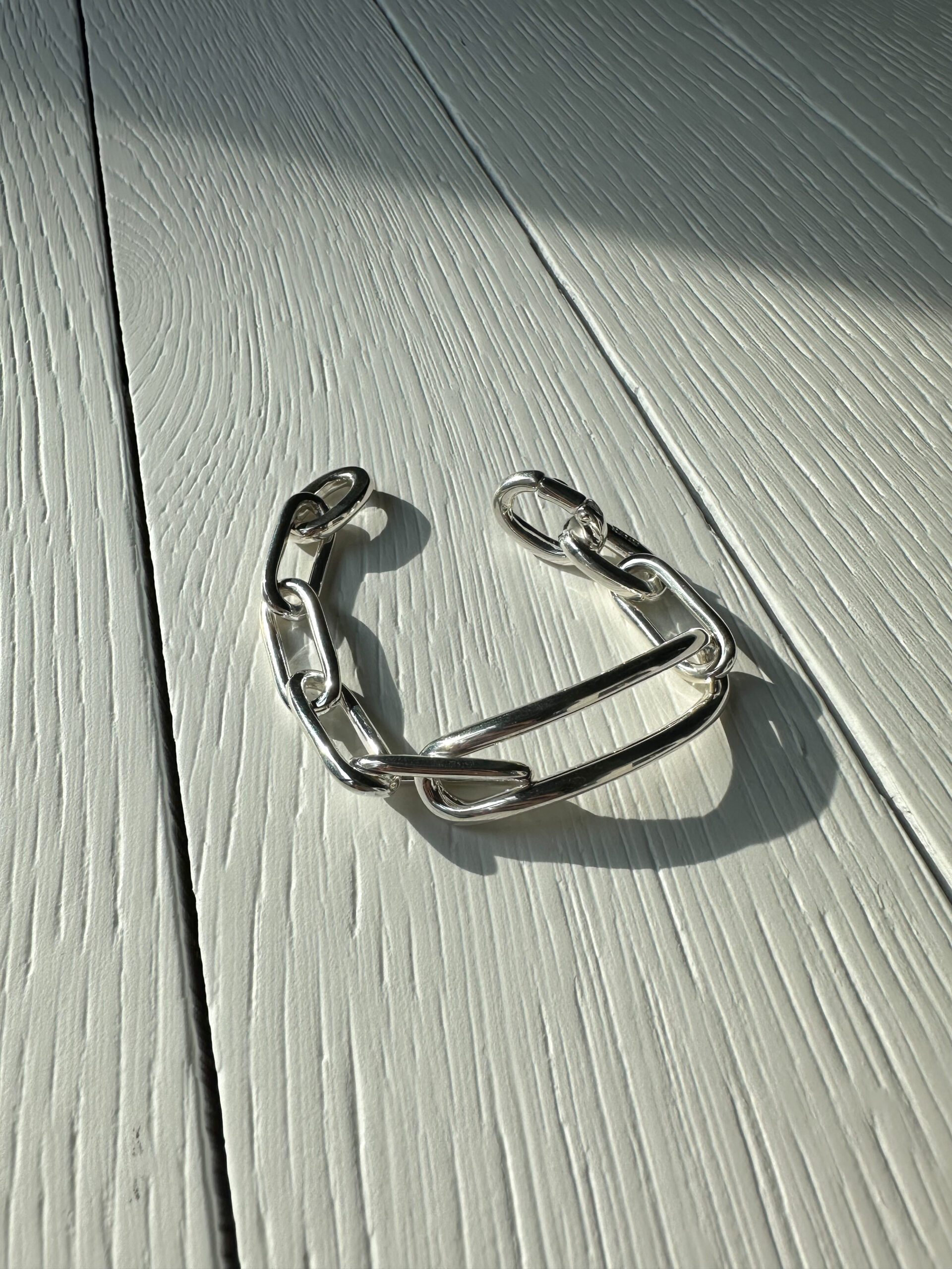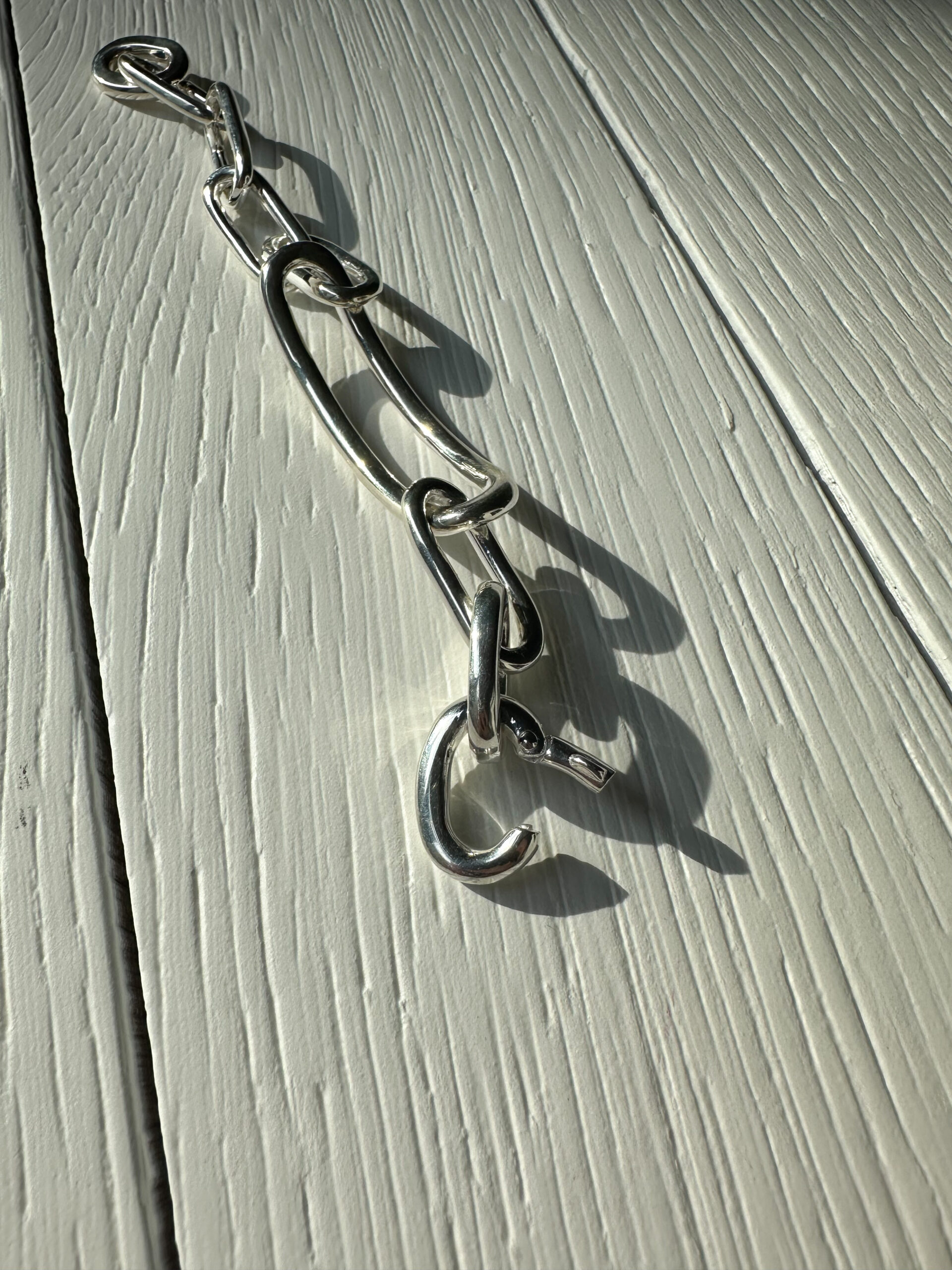 「人気の定番アイテム『LA TOUR(ラトゥール)』のブレスレットは、今、男性にもすごく人気なんだそう! ボリュームのあるチェーンブレスレットはよくあるけれど、ともするとハードになりすぎて、女性の華奢な手首にはトゥーマッチになってしまうことも。でも、このブレスレットは違うんです。つけてみると、なんとも肌馴染みがよくて、手首に自然と溶け込むような心地よさが。じっくり眺めてみると、その秘密がわかりました。メインのチェーンが、シャープな直線ではなく、緩やかな曲線を描いているから。この絶妙なカーブが手首のラインに沿うことで、ボリューム感はありながらも、ごつさを感じさせない仕上がりに。