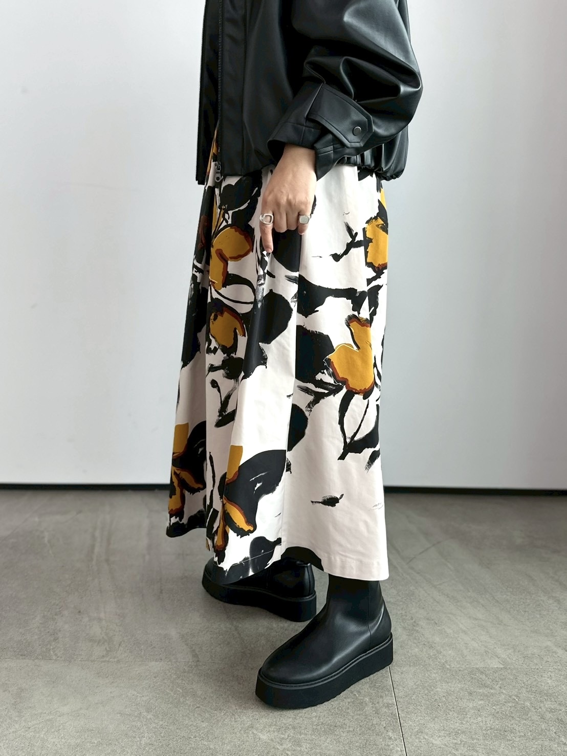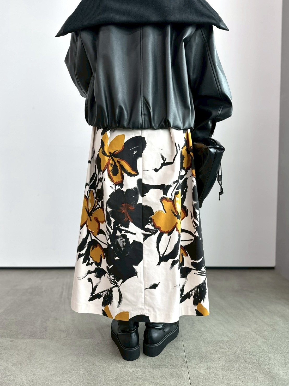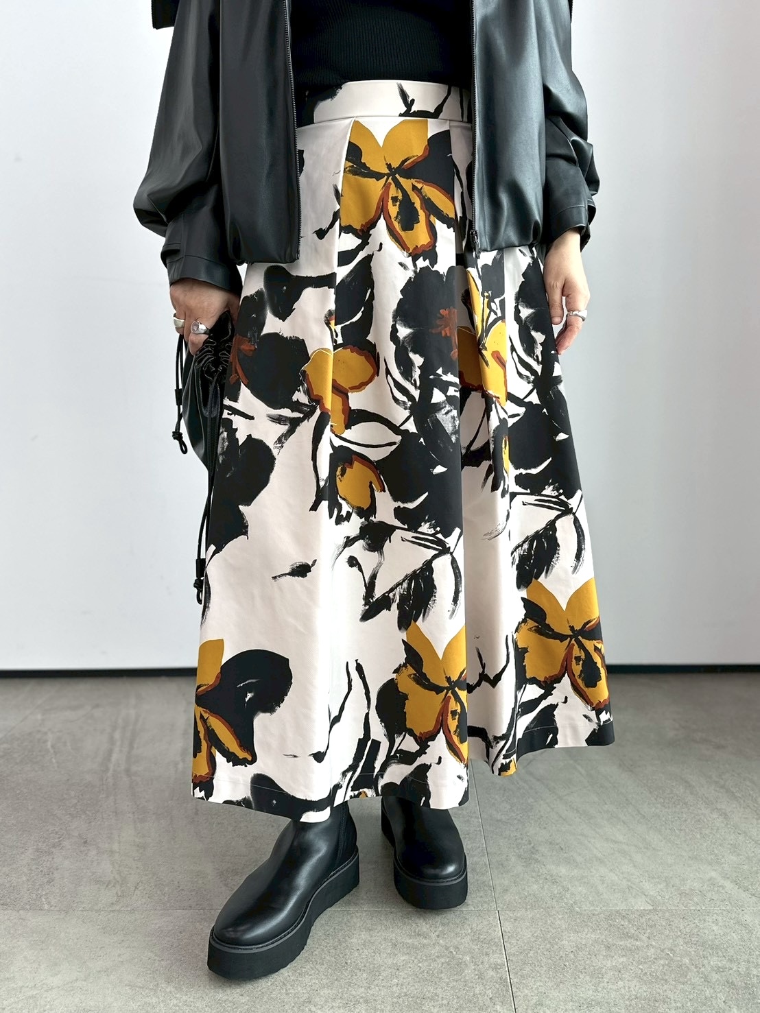 「これまでの『PLST(プラステ)』にはなかった、大胆なフラワープリントに、目が奪われました♡ 華やかだけど、配色は黄色×オレンジ×黒×白の絶妙バランスで、どんな色のトップスとも不思議と馴染んでくれる万能柄です。
