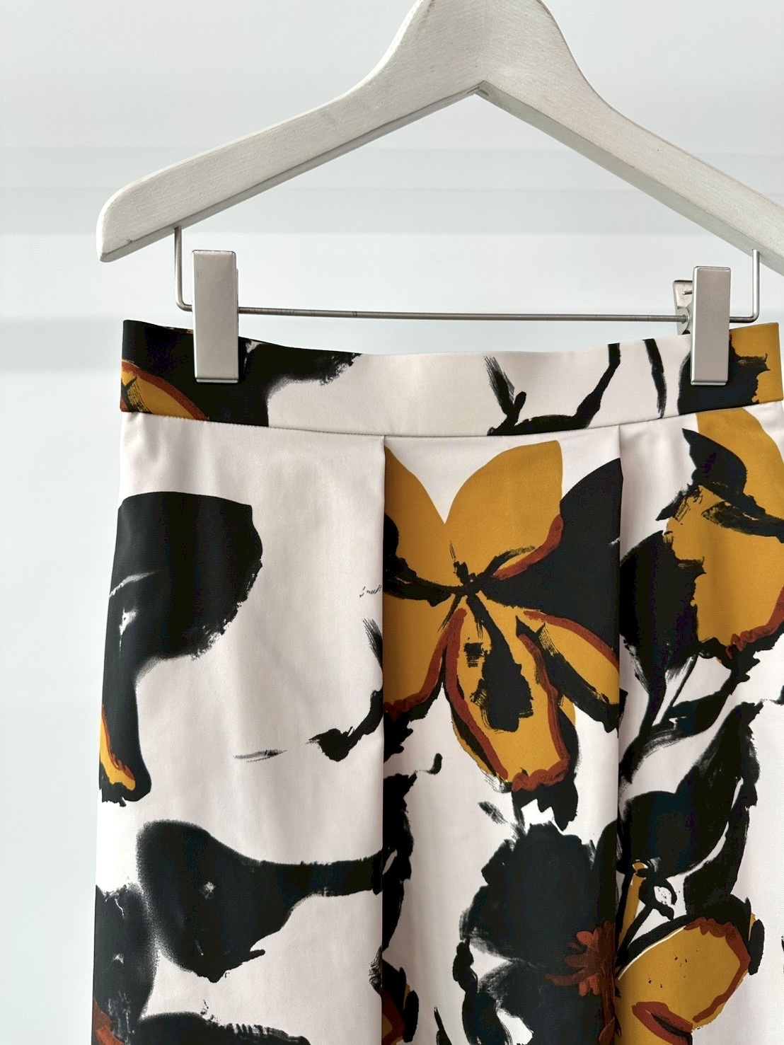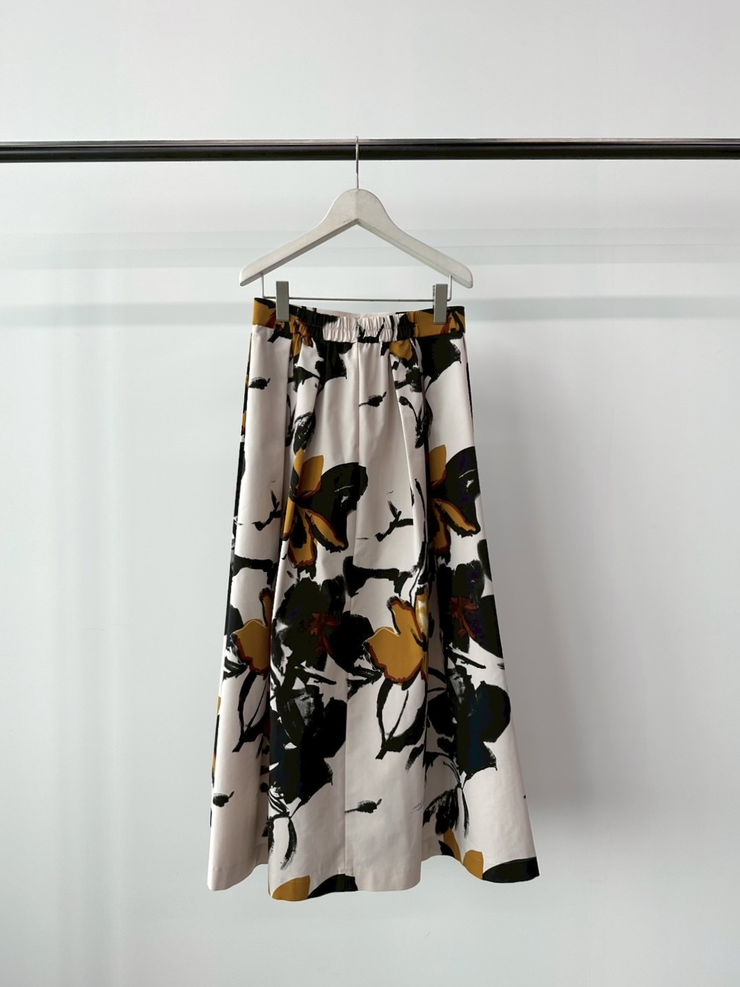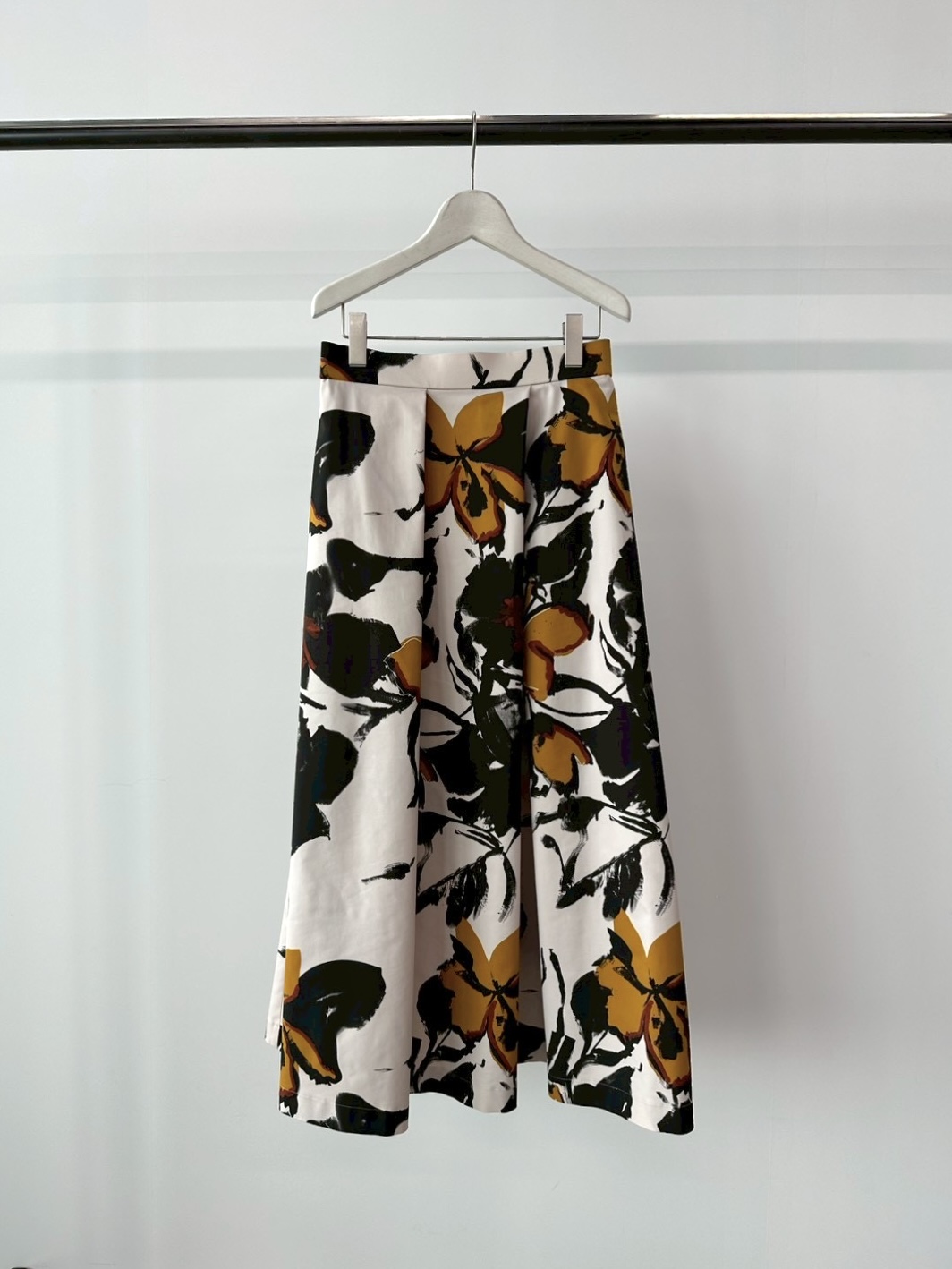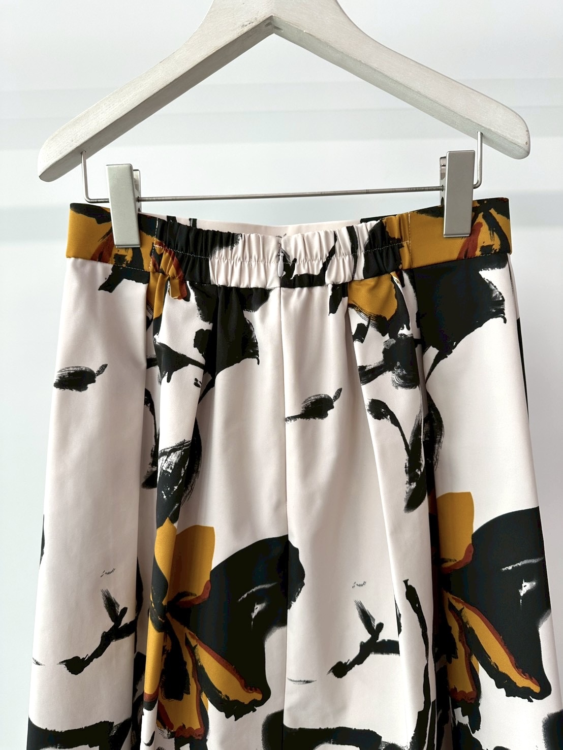 「これまでの『PLST(プラステ)』にはなかった、大胆なフラワープリントに、目が奪われました♡ 華やかだけど、配色は黄色×オレンジ×黒×白の絶妙バランスで、どんな色のトップスとも不思議と馴染んでくれる万能柄です。