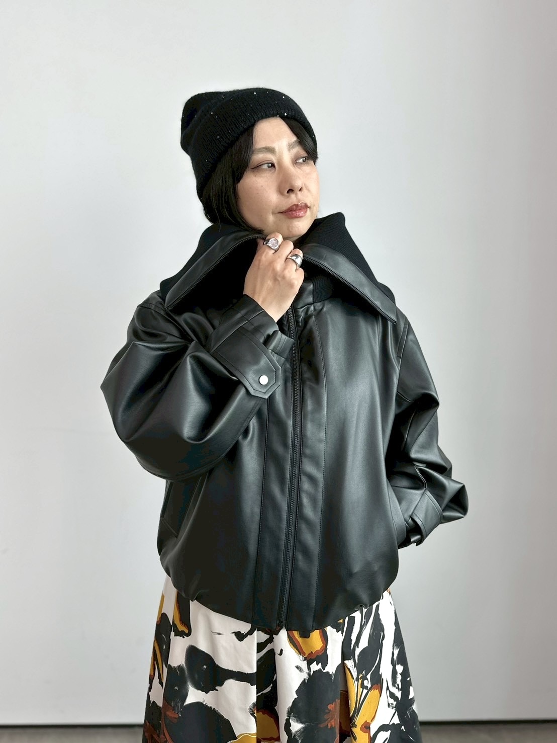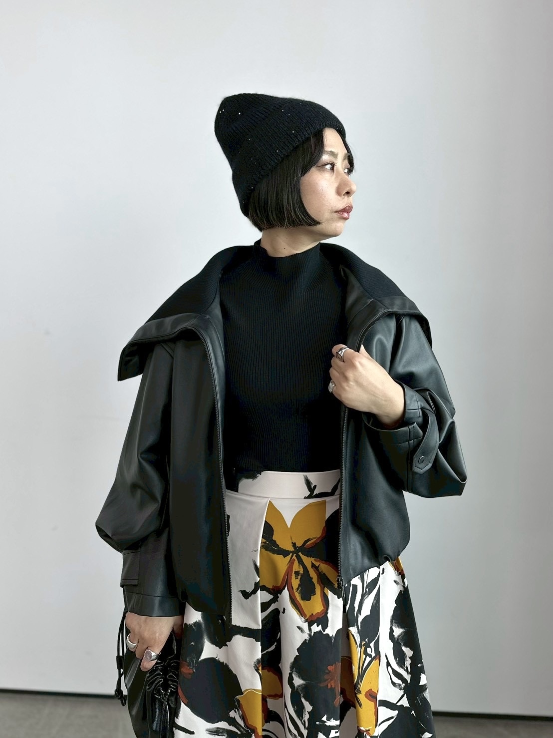 そして今年の大本命、レザーブルゾンも見逃せません。軽やかなフェイクレザーなのに、驚くほど高見え! 一見ハードな印象のアイテムですが、ボリュームスリーブやセーラーカラーで女性らしいやわらかさをプラス。後ろがふんわり長めのシルエットだから、体型カバーにもひと役買ってくれます。