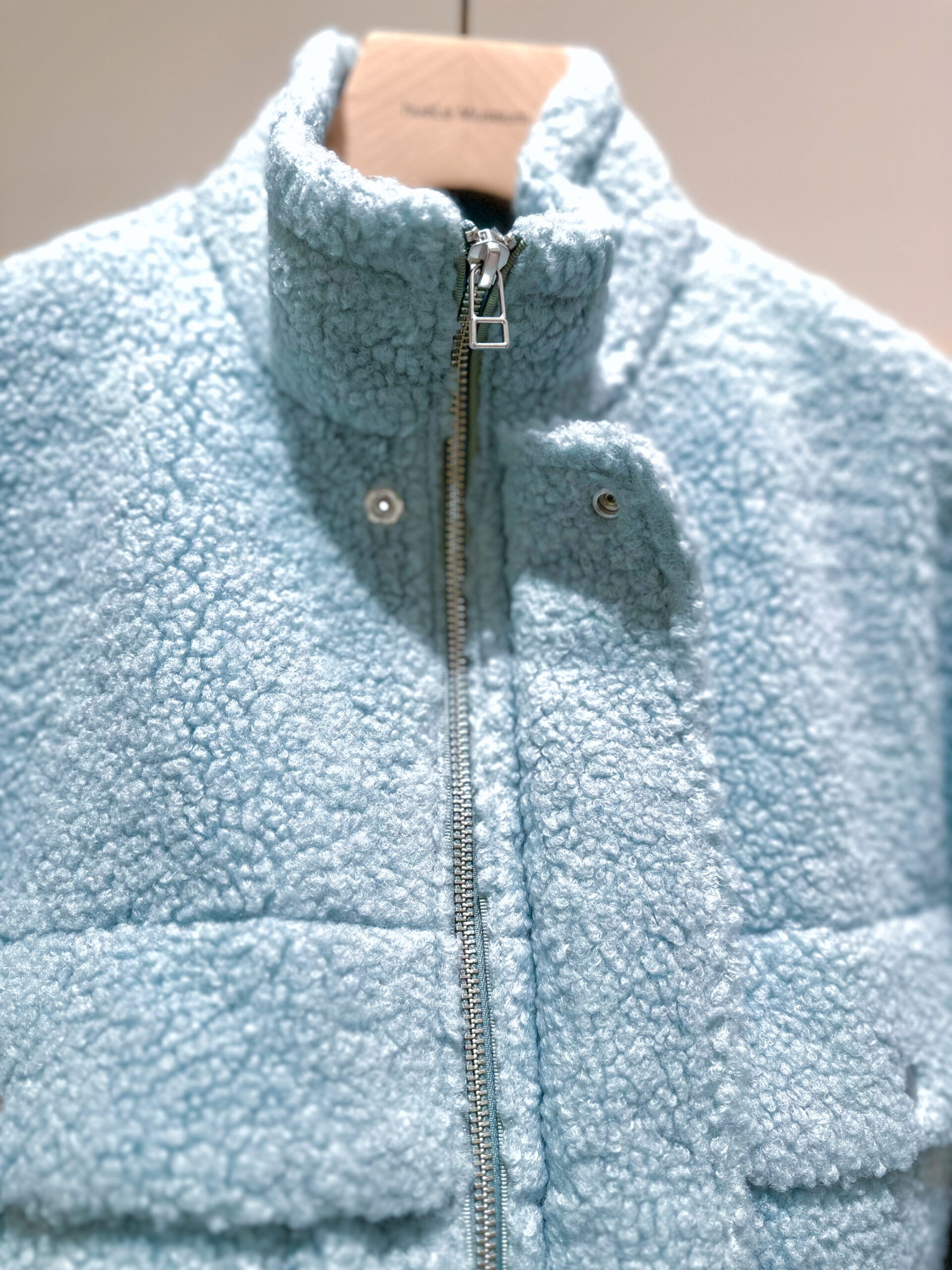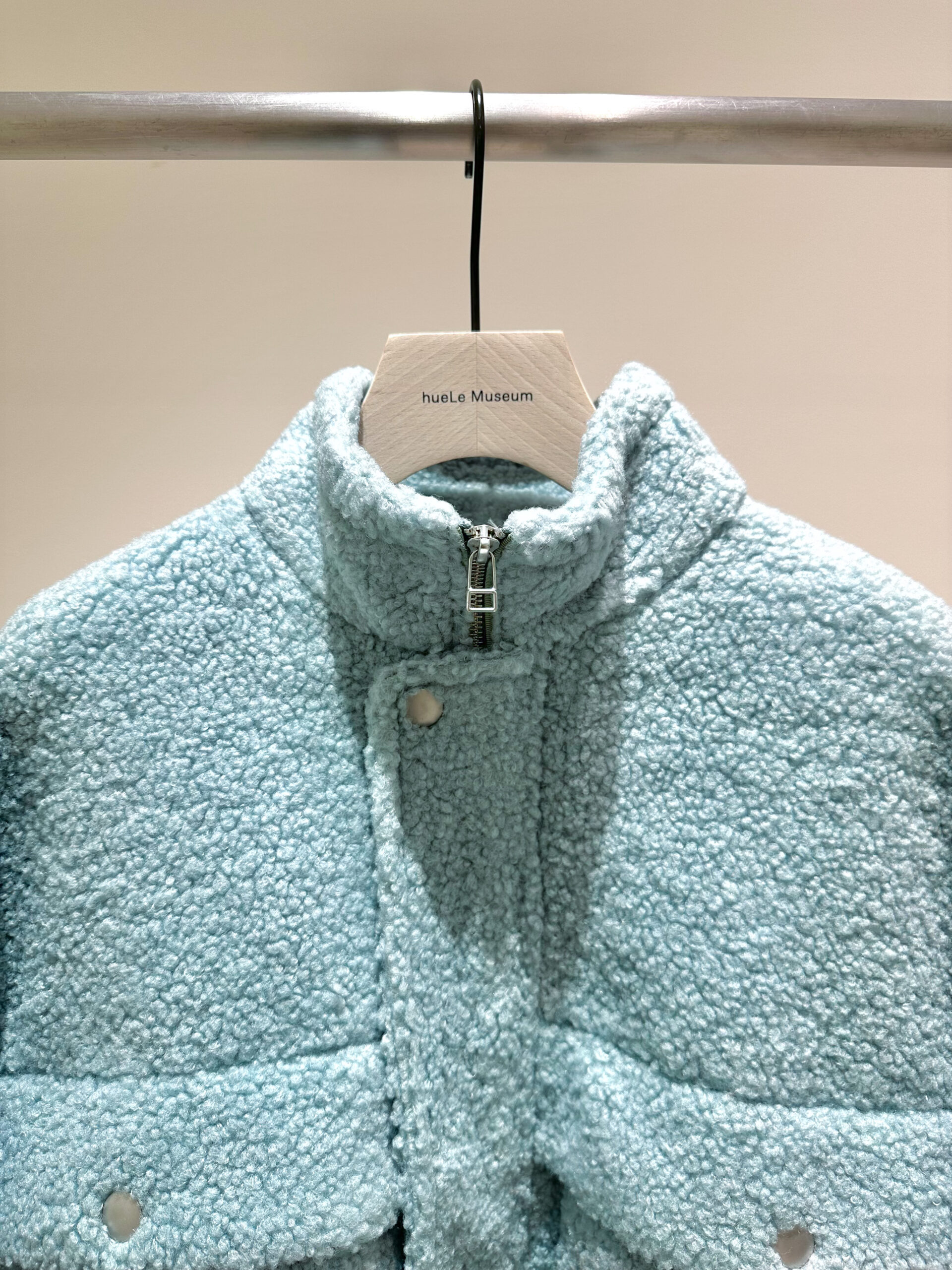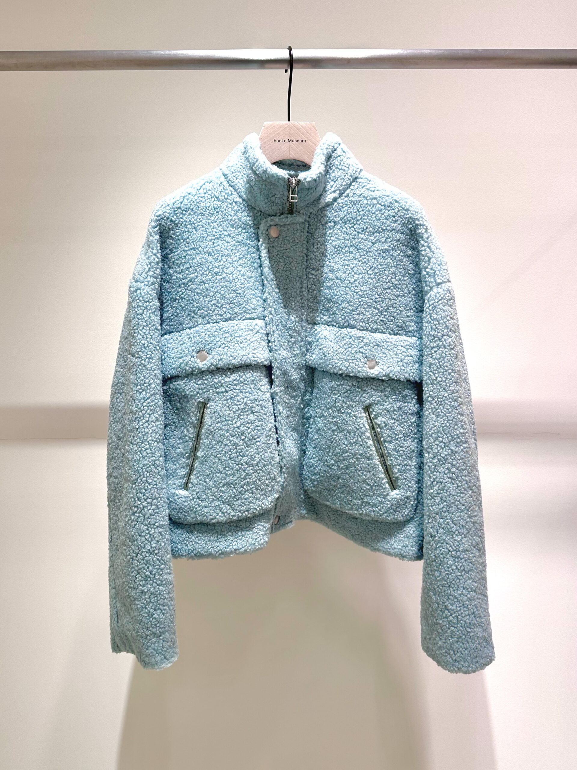 「90年代テイストのデザインをベースに、今季らしいボア素材で仕立てたブルゾン。ドロップショルダーや胸元のファスナー付きパッチポケットなど、機能的で遊び心のあるディテールが随所に散りばめられています。さらに、ドットボタンやメタルファスナーなどの金属パーツをアクセントに効かせることで、クラシックとモードが融合した独特のムードを演出してくれます。
