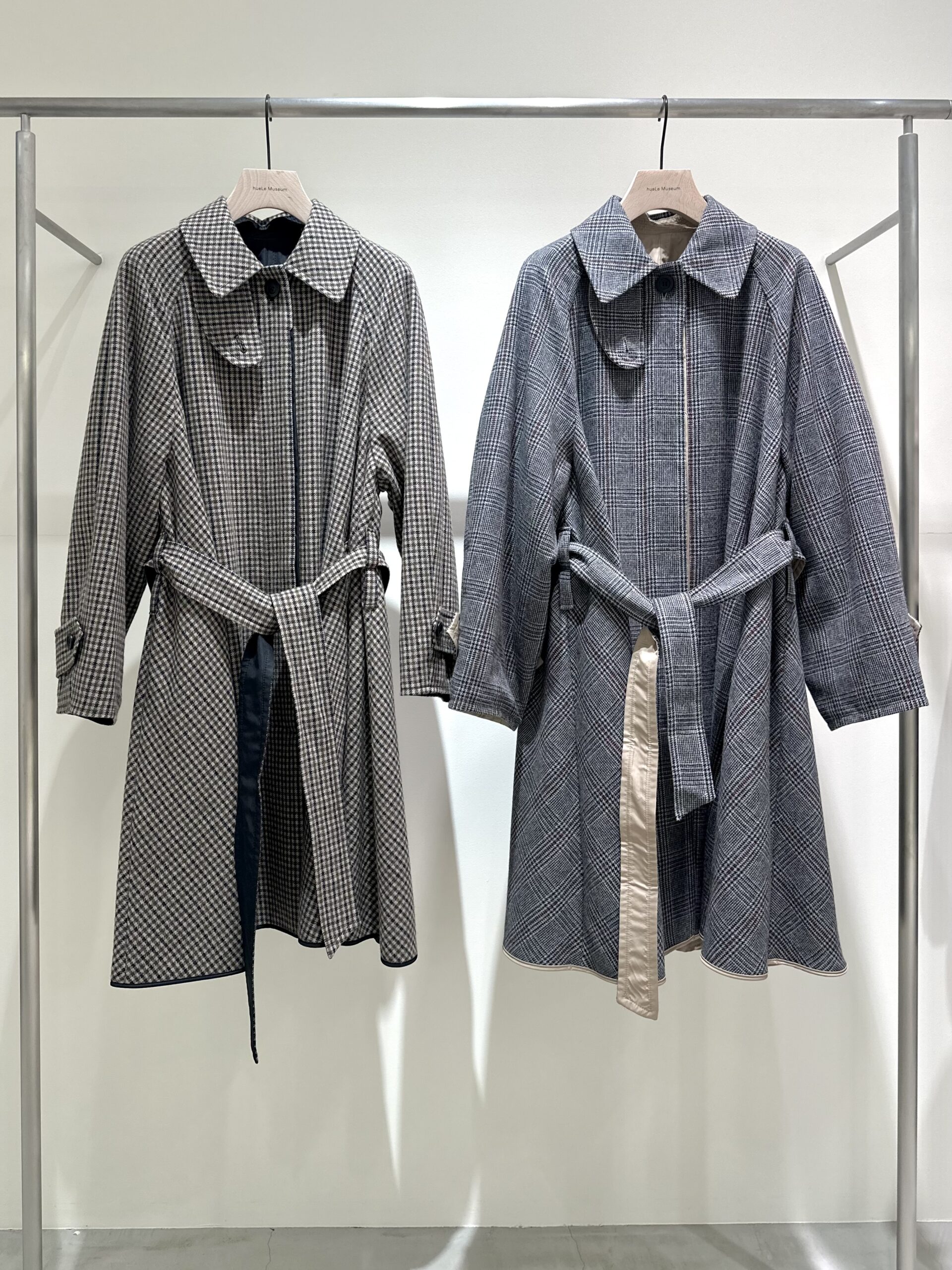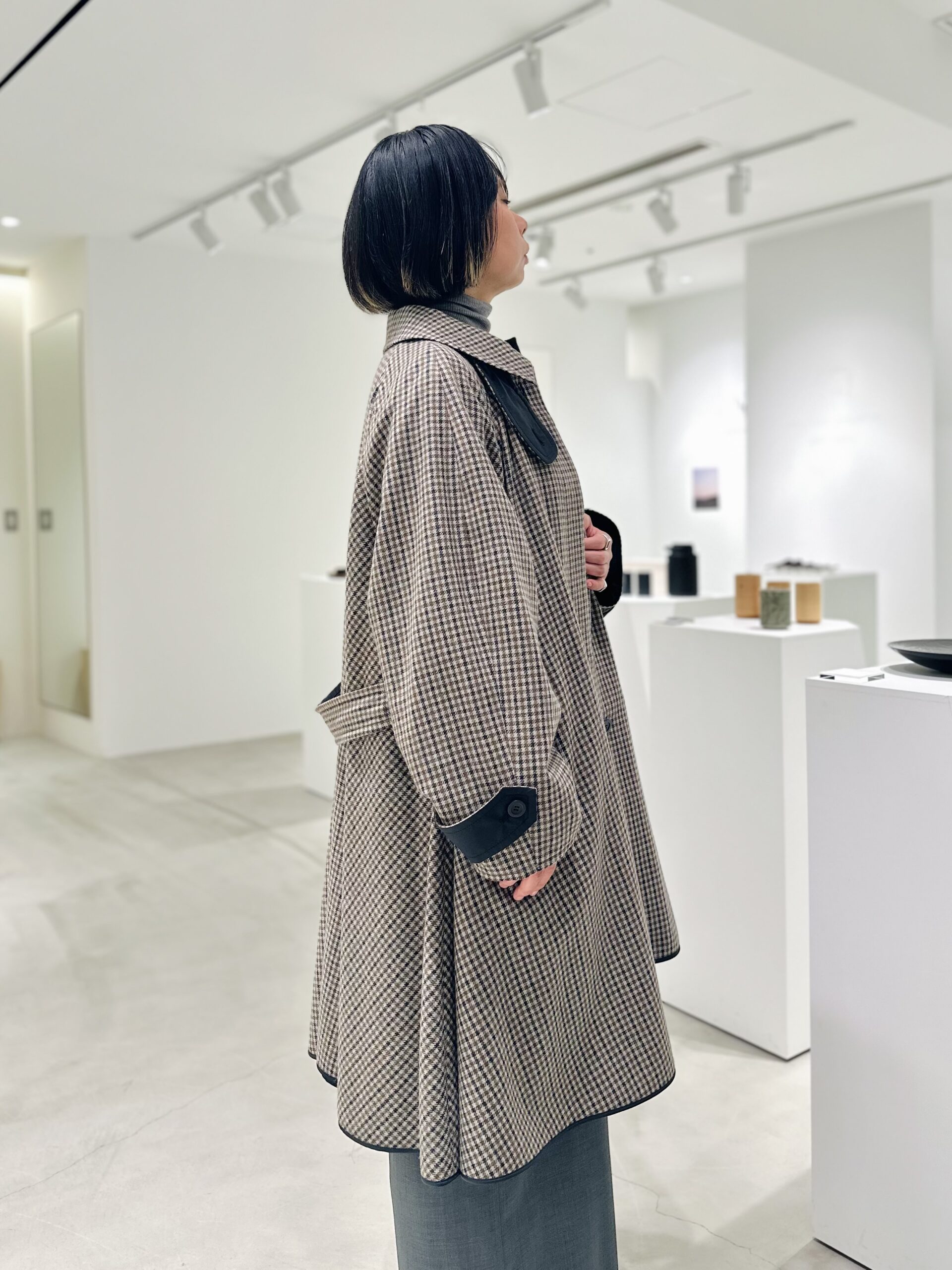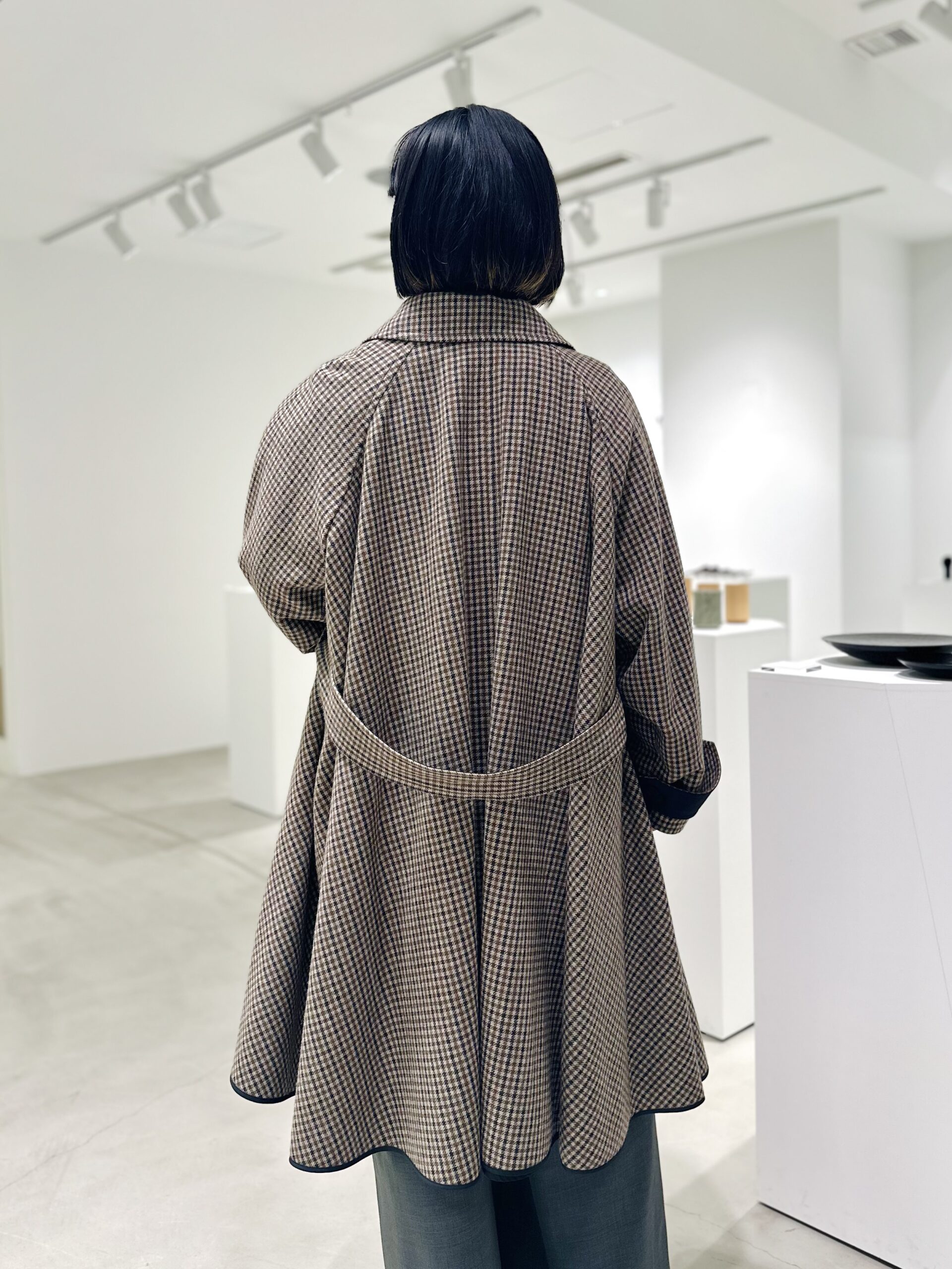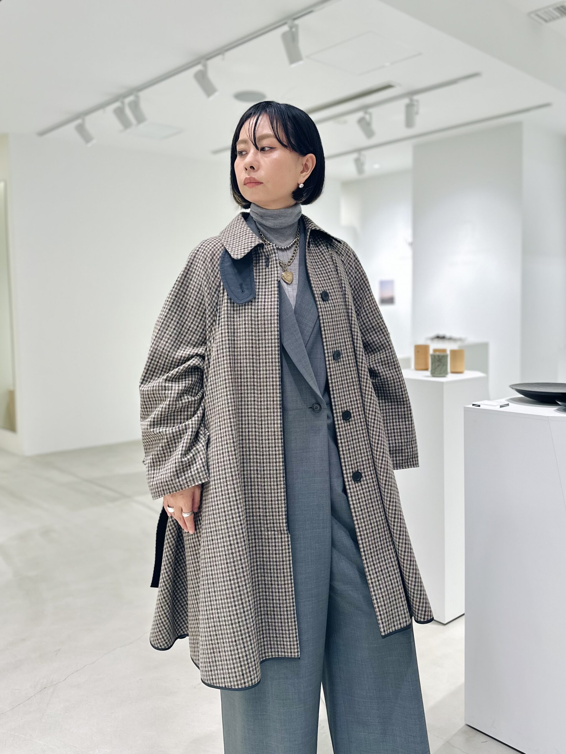 ラグランスリーブと特徴的な襟元を持つクラシカルな“バルマカーンコート”で、表地はウールのグレンチェック、裏地はポリエステルの単色でリバーシブルに使えるのも魅力。サーキュラーのように広がる身頃は、ベルトを外すと、とってもドラマチックな動きが生まれます。ベルトをキュッと締めればドレッシーな印象になり、マスキュリンなアイテムながら、フェミニンさも感じられるコートです。