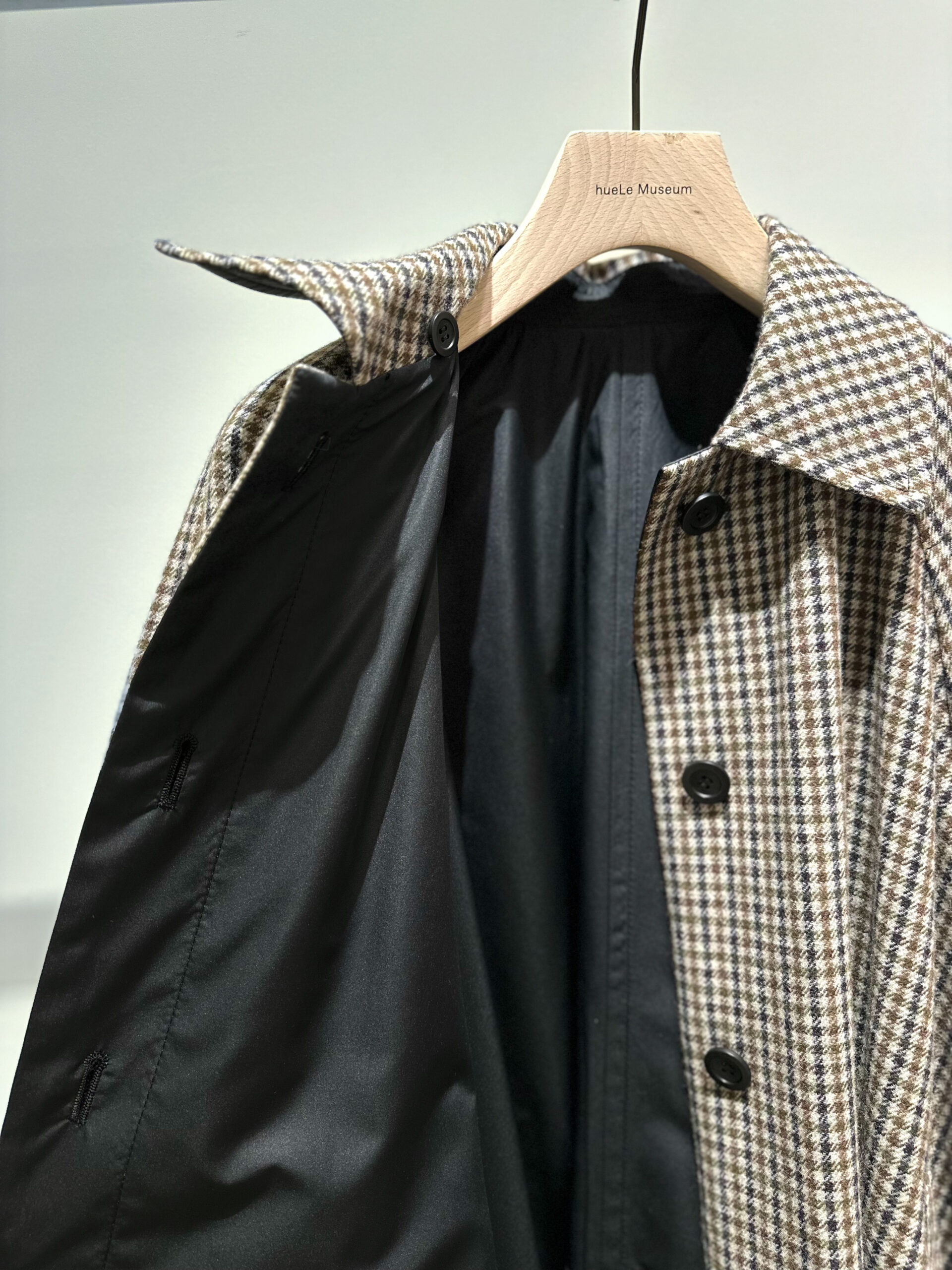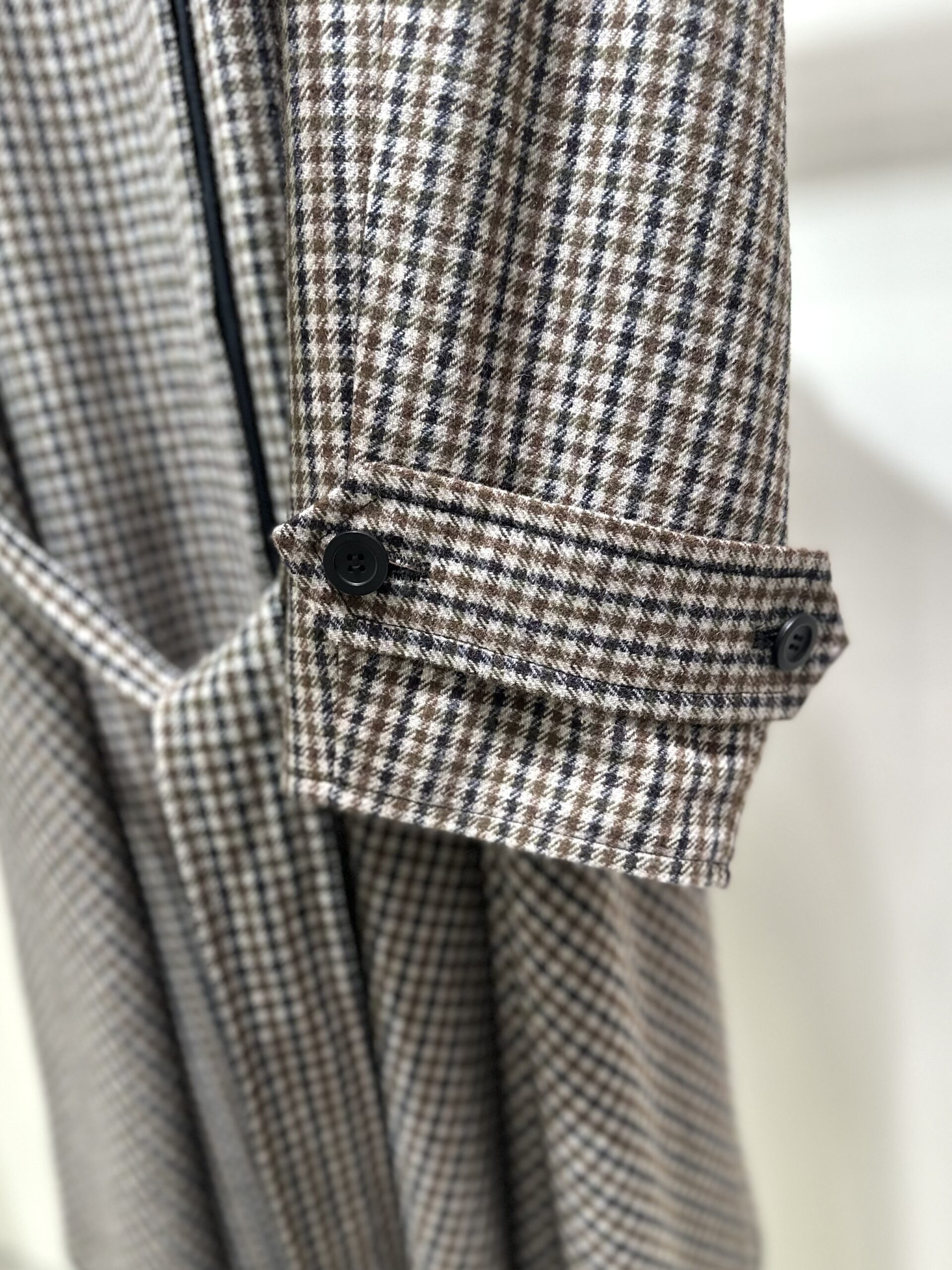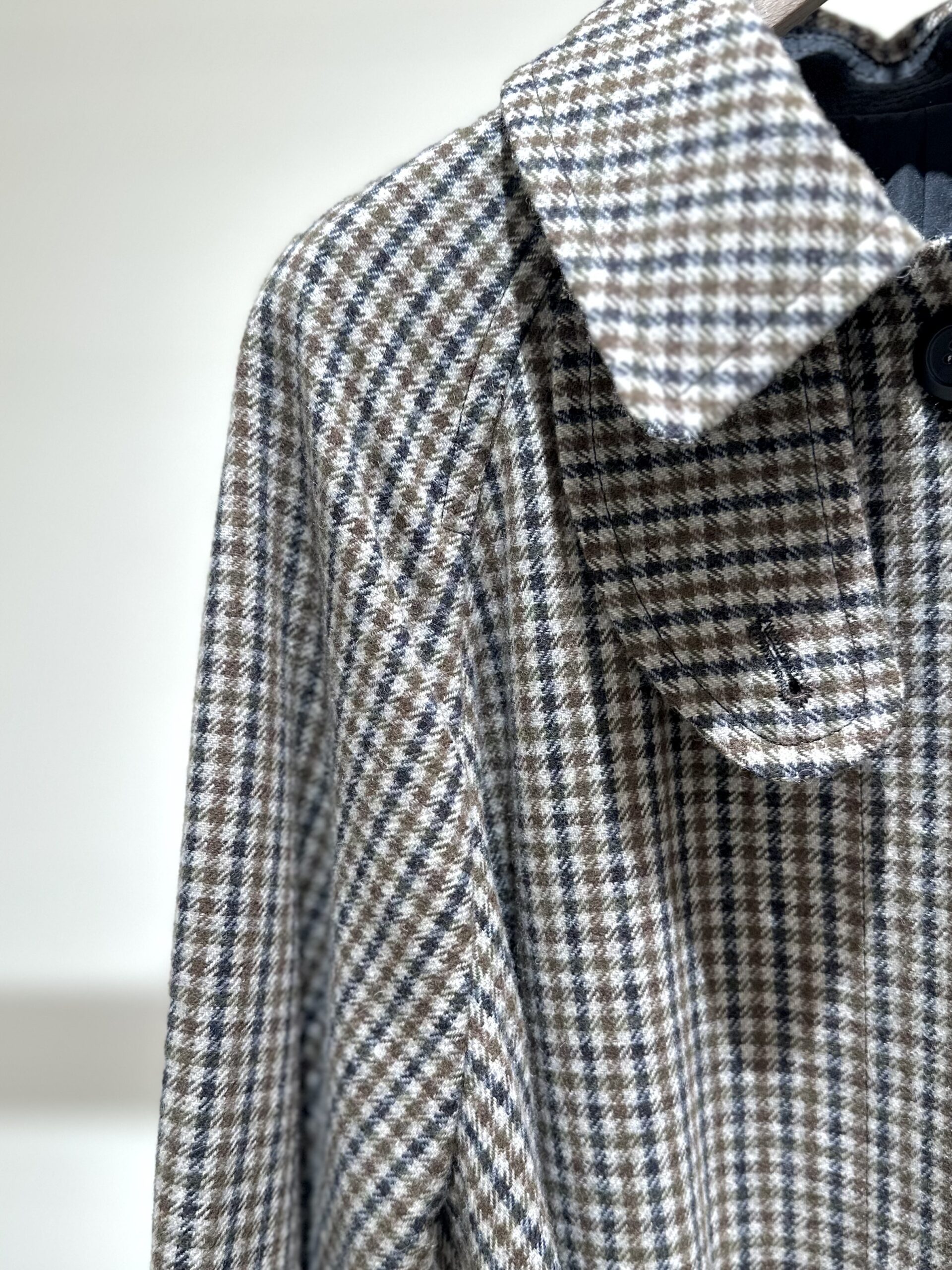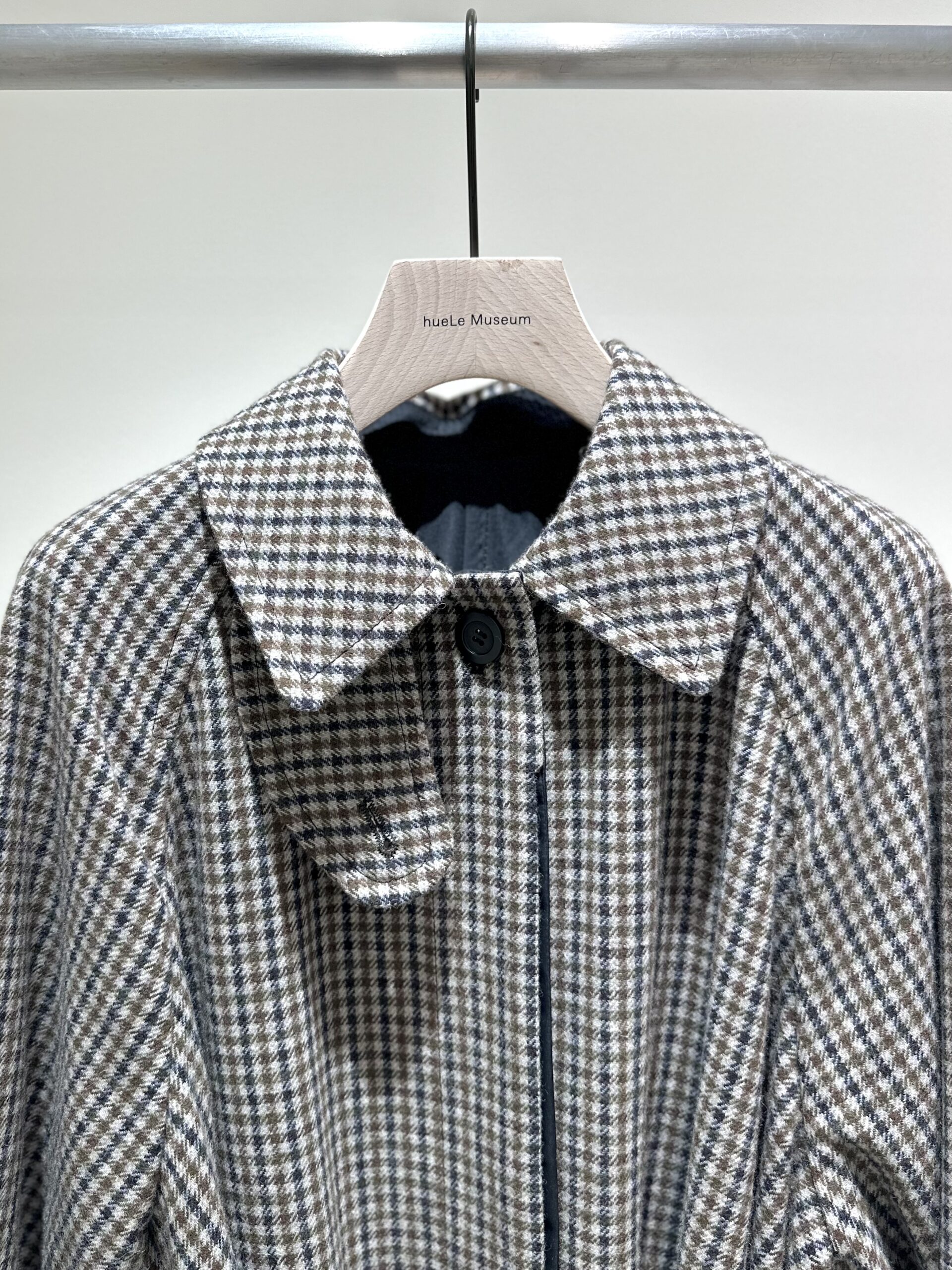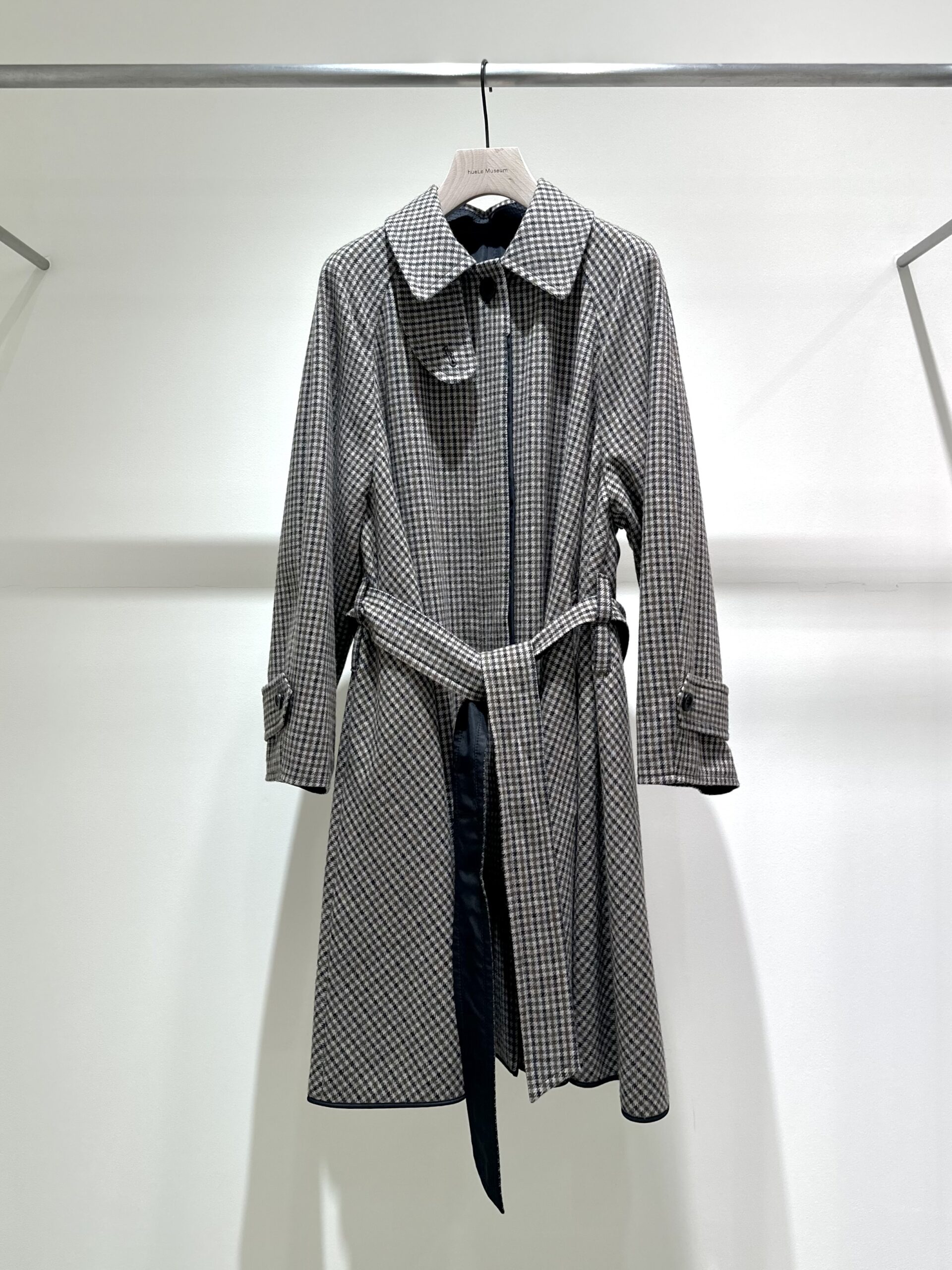 ラグランスリーブと特徴的な襟元を持つクラシカルな“バルマカーンコート”で、表地はウールのグレンチェック、裏地はポリエステルの単色でリバーシブルに使えるのも魅力。サーキュラーのように広がる身頃は、ベルトを外すと、とってもドラマチックな動きが生まれます。ベルトをキュッと締めればドレッシーな印象になり、マスキュリンなアイテムながら、フェミニンさも感じられるコートです。
