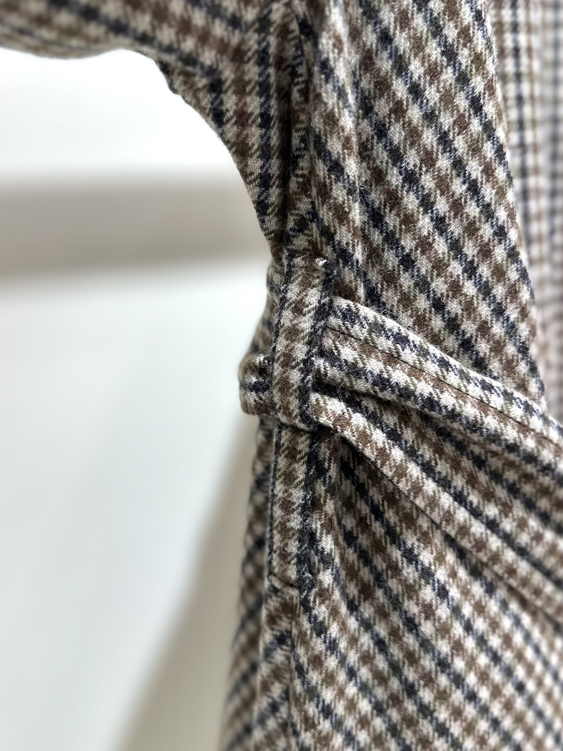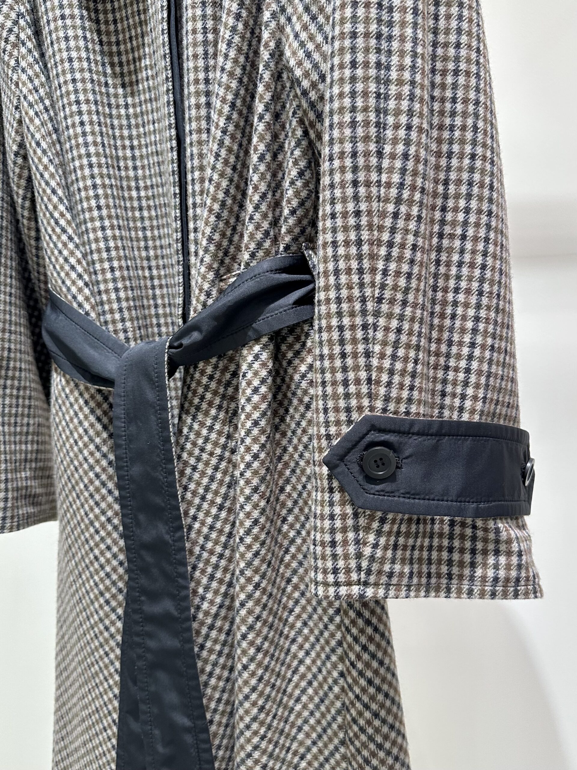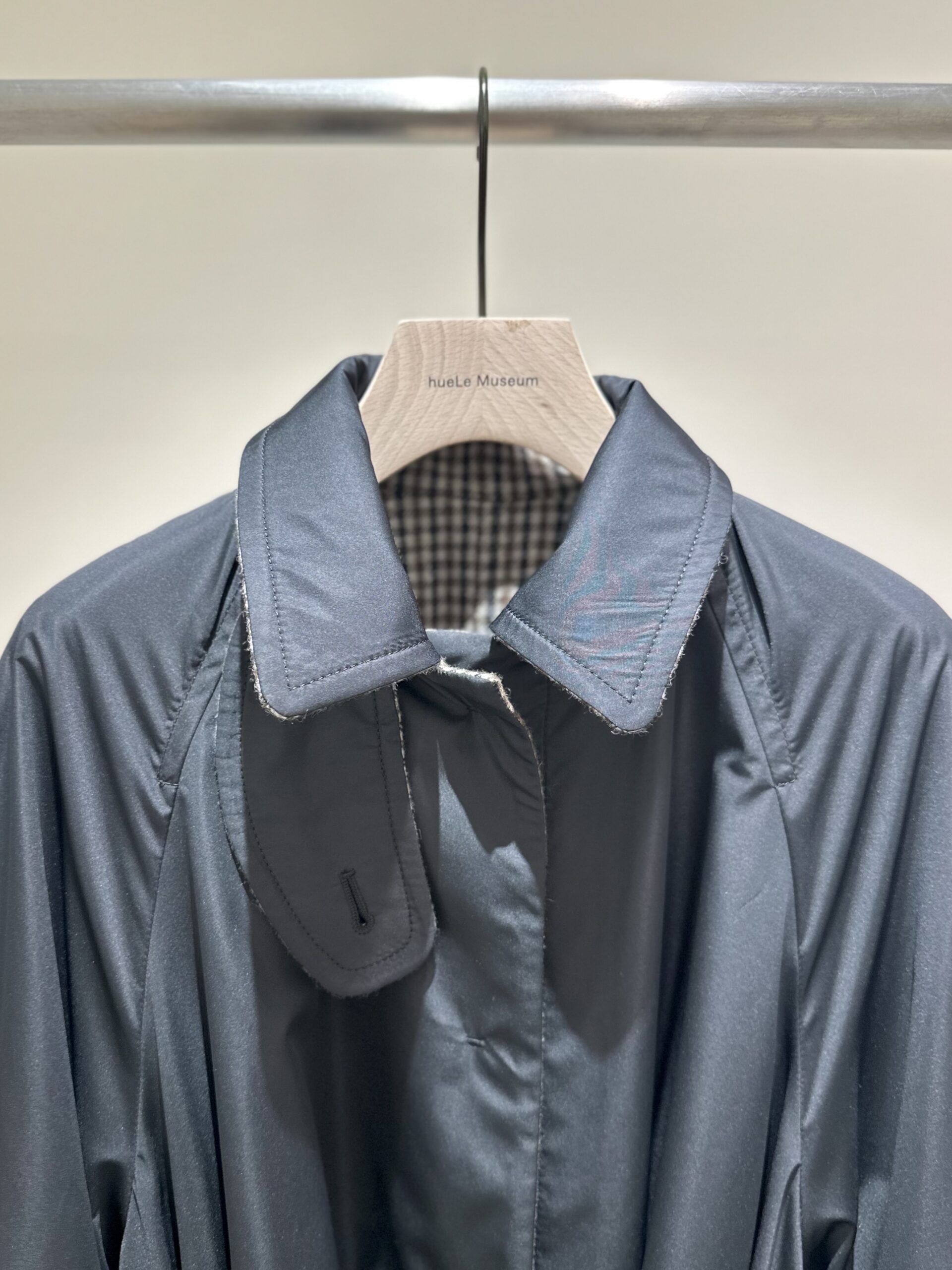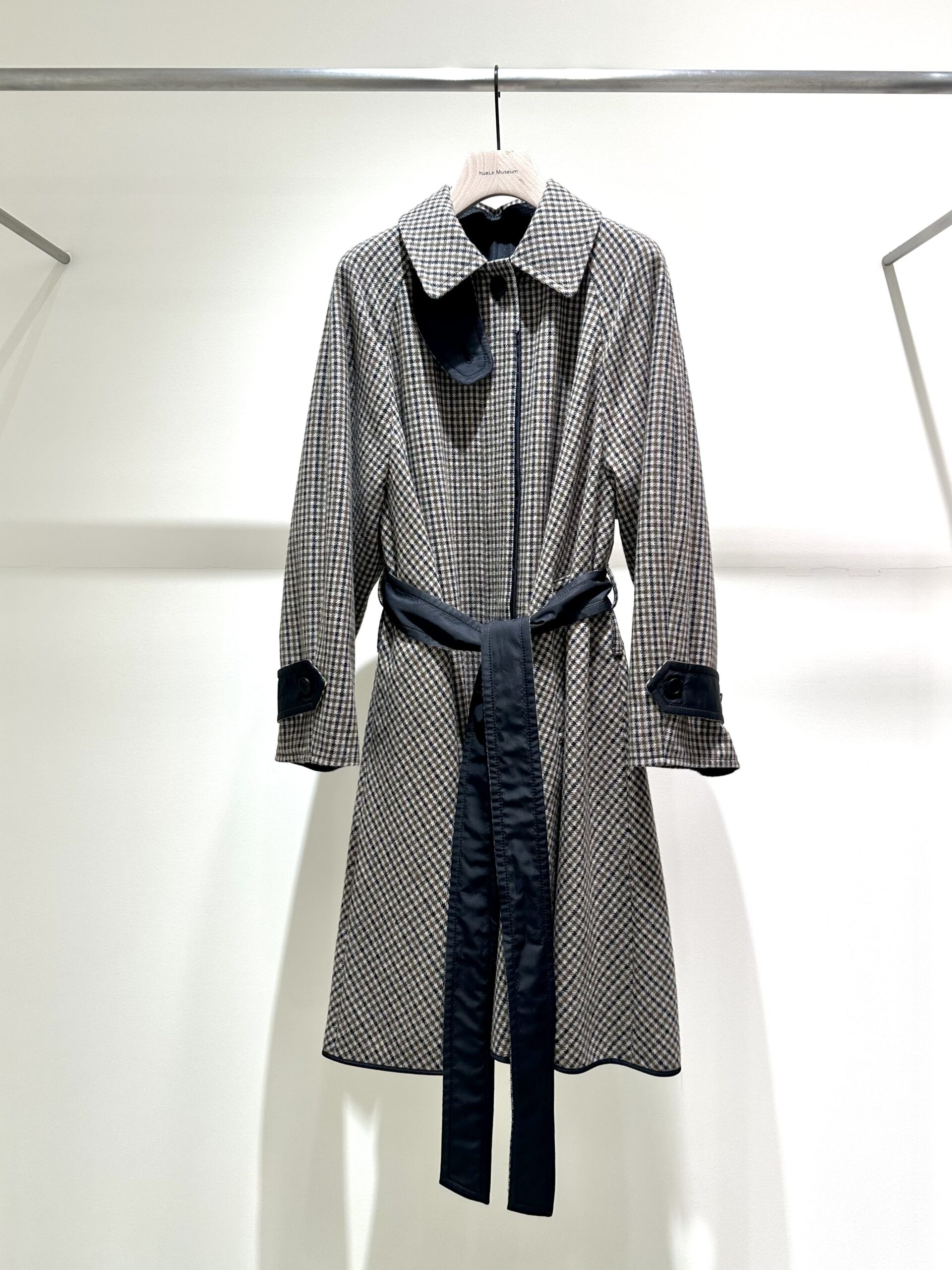 ラグランスリーブと特徴的な襟元を持つクラシカルな“バルマカーンコート”で、表地はウールのグレンチェック、裏地はポリエステルの単色でリバーシブルに使えるのも魅力。サーキュラーのように広がる身頃は、ベルトを外すと、とってもドラマチックな動きが生まれます。ベルトをキュッと締めればドレッシーな印象になり、マスキュリンなアイテムながら、フェミニンさも感じられるコートです。