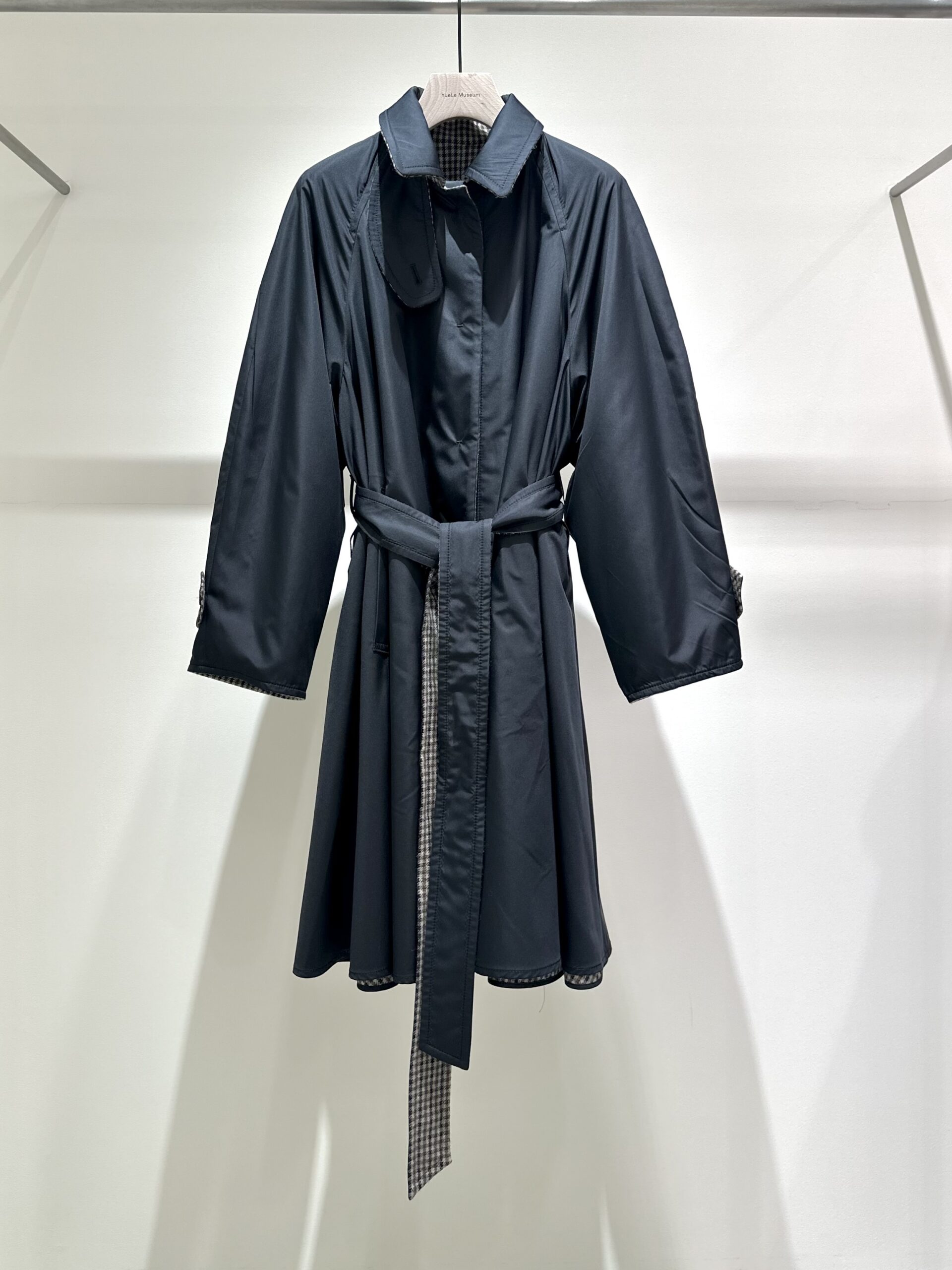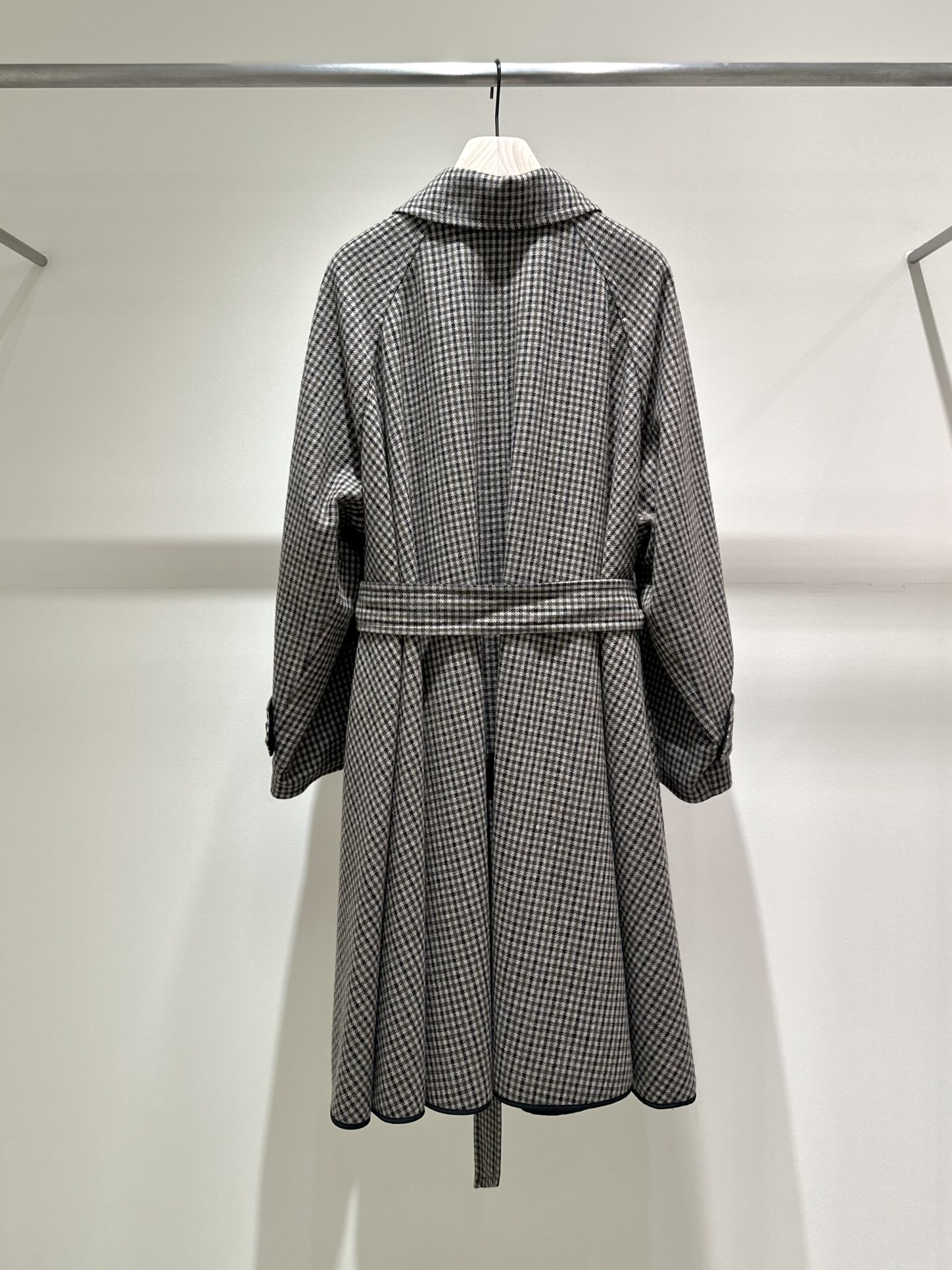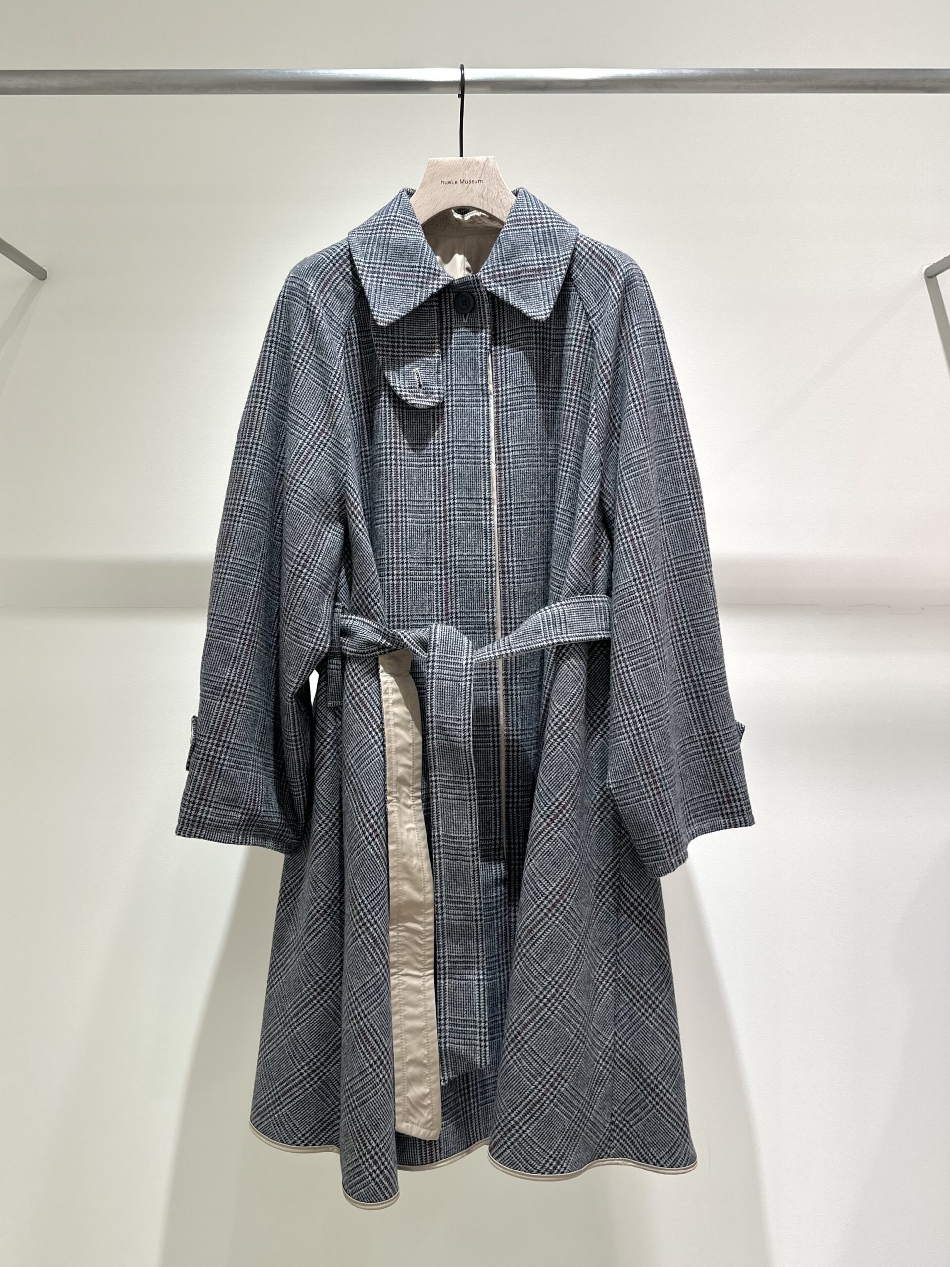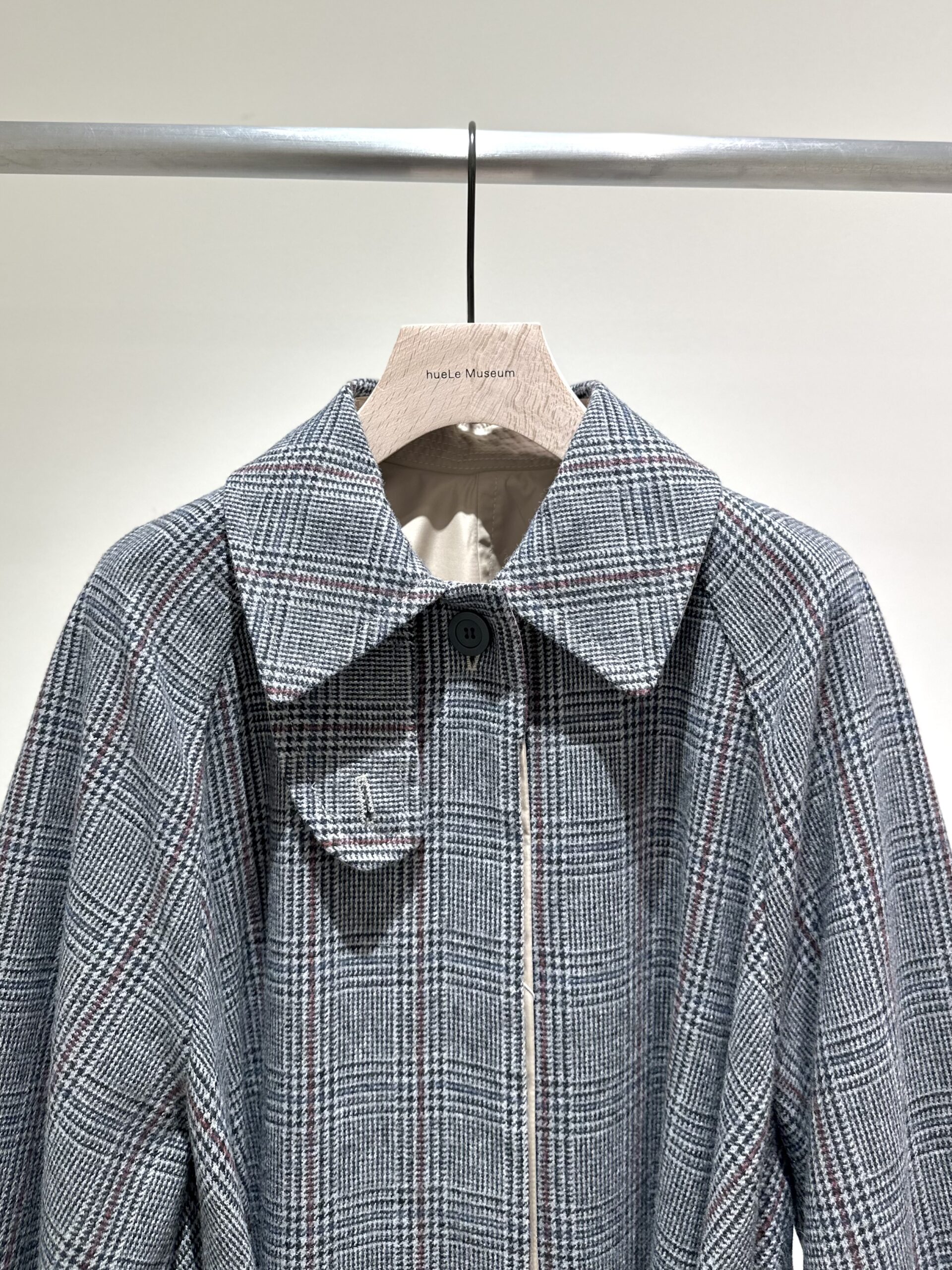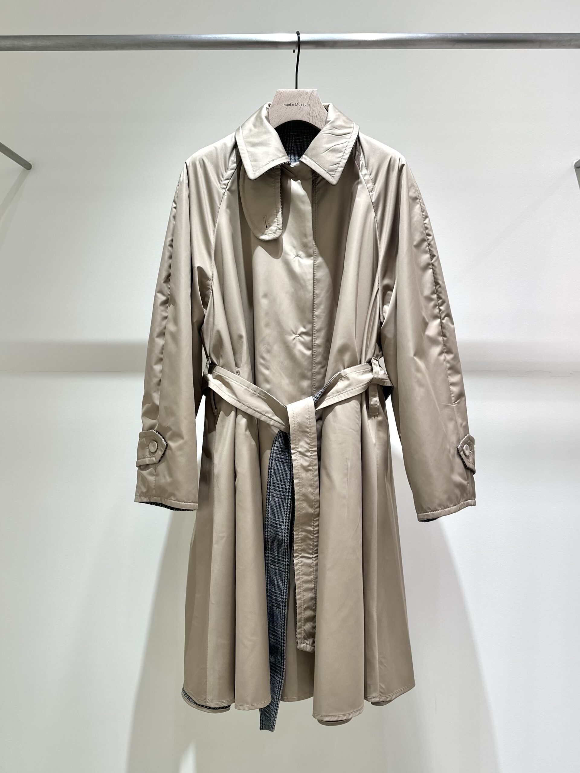 ラグランスリーブと特徴的な襟元を持つクラシカルな“バルマカーンコート”で、表地はウールのグレンチェック、裏地はポリエステルの単色でリバーシブルに使えるのも魅力。サーキュラーのように広がる身頃は、ベルトを外すと、とってもドラマチックな動きが生まれます。ベルトをキュッと締めればドレッシーな印象になり、マスキュリンなアイテムながら、フェミニンさも感じられるコートです。