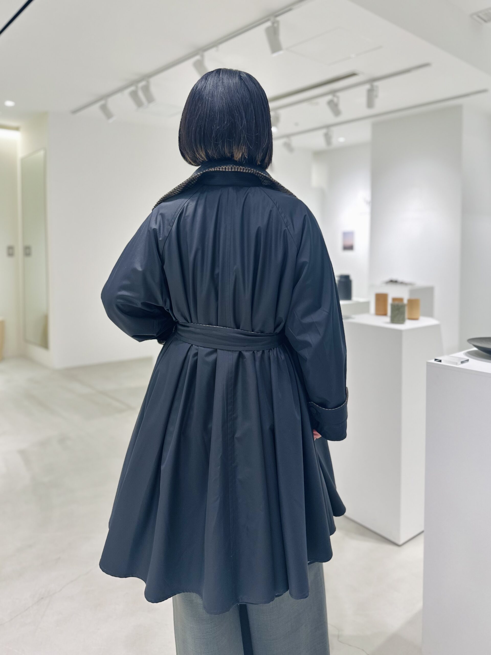 そして、個人的にこのコートの1番のポイントは、裾のパイピングではないかと思っていて、たっぷりとした生地が生み出すひだの美しさや、軽やかな動きは、これがあってこそ! 一層の華やかさとエレガントさを演出してくれます。この一手間には、並々ならぬこだわりを感じます。