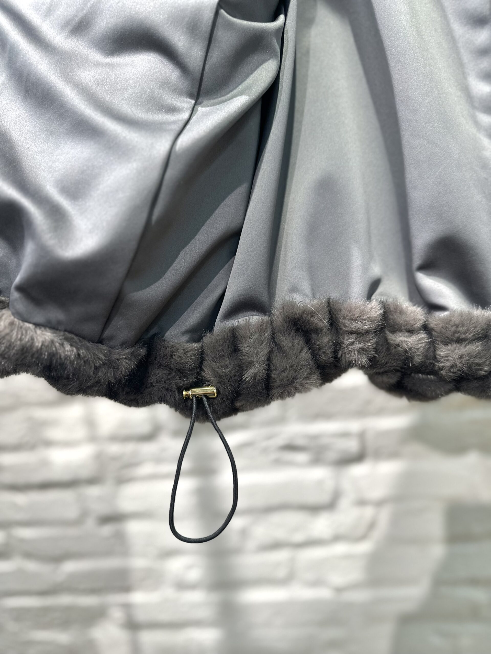 今回たくさんのサンプルの中から、真っ先にピックアップしたのが、まるでミンクファーのような、フカフカなアウター♡ 着膨れしないように、身頃の幅・丈と、毛のボリュームのバランスが考え抜かれたシルエットに。襟の立ち上がりも、温かさだけでなく、顔がすっきり見えるように計算された形なんだそう。裾はドローストリングで絞れば、丈や形の調節も可能です。