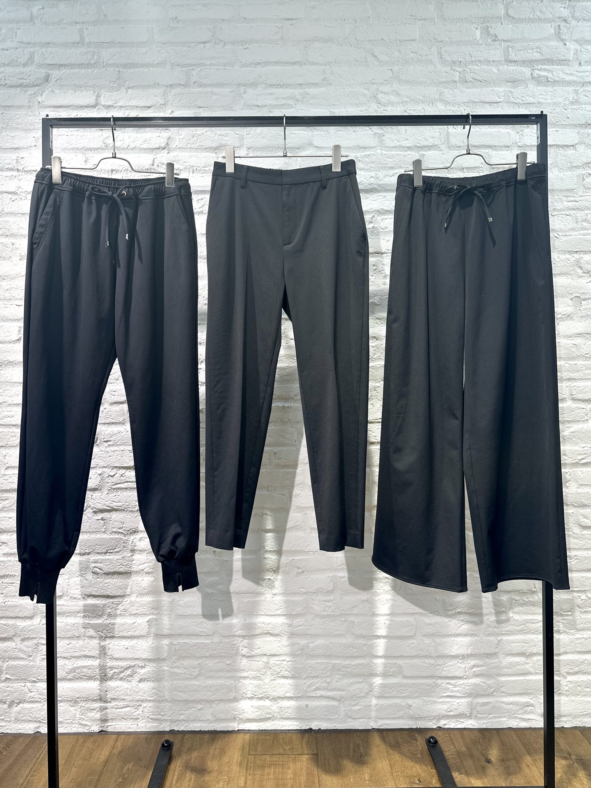 パンツ・左(ハイテンション裏起毛ジョガーパンツ) ¥16,500、パンツ・中(ウォームツイルストレッチテーパードパンツ) ¥15,400、パンツ・右(ウォームツイルストレッチワイドパンツ・着用) ¥16,500/バーンヤードストーム(エレメントルール)