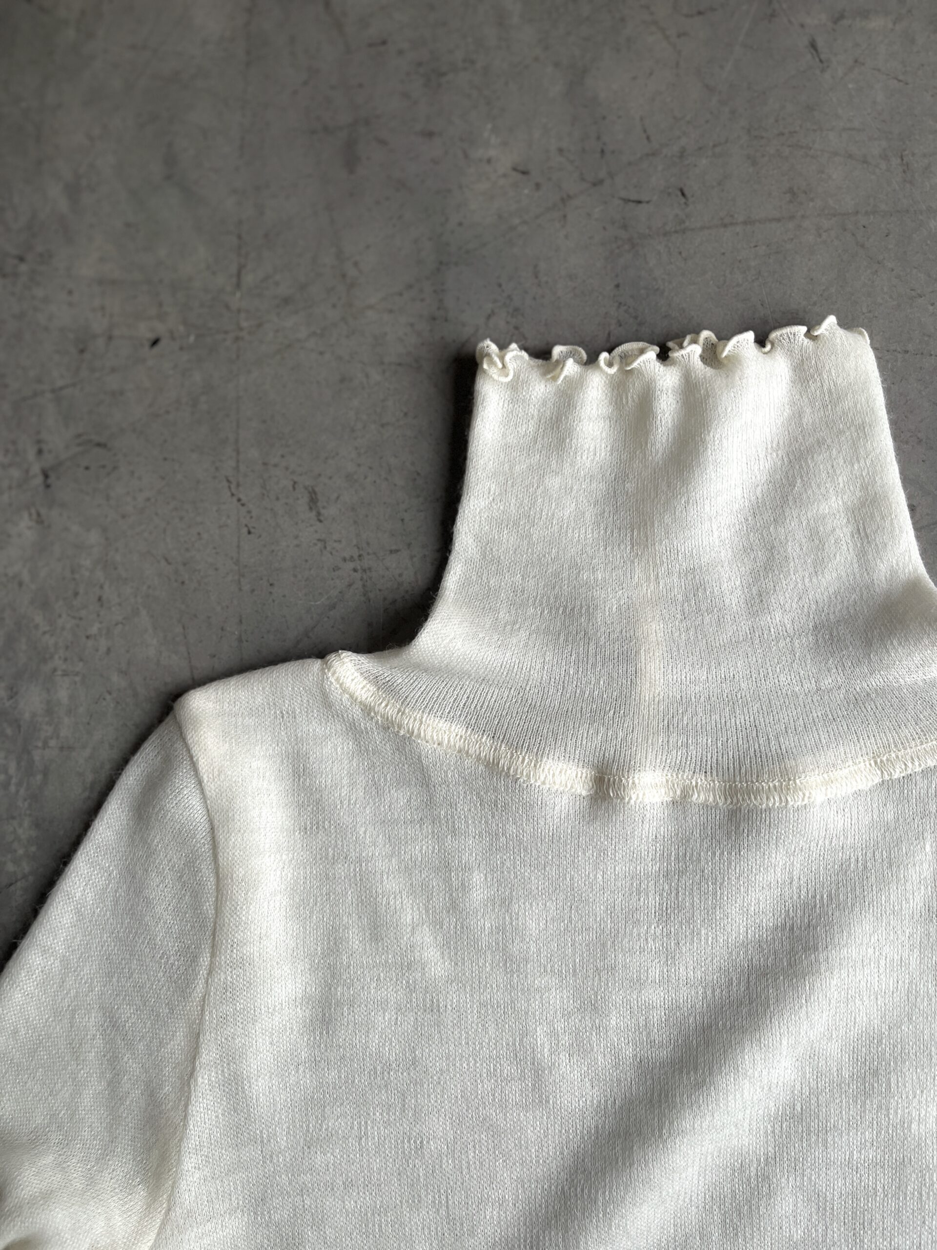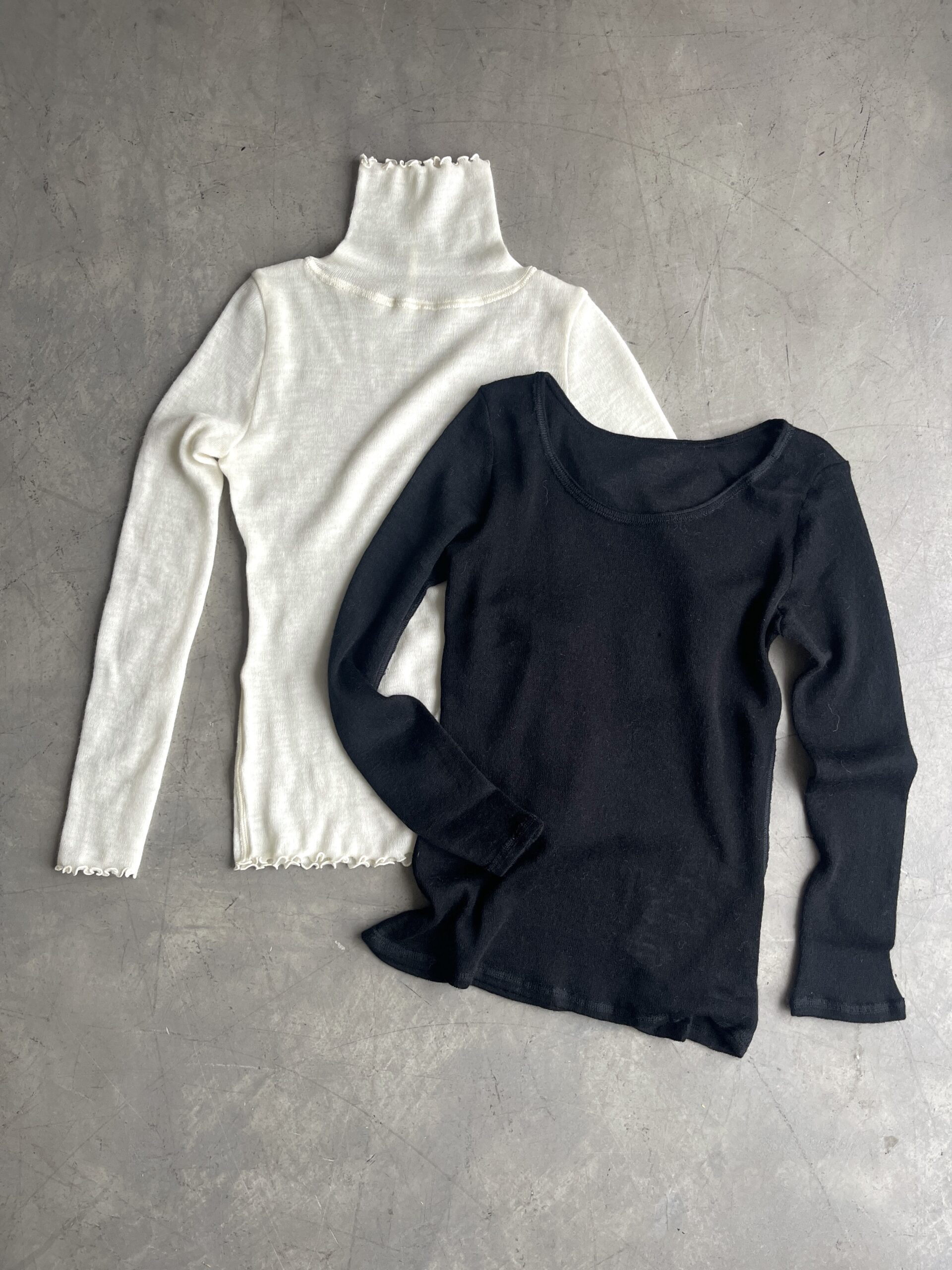 レギンス、腹巻きパンツ、タートルニット、ニットは、ベビーアルパカの中でもさらに希少な『ロイヤルベビーアルパカ』を使用。なんと、全アルパカの中でも1%ほどしか取れない、細く柔らかな高級素材。通常はその滑らかさと光沢を生かし、高級ニットやマフラー、コートに使われることが多いのですが、なんと贅沢にインナーに採用! ロイヤルベビーアルパカの糸は非常に繊細なため、コットン糸の3倍の時間をかけてゆっくり編み上げ、自然乾燥で仕上げることで、軽く暖かく柔らかな生地に。縫い目を裏側にして肌あたりを良くしたり、伸縮性のある生地で締め付け感を最小限にしたりと、着ていることを忘れるほどの快適さ♡