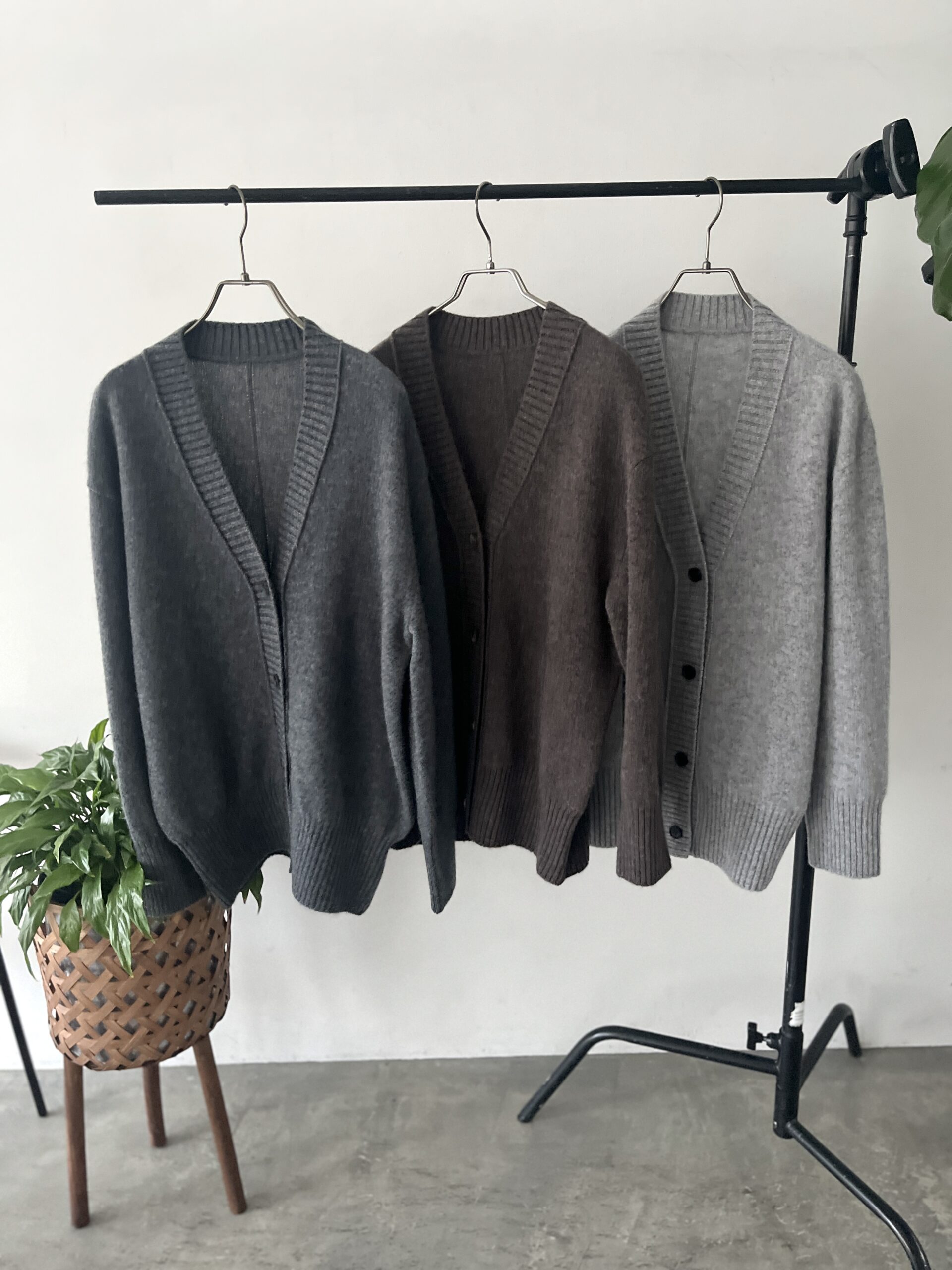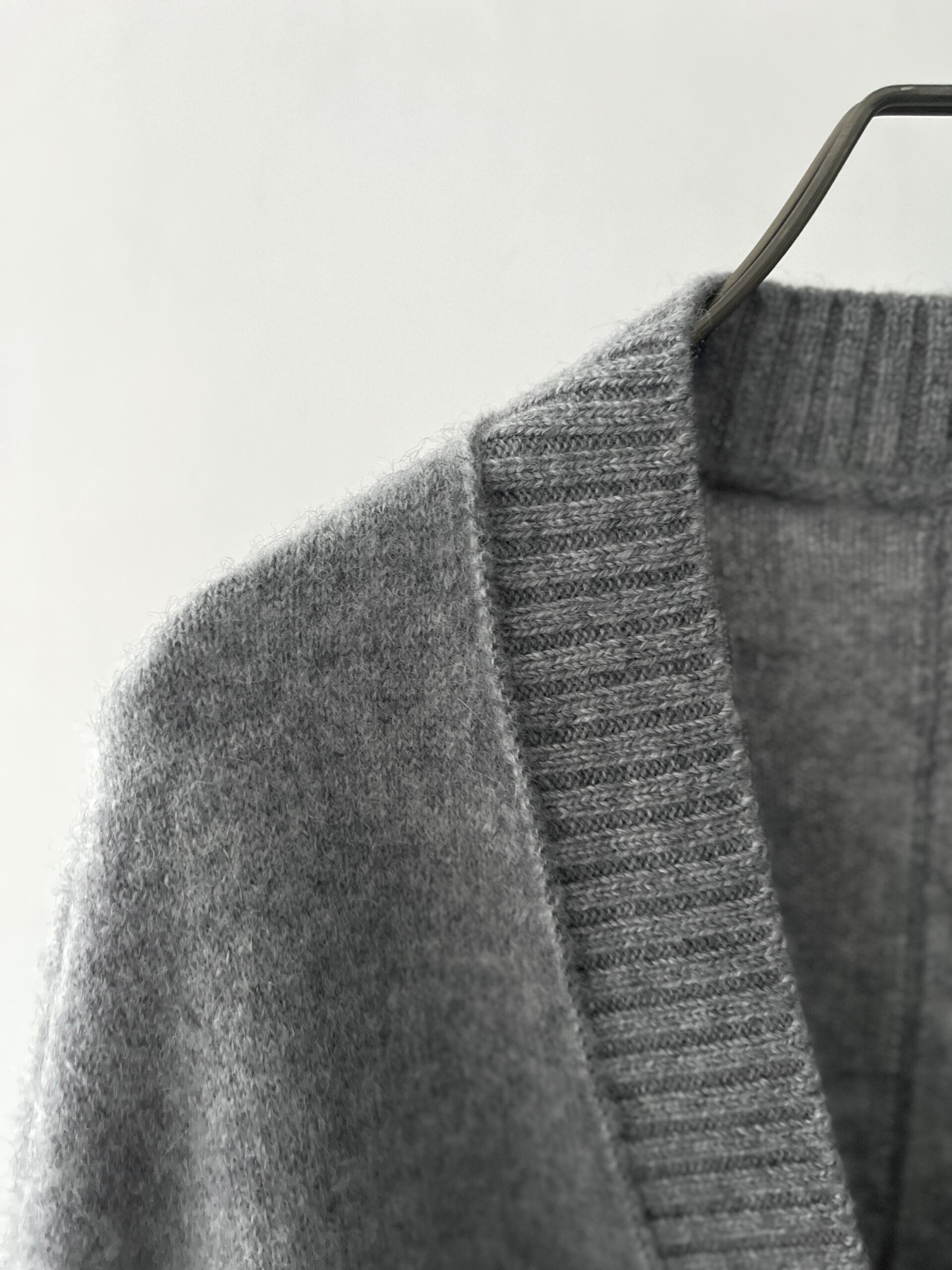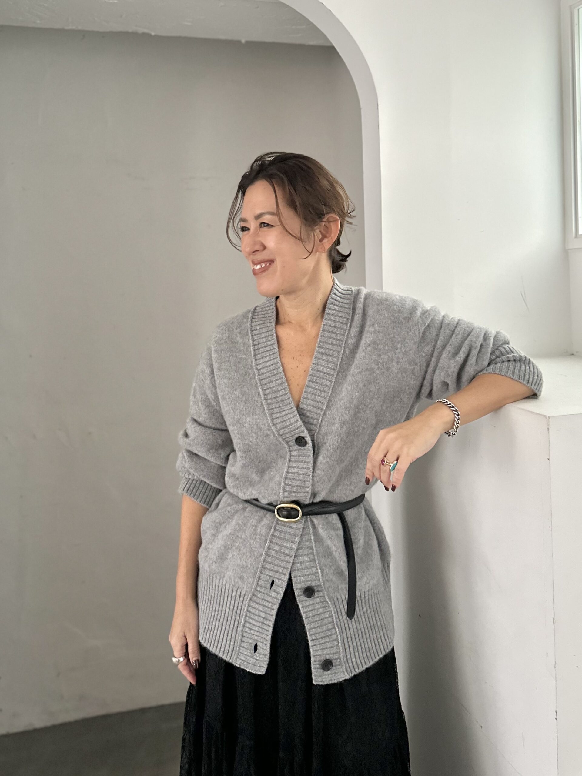 「一枚でもギリギリ着られる、深くシャープな胸の開きが、ふっくらしたニットをクールに見せてくれるカーディガン。たっぷりとしたシルエットなので、寒くなればタートルニットを重ねても。シンプルなデザインで、どんなアイテムとも合わせられる、汎用性の高い一枚です。