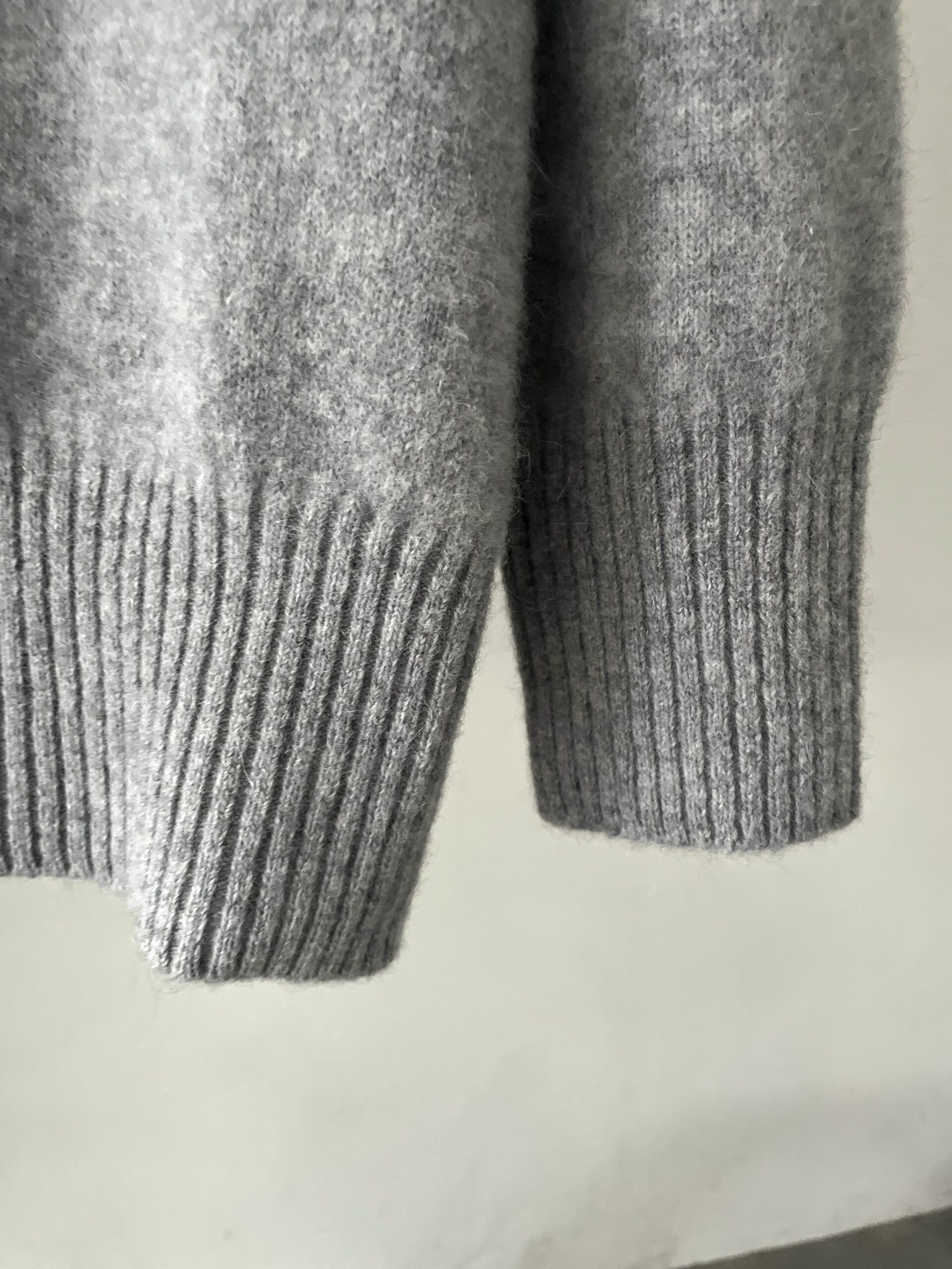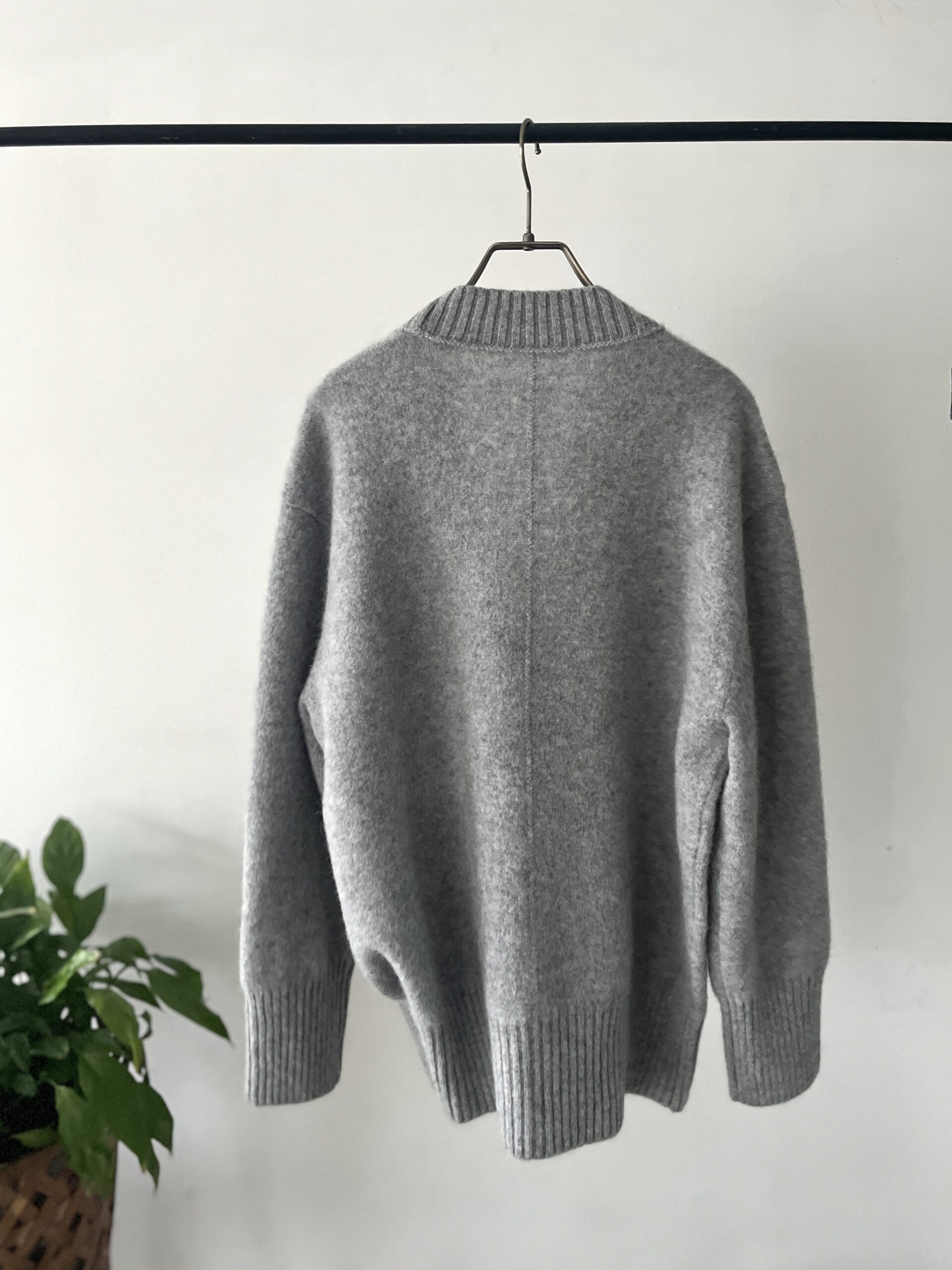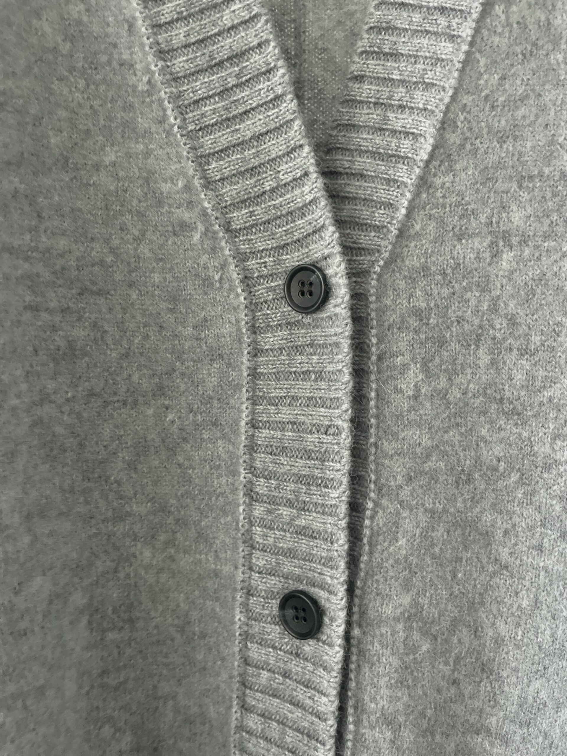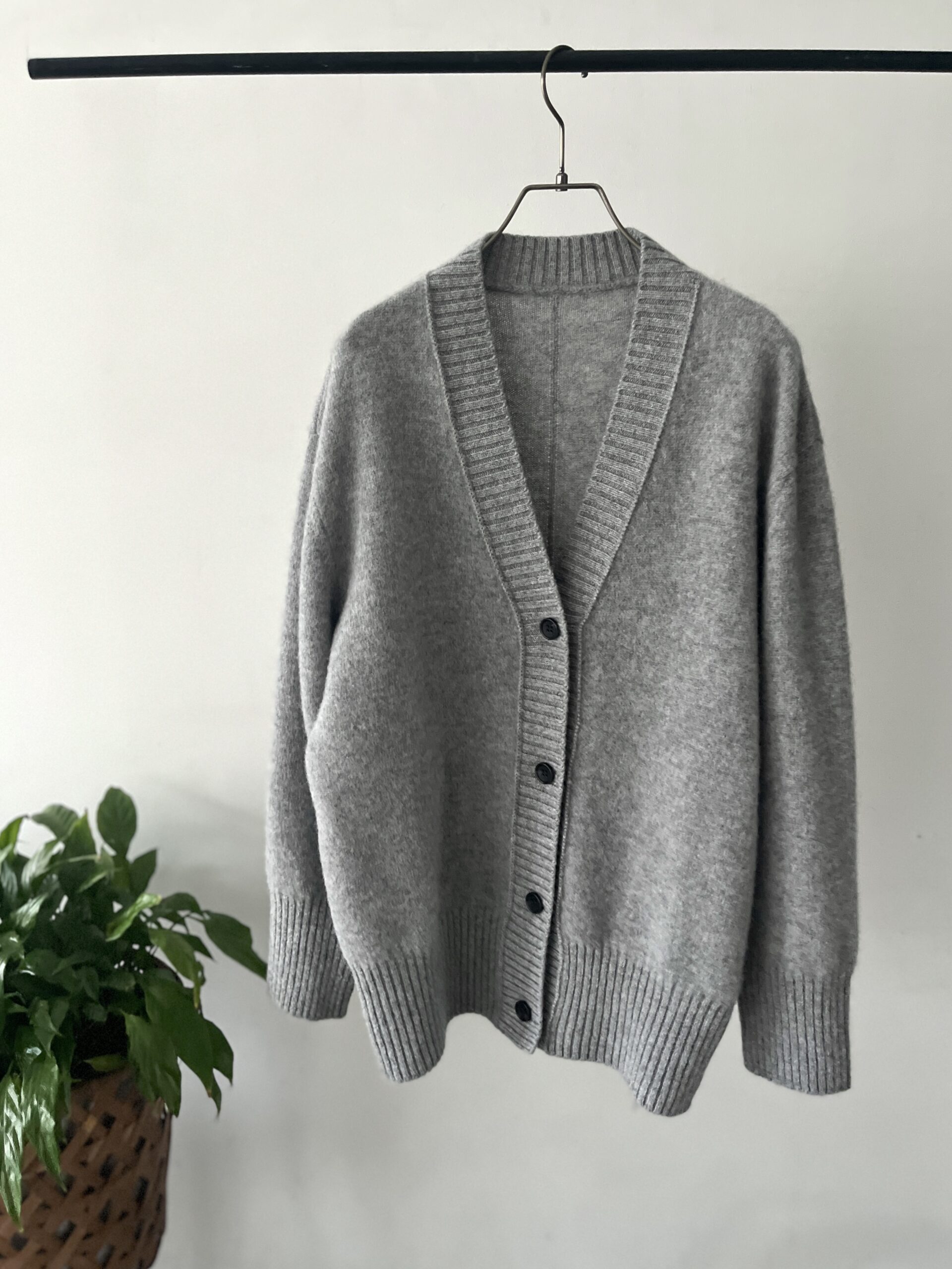 「一枚でもギリギリ着られる、深くシャープな胸の開きが、ふっくらしたニットをクールに見せてくれるカーディガン。たっぷりとしたシルエットなので、寒くなればタートルニットを重ねても。シンプルなデザインで、どんなアイテムとも合わせられる、汎用性の高い一枚です。