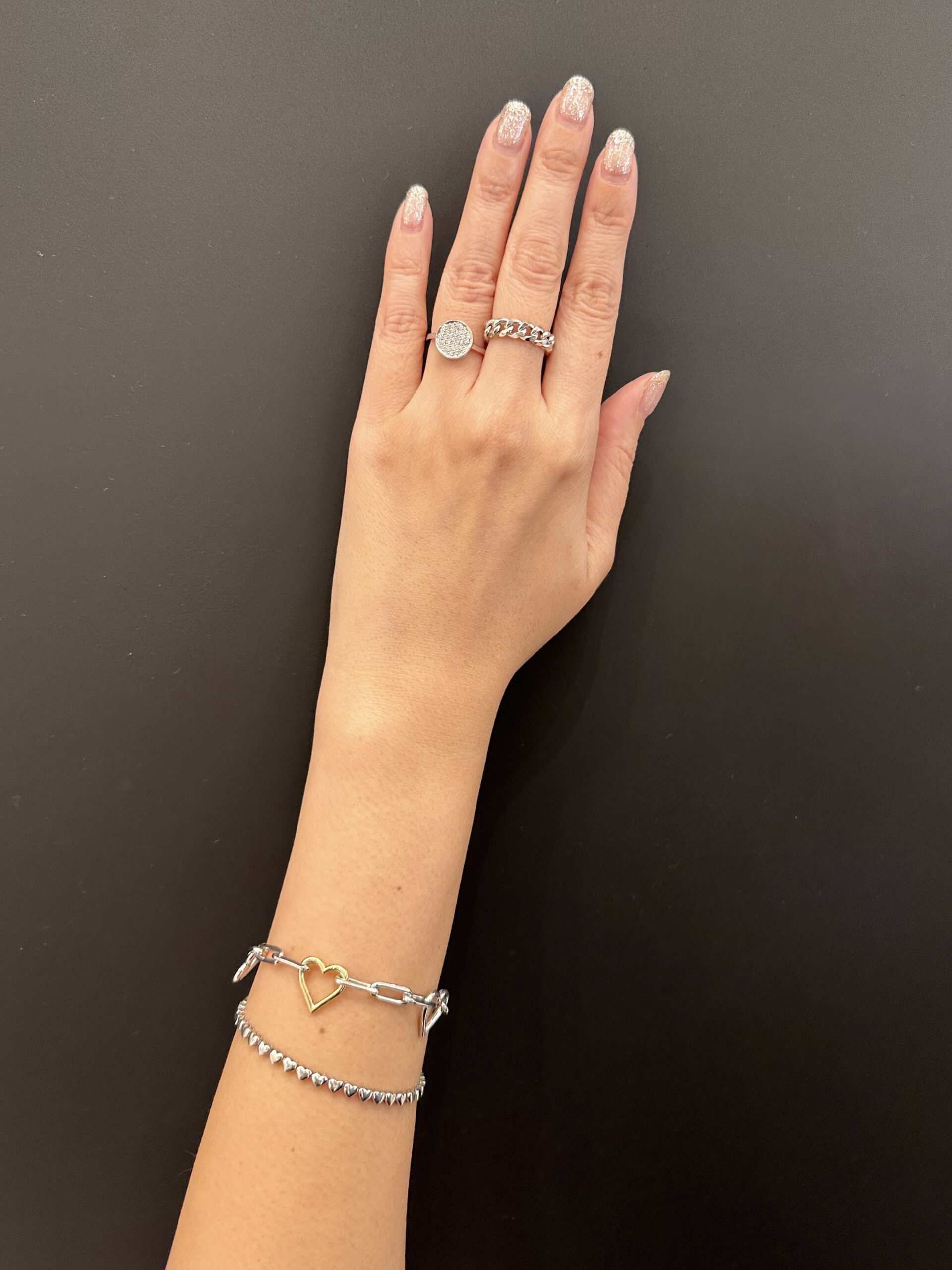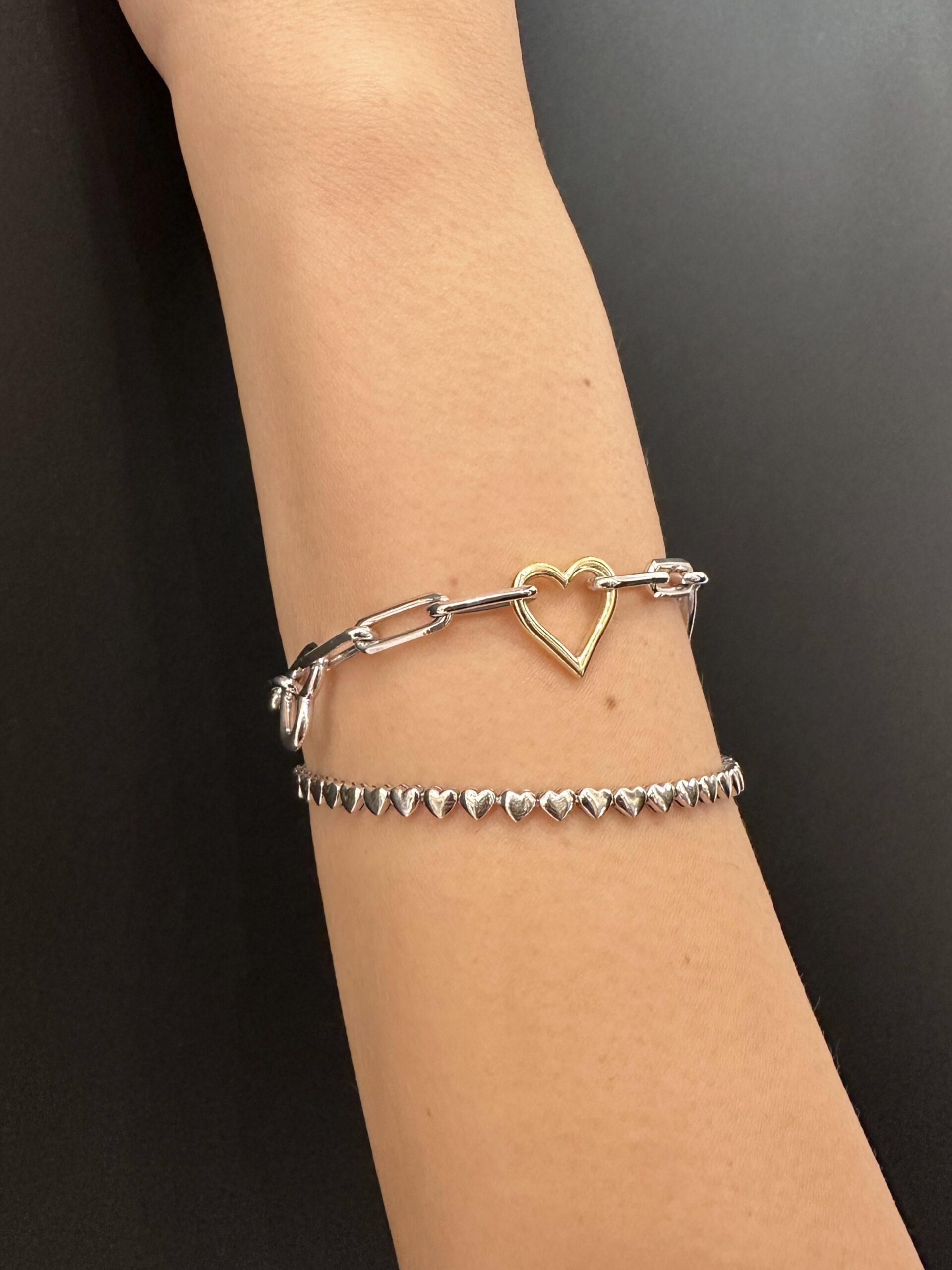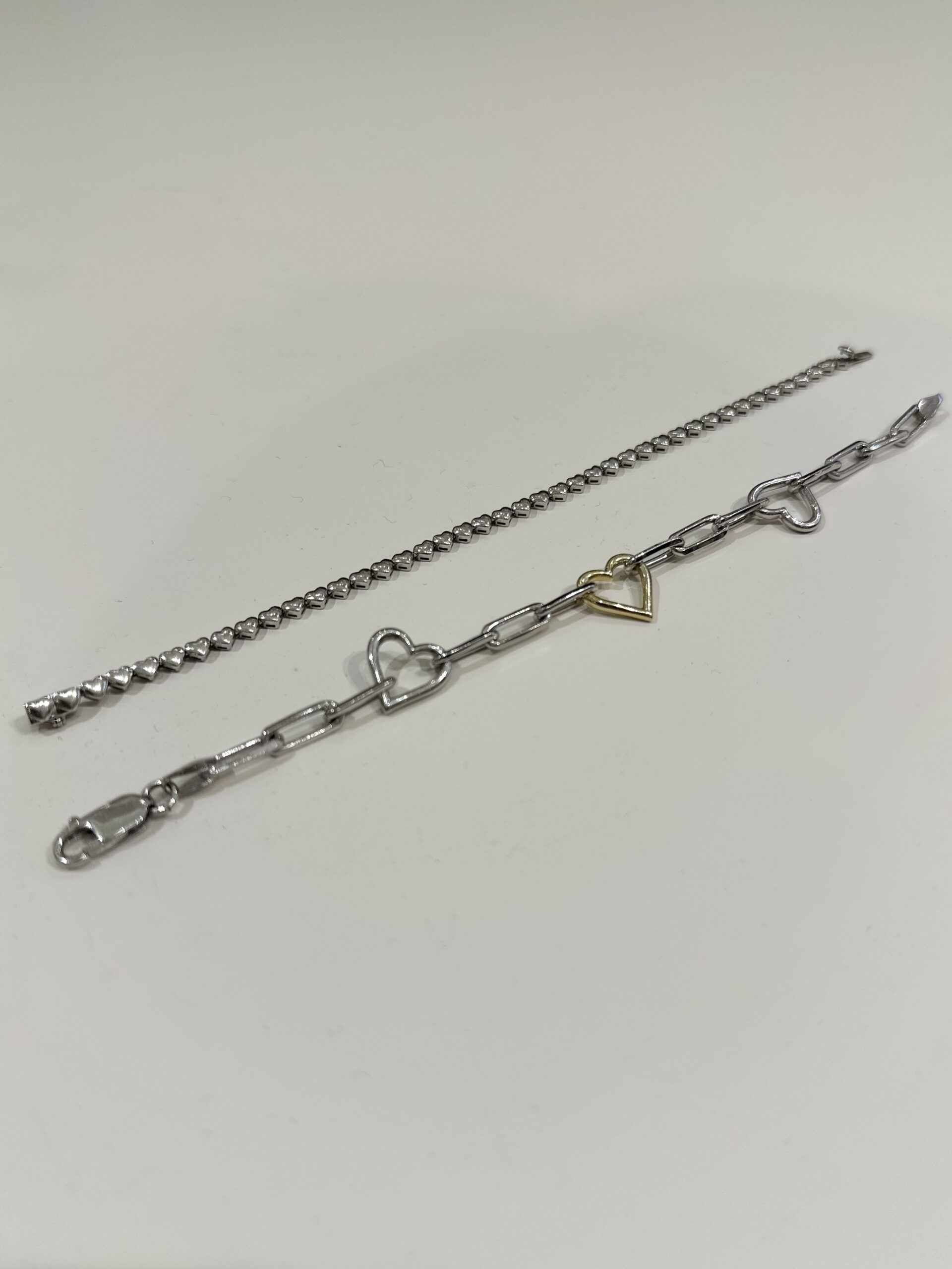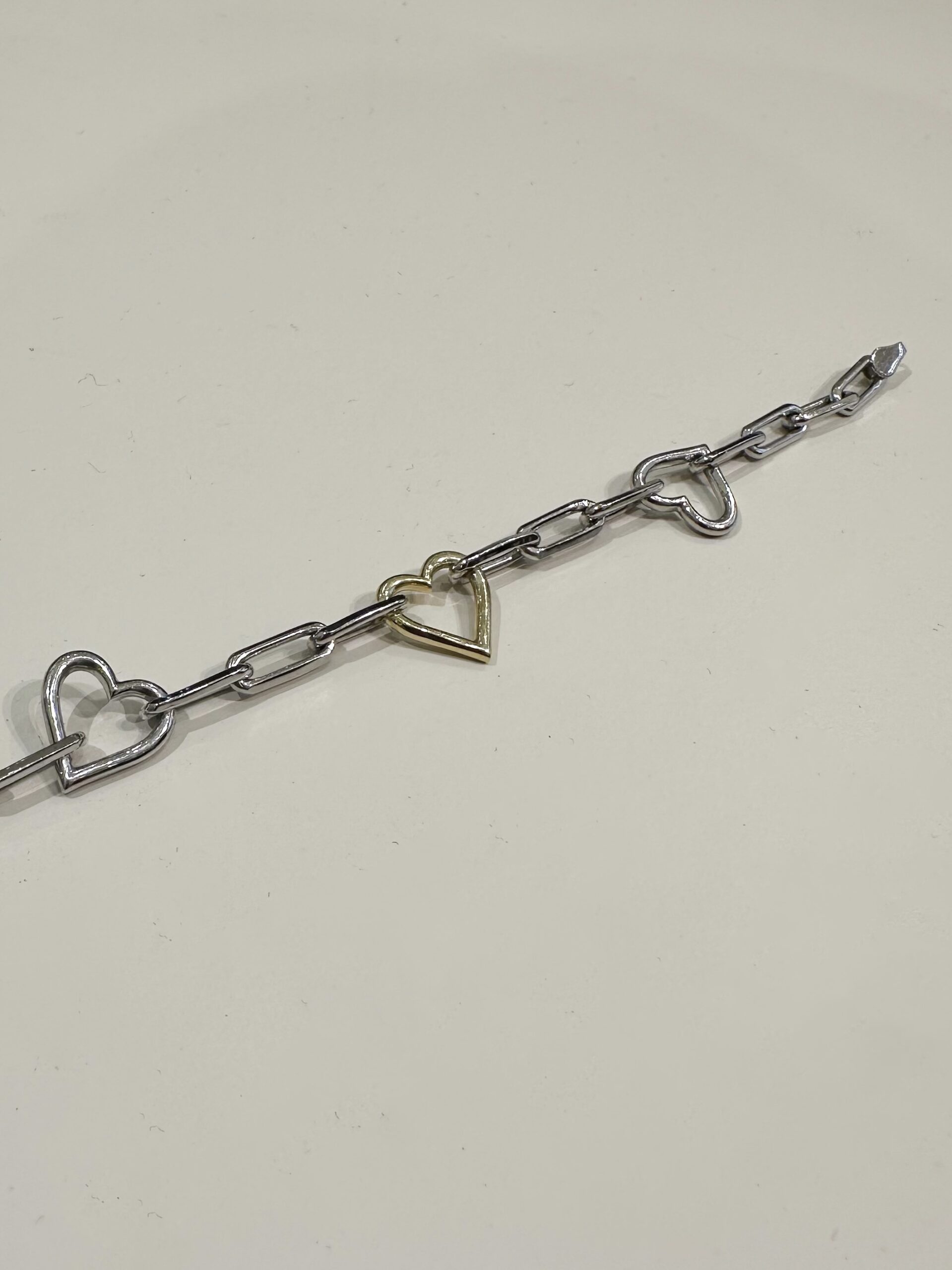 もう一つは、少しハードなチェーンに所々ハートを散りばめたブレスレット。シルバーの中に一つだけゴールドを混ぜ、さりげない華やかさを演出しています。こちらも重ね付けしやすいアイテムです。