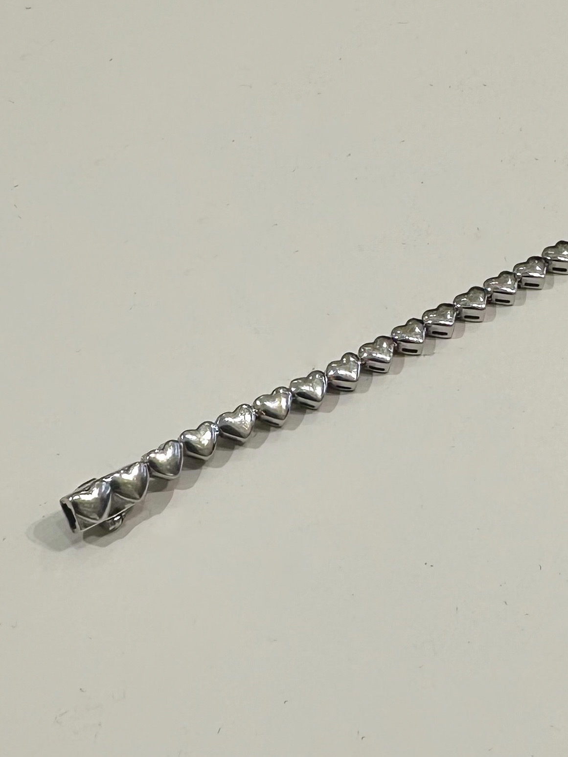 ハートが連なったブレスレットは、一見シンプルなチェーンですが、よく見ると小さなハートが並んでいます。甘くなりすぎず、ポップにもなりすぎない、繊細さを感じるパーツの大きさに仕上げています。他のブレスレットとの重ね付けもしやすいデザインです。