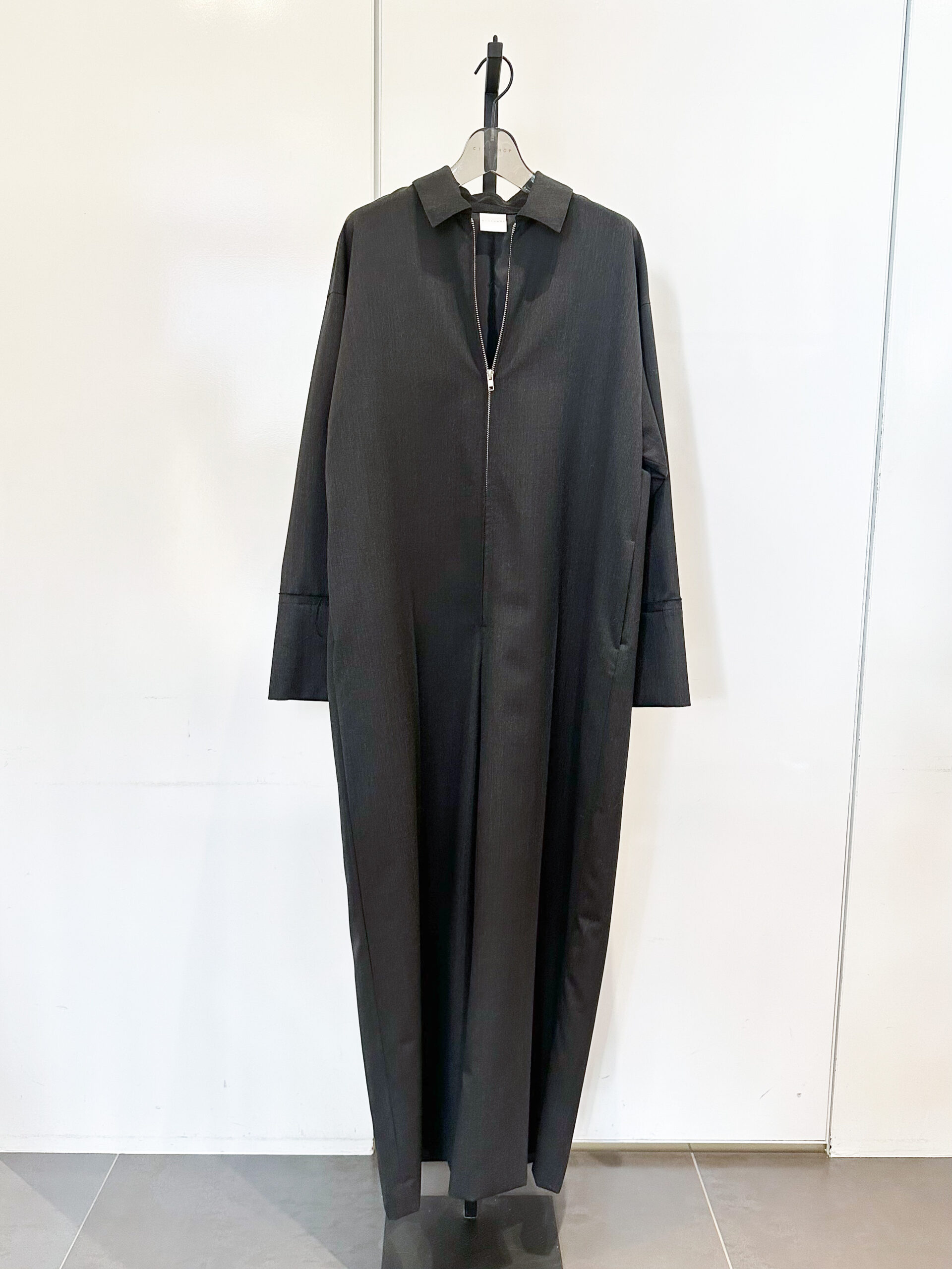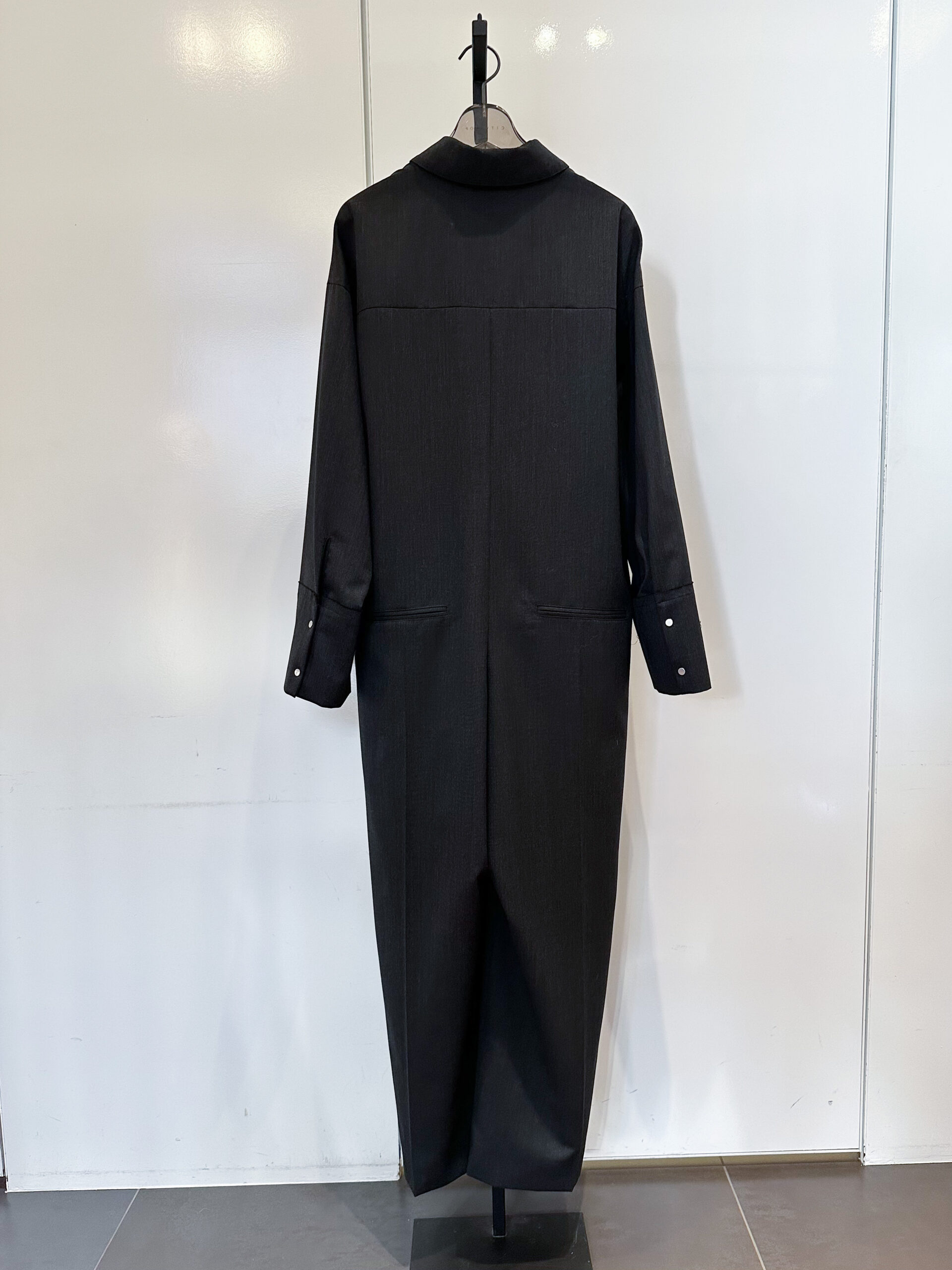 「同行スタッフ全員が『欲しい!』と声をそろえたのが、こちらのオールインワン。メンズスーツにも使われる、ほどよいハリと美しい艶をもつ梳毛素材を採用することで、カジュアルな印象のオールインワンをぐっと上質に昇華しました。キリッとしたストレートシルエットは、身体が入ることでむしろ女性らしさが際立つ絶妙なバランス。身幅も袖もゆとりがあるから、体型を選ばず着られるのも嬉しいポイントです。