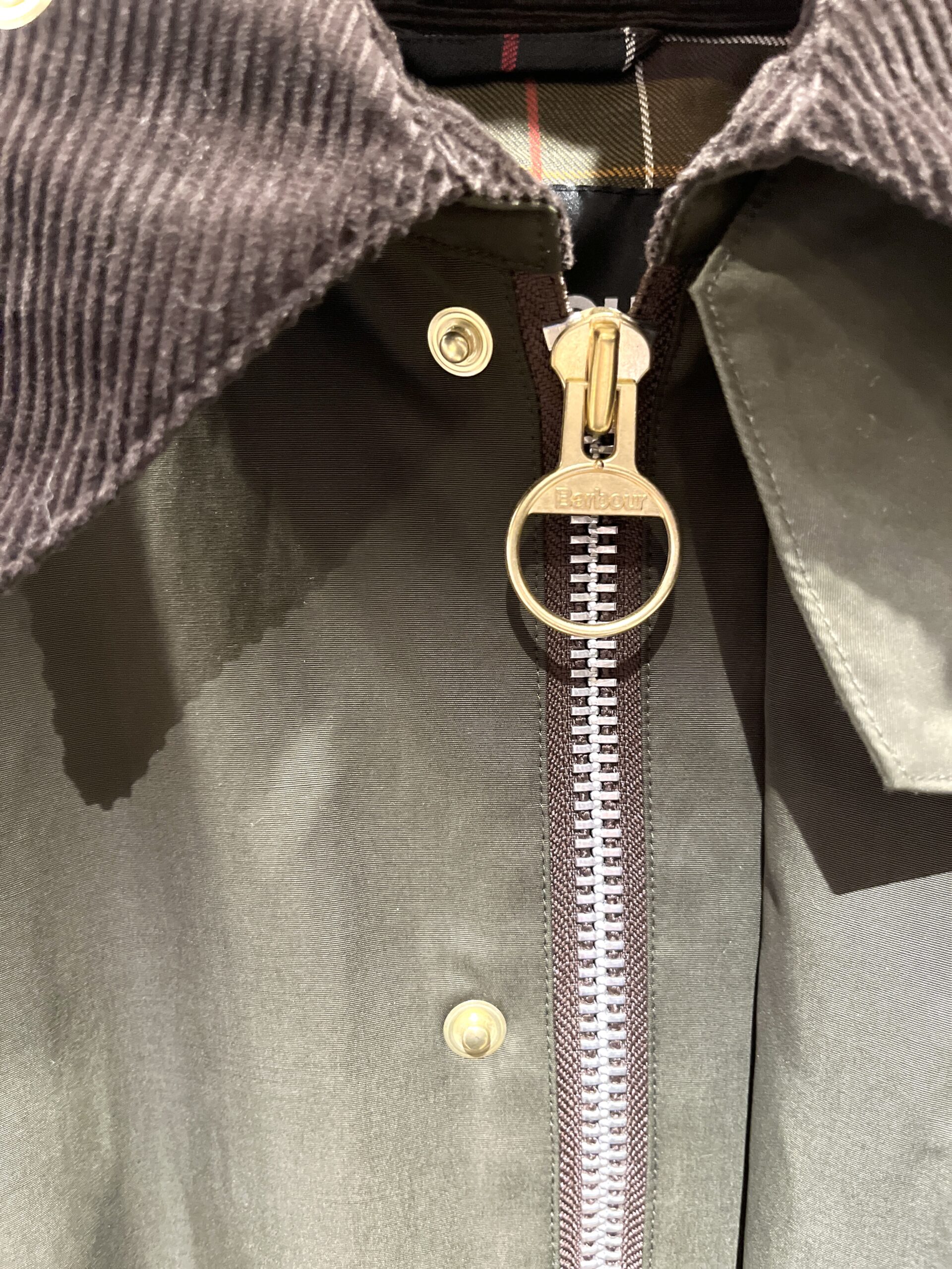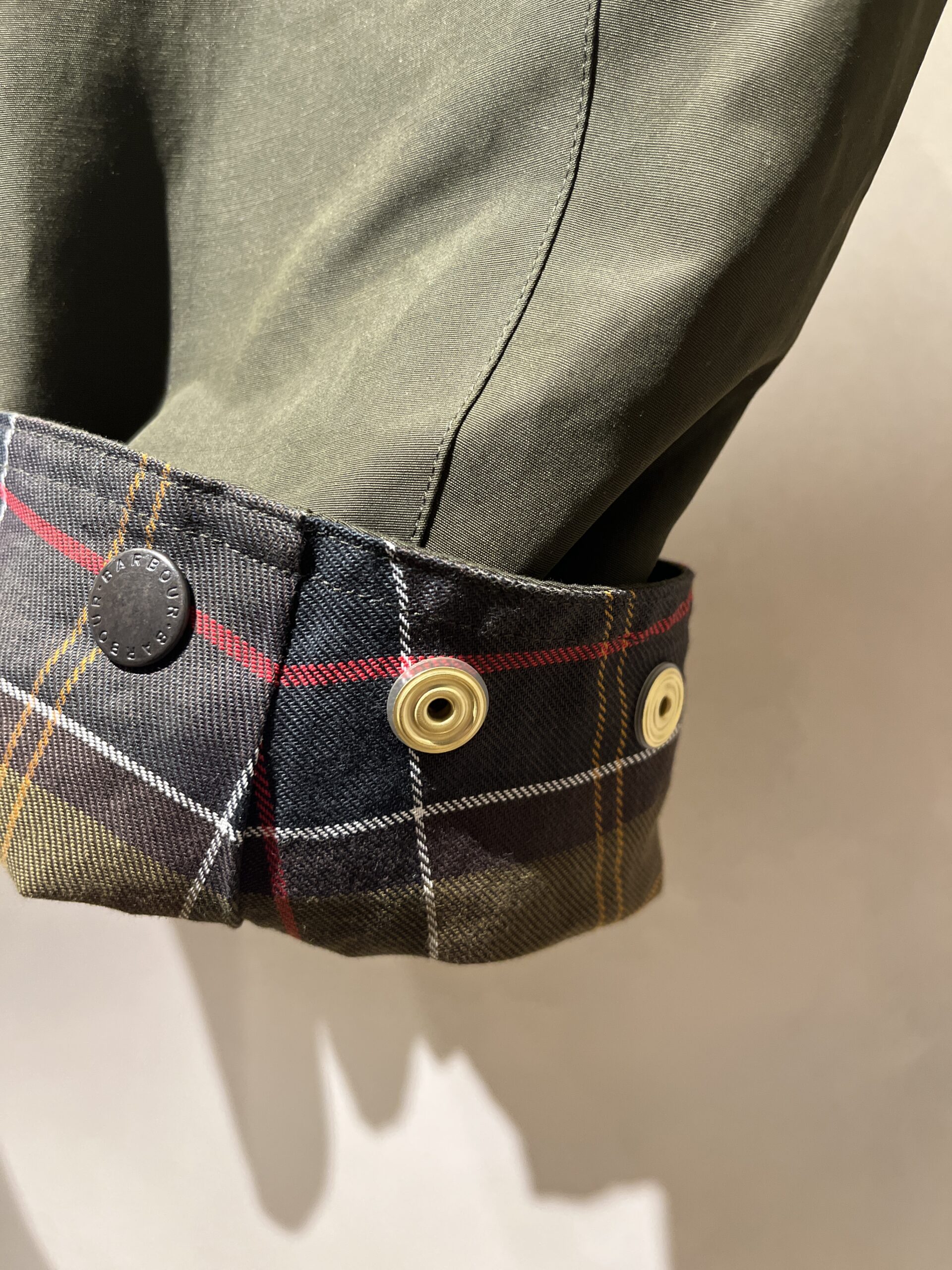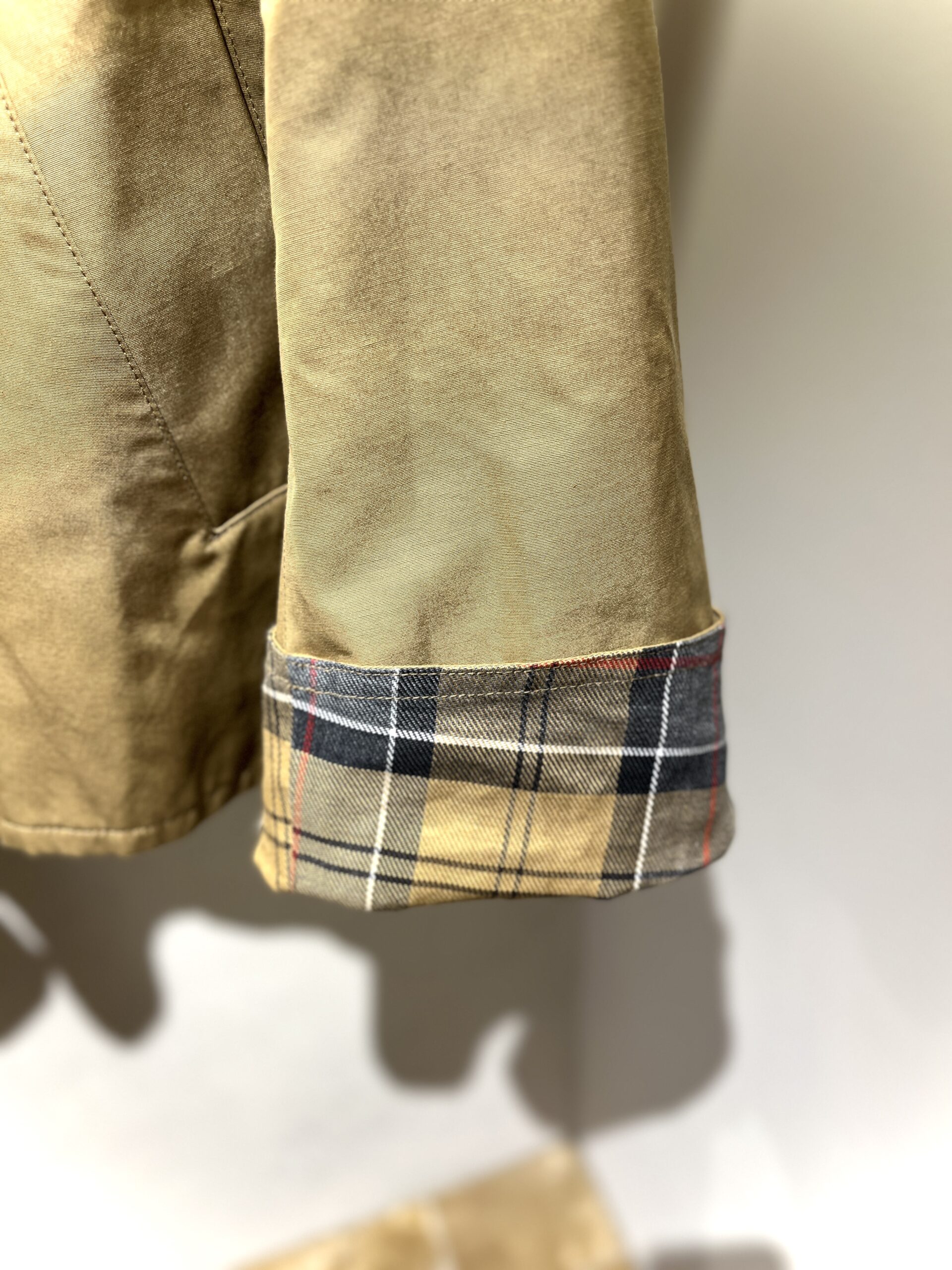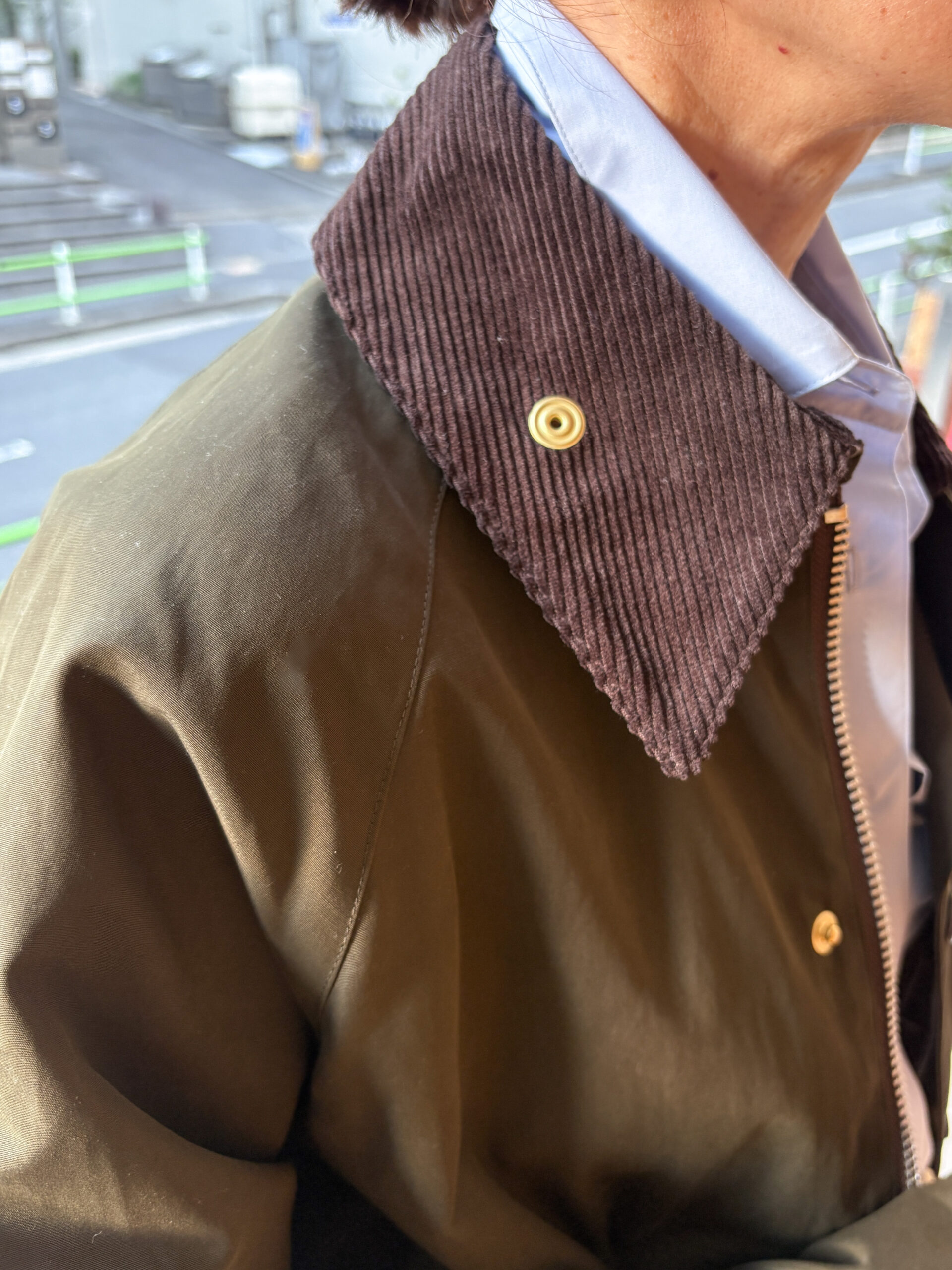 人気モデル『TRANSPORT』をベースに、『Curensology(カレンソロジー)』ならではのアレンジを効かせた、特別な一着。ショートレングス×ワイドフィットの特徴を活かしつつ、袖はよりワイドに、袖口はロールアップも楽しめるこだわりのアップデート。襟や裏地、パーツは『Barbour(バブアー)』の豊富なラインナップから、独自に組み合わせた別注デザイン。フロントジップとプルにはゴールドとシルバーのミックスを採用し、アクセサリーを選ばず大人の女性にも馴染む仕上がりになっています。カーキには“ブラック”、ベージュには“燻しゴールド”のヴィンテージ調ボタンがあしらわれ、装いに上品な深みを添えてくれます。