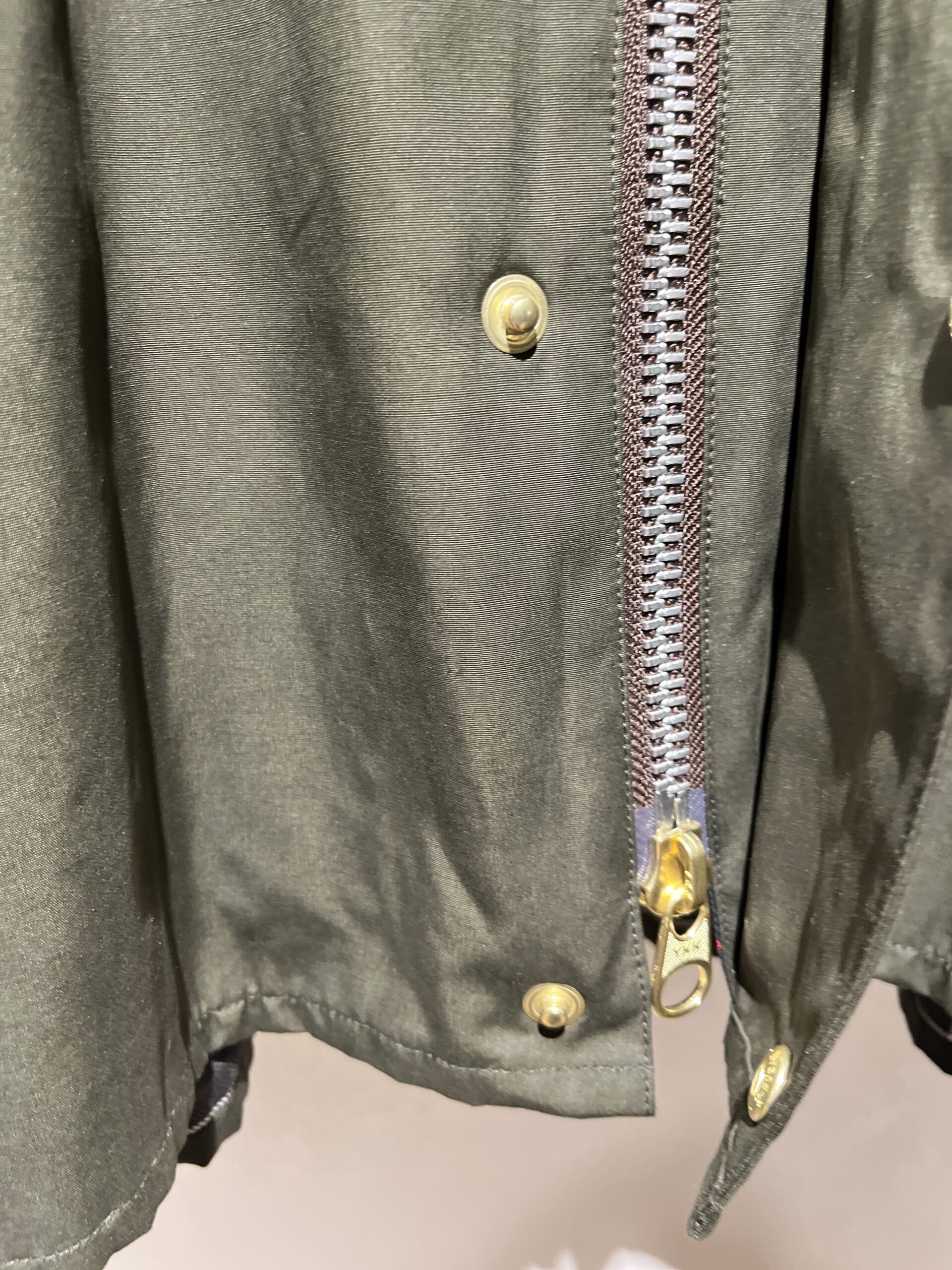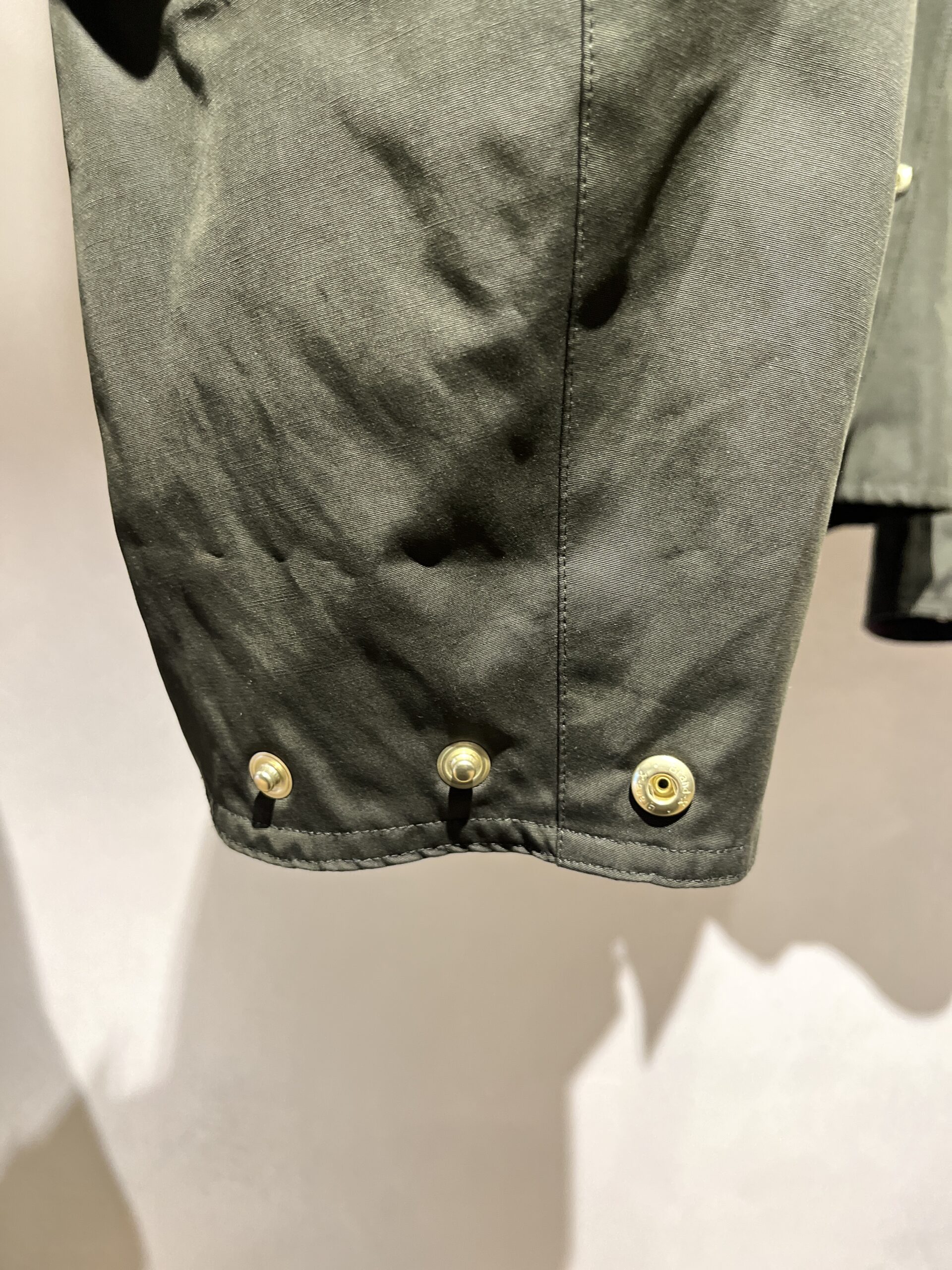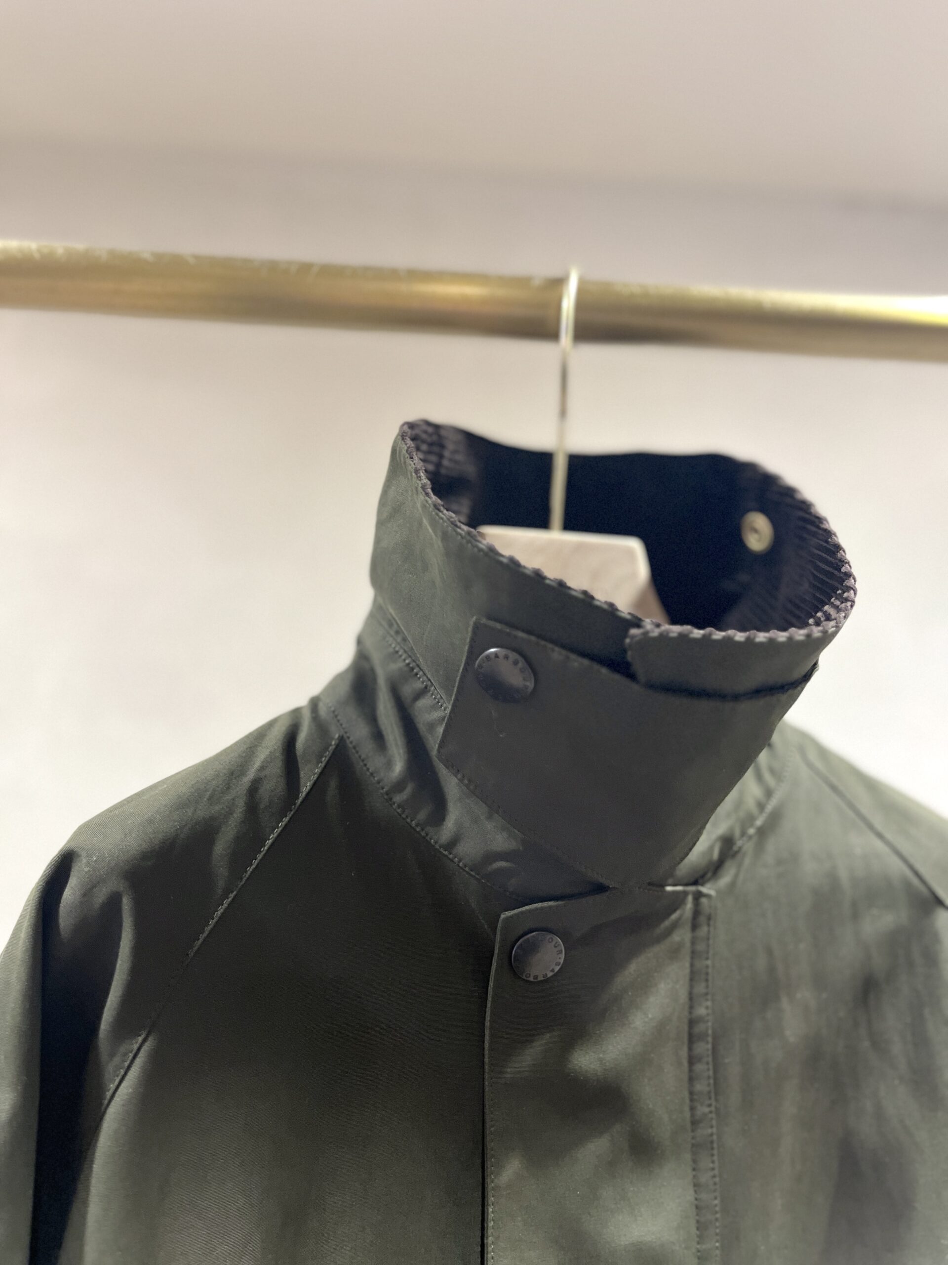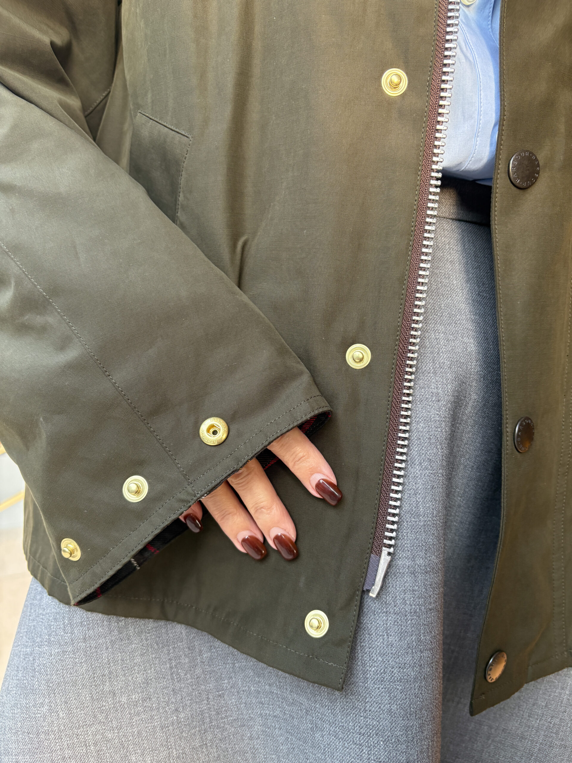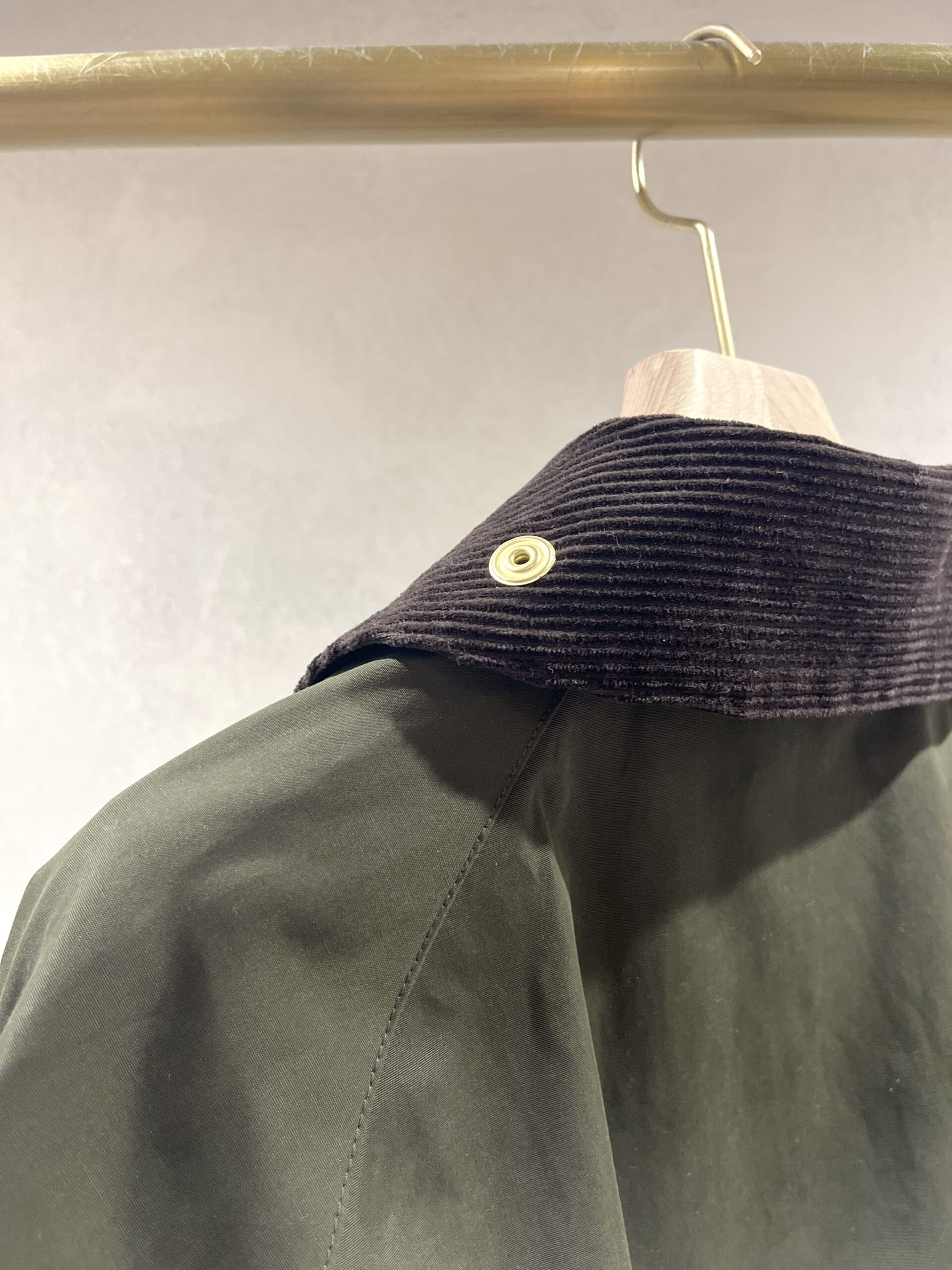 人気モデル『TRANSPORT』をベースに、『Curensology(カレンソロジー)』ならではのアレンジを効かせた、特別な一着。ショートレングス×ワイドフィットの特徴を活かしつつ、袖はよりワイドに、袖口はロールアップも楽しめるこだわりのアップデート。襟や裏地、パーツは『Barbour(バブアー)』の豊富なラインナップから、独自に組み合わせた別注デザイン。フロントジップとプルにはゴールドとシルバーのミックスを採用し、アクセサリーを選ばず大人の女性にも馴染む仕上がりになっています。カーキには“ブラック”、ベージュには“燻しゴールド”のヴィンテージ調ボタンがあしらわれ、装いに上品な深みを添えてくれます。